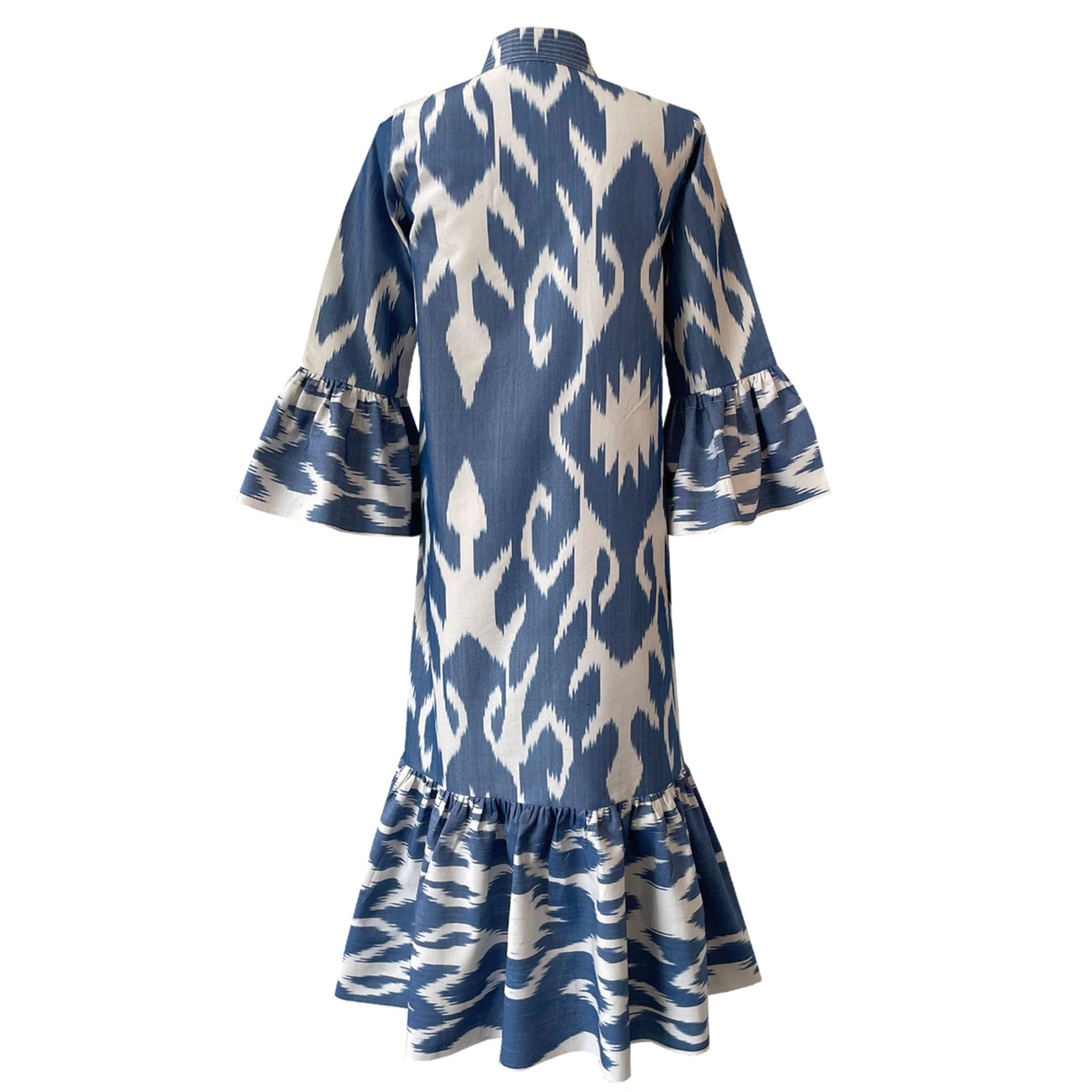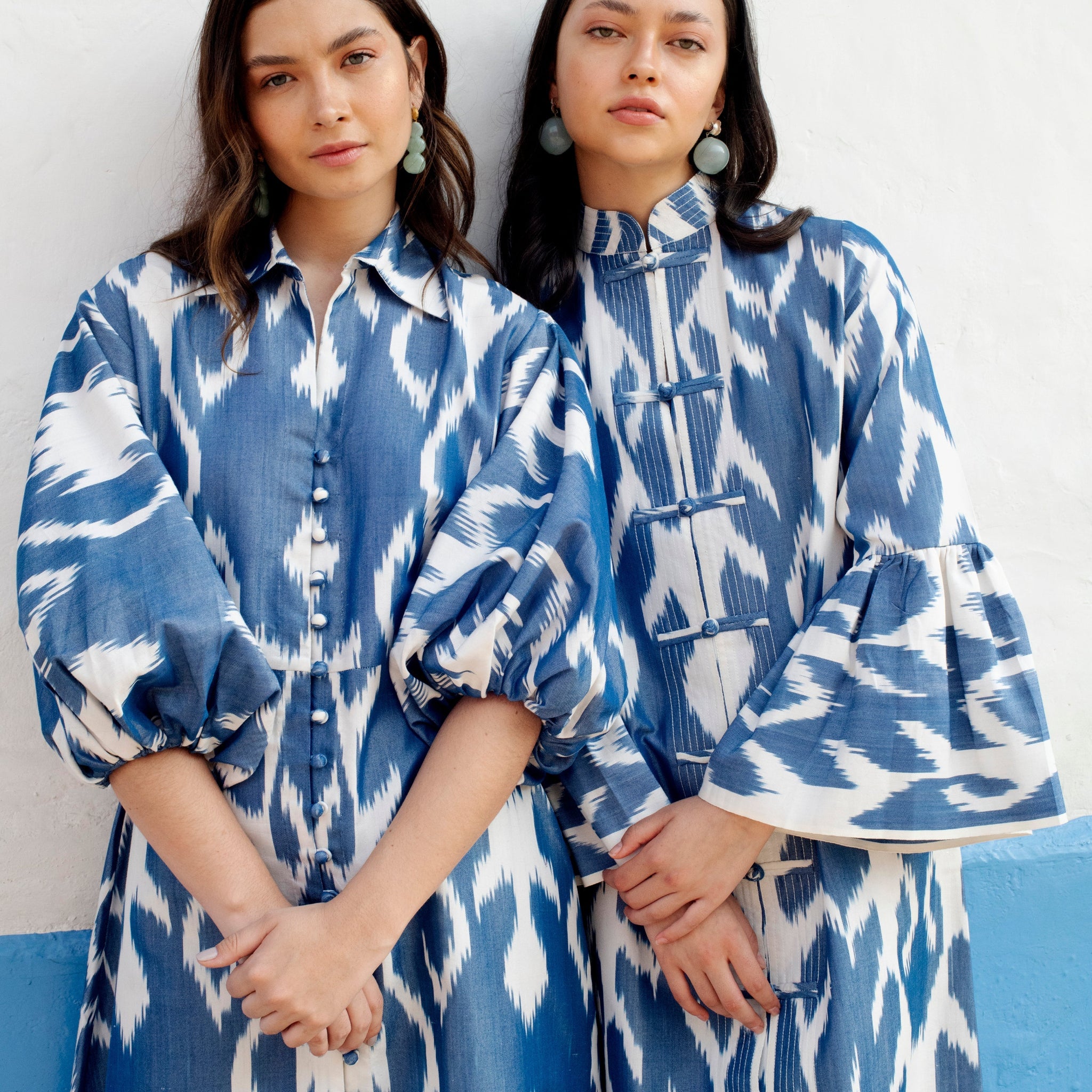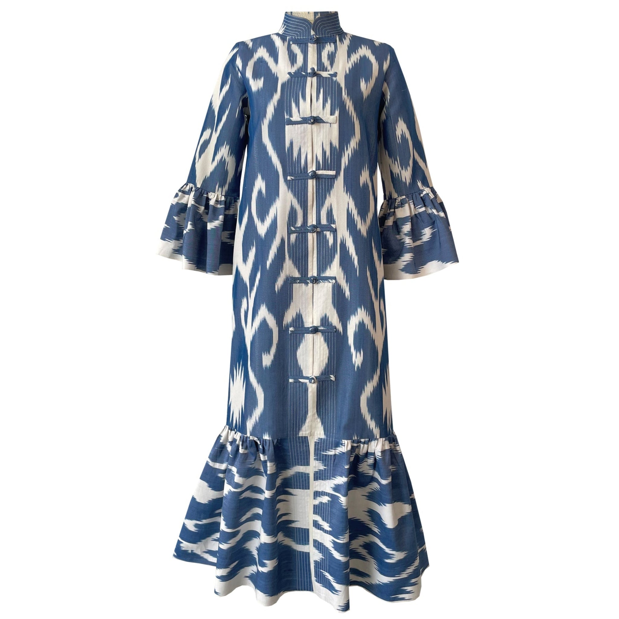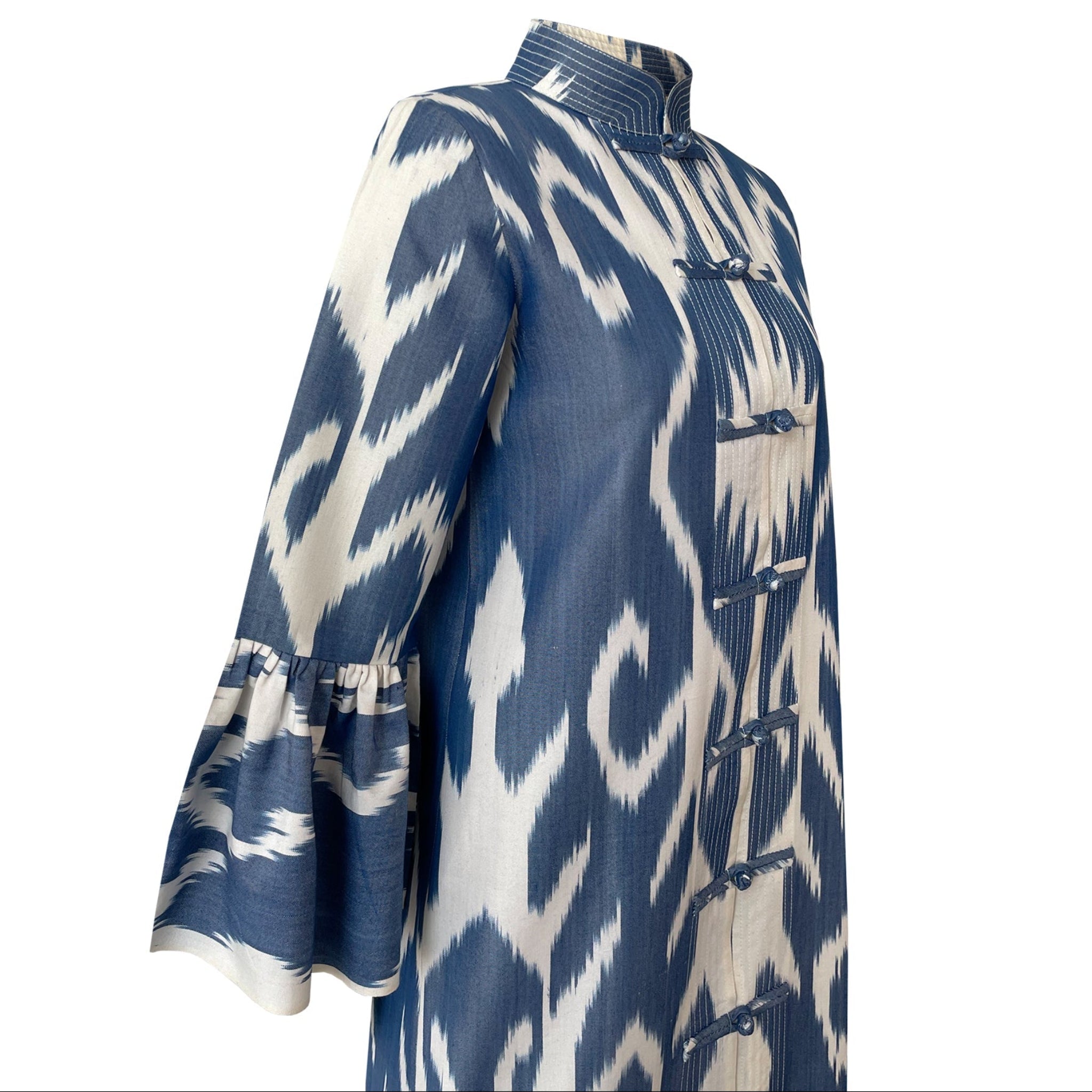 This exquisite dress draws inspiration from ancient Chinese apparel. Expertly crafted from authentic Uzbek silk Ikat, it boasts a sleek, straight silhouette and is adorned with delicate Chinese knot buttons, a Nehru collar, and flared sleeves and hem.