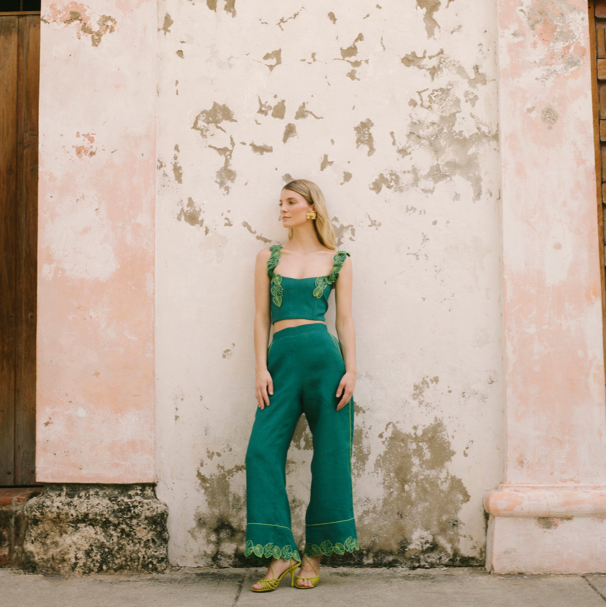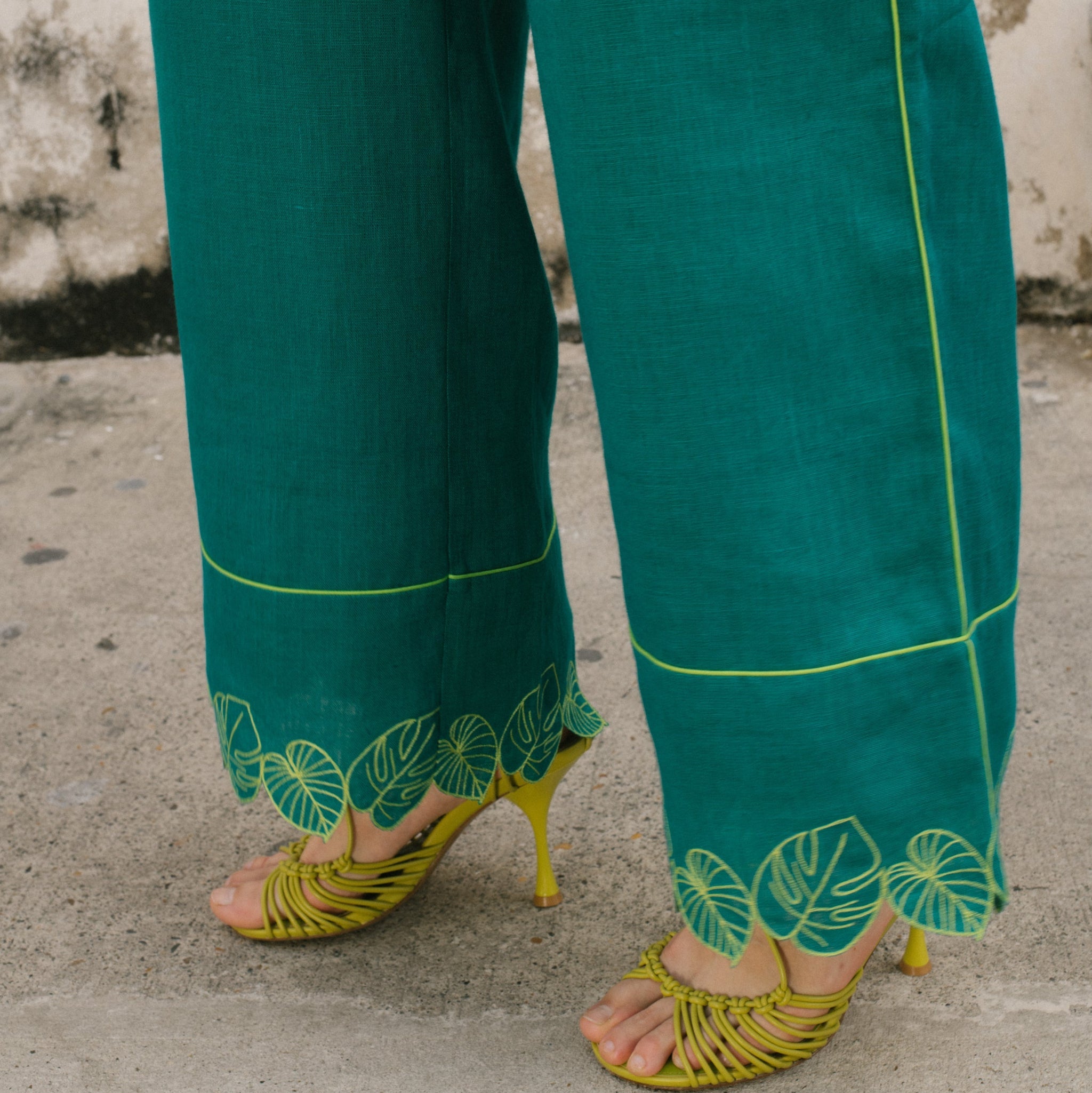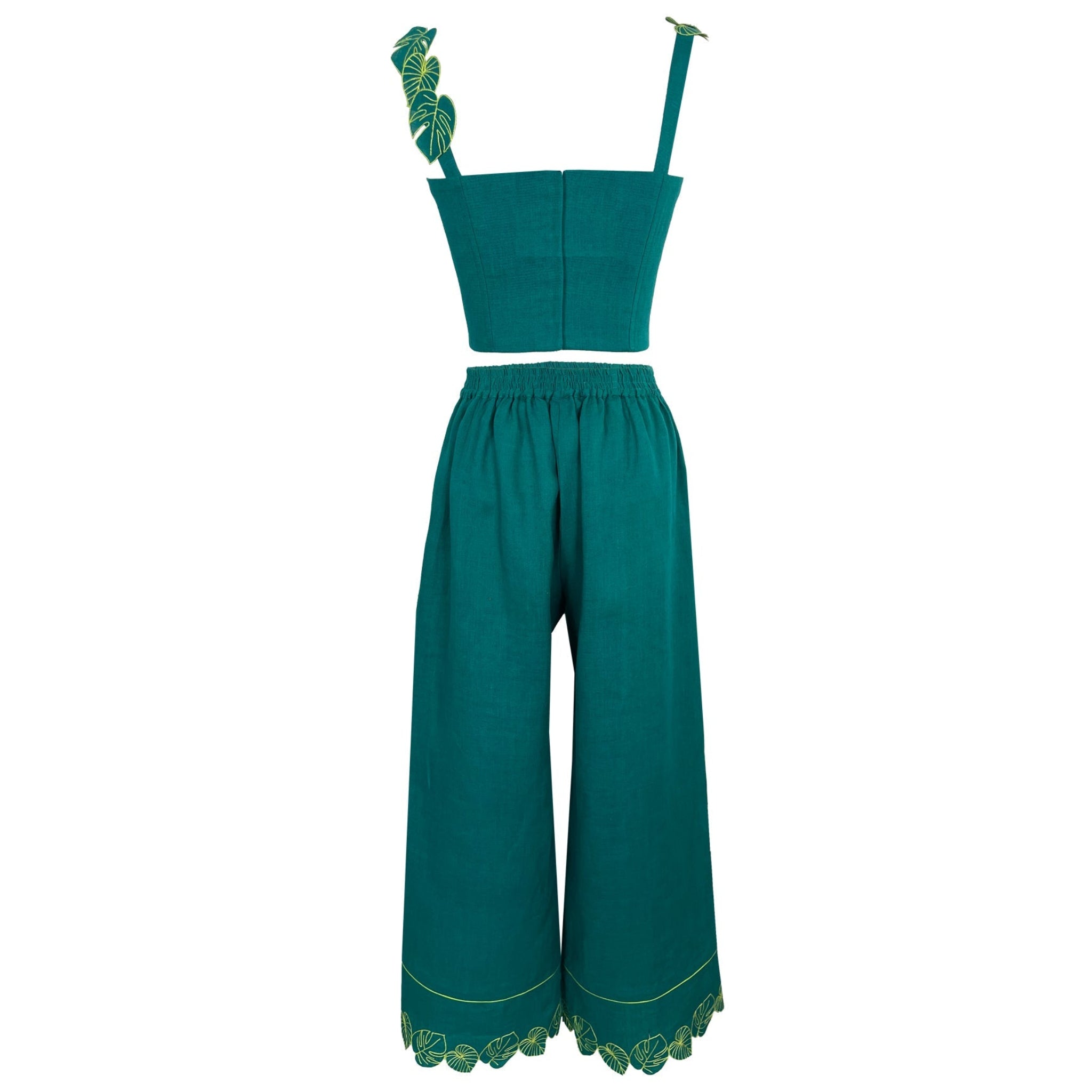 The Monstera Set is crafted from exquisite linen sourced from South India, featuring a sleeveless Crop top and elastic trousers for effortless movement. The trousers also include convenient pockets and an elastic waist for a comfortable fit, enhanced by boning on the sides and intricate embroidered detailing. The top boasts a slight V strapless neckline adorned with monstera patch embroidery on the straps, all meticulously handmade by skilled artisans for a touch of sophistication to this high-end ensemble. It is elegantly fastened at the back with hooks.