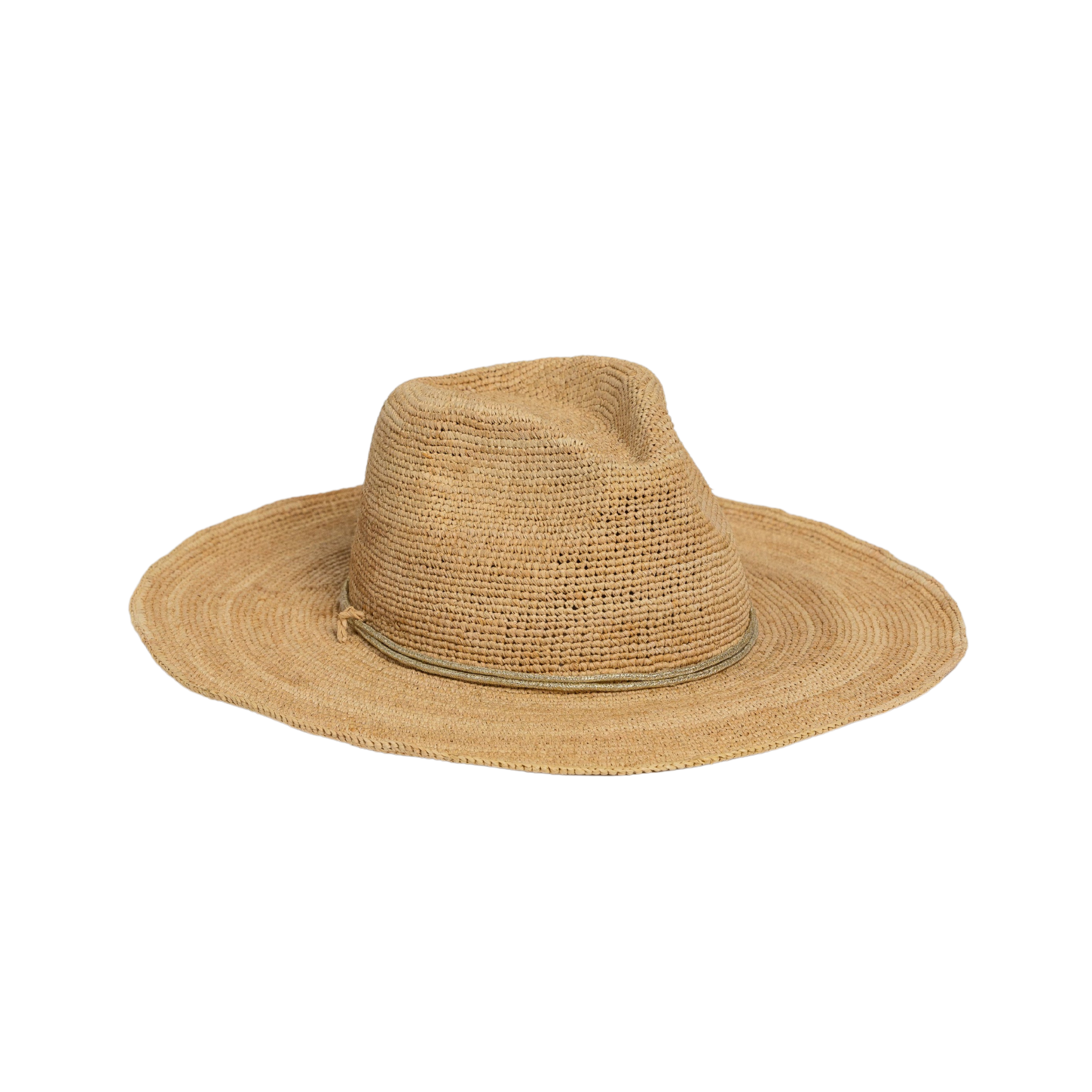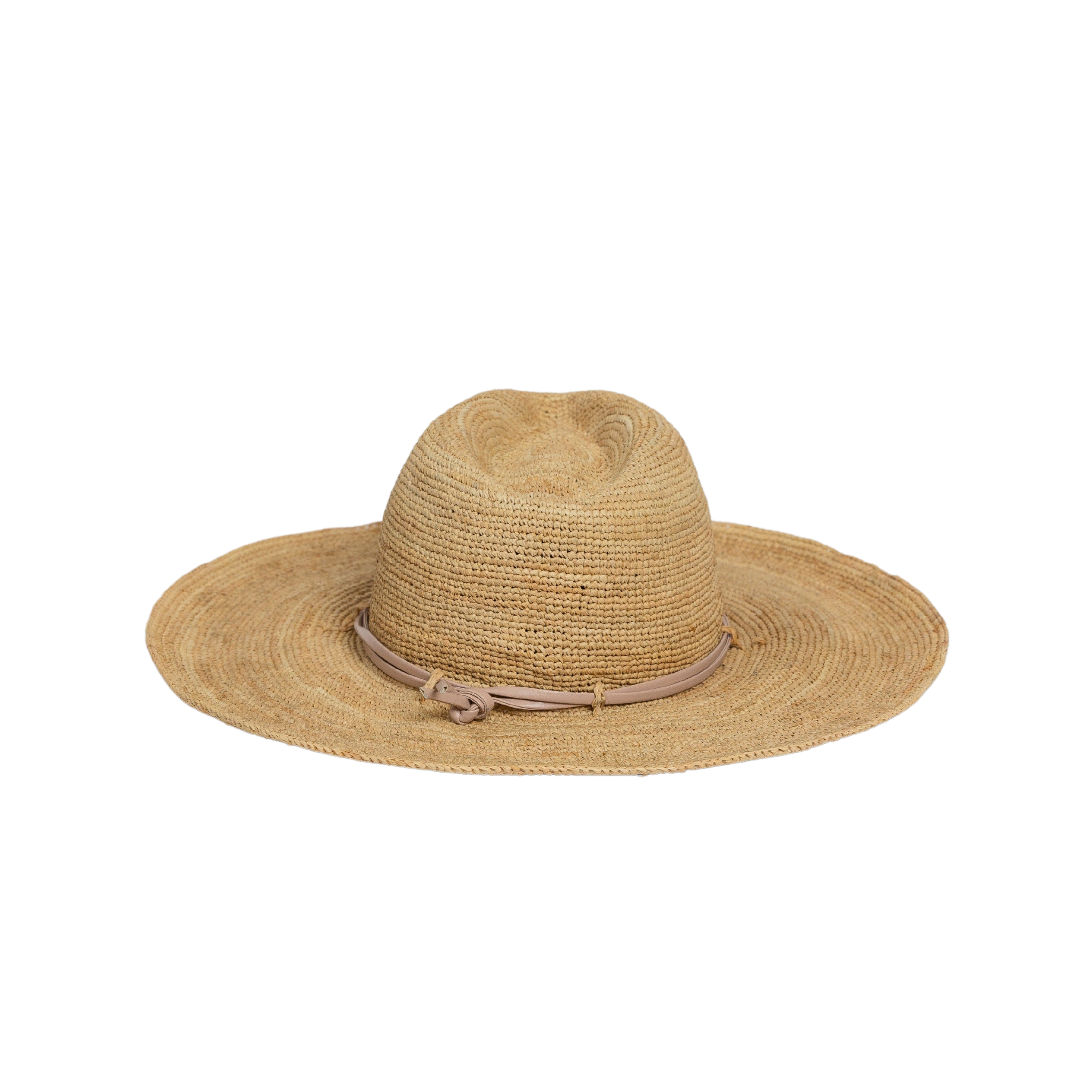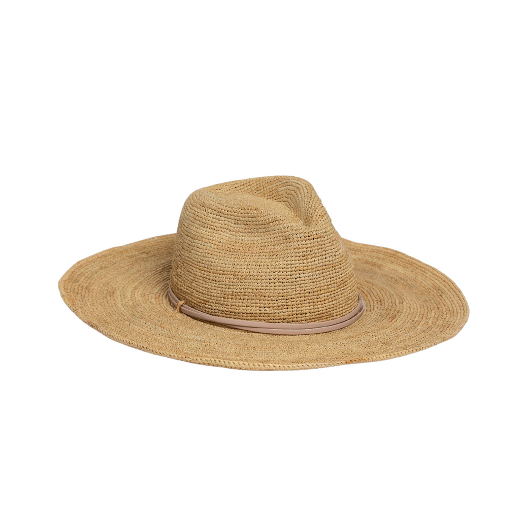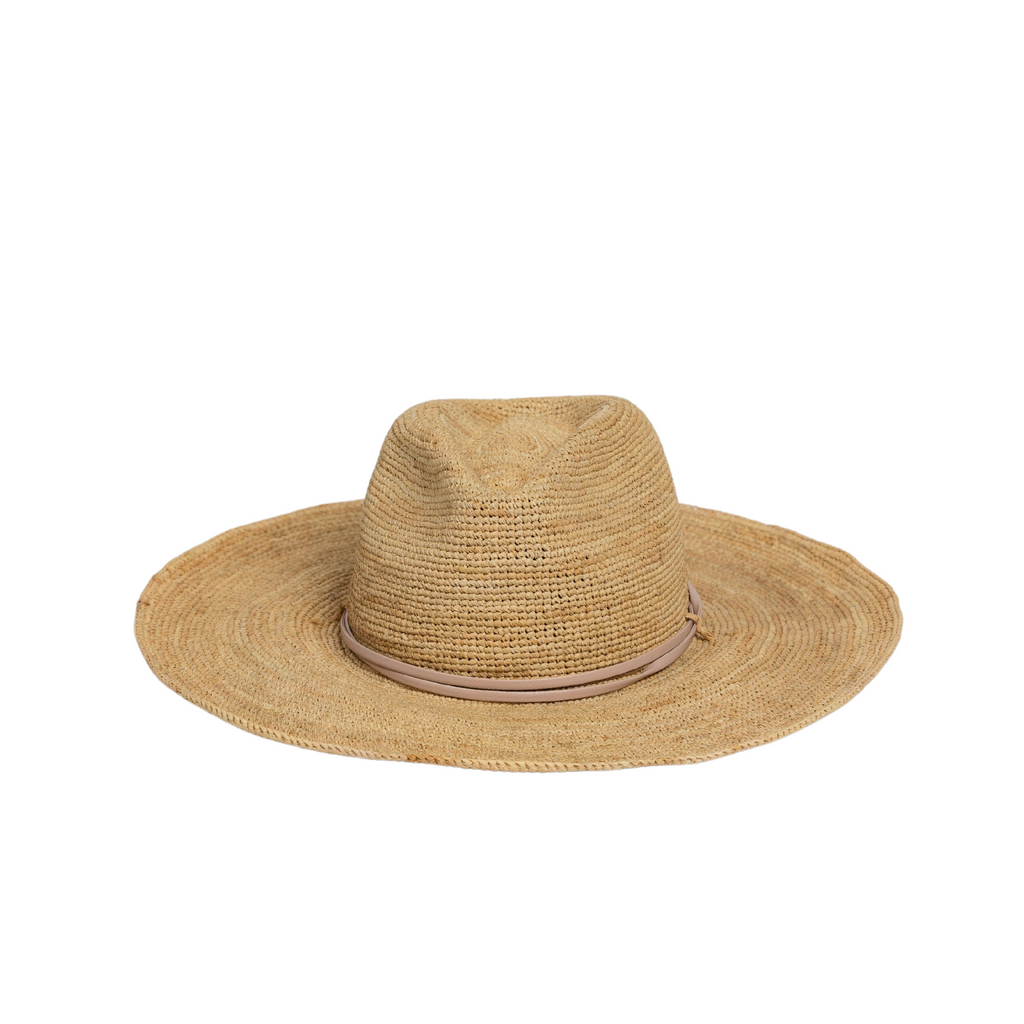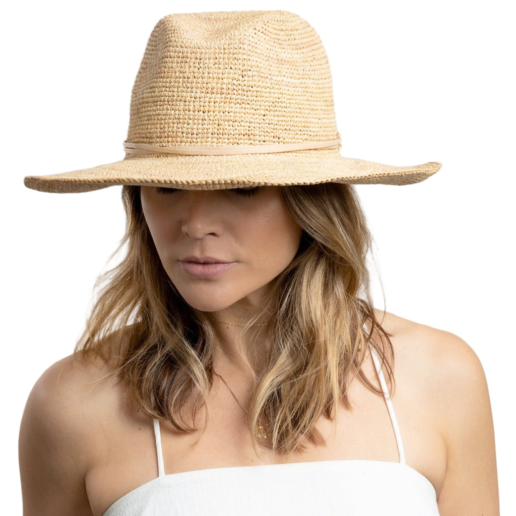 This textured continental hat is a staple for your summer hat collection! Crocheted raffia hat is trimmed in tan PU leather detail and has an adjustable sweatband for the perfect fit.