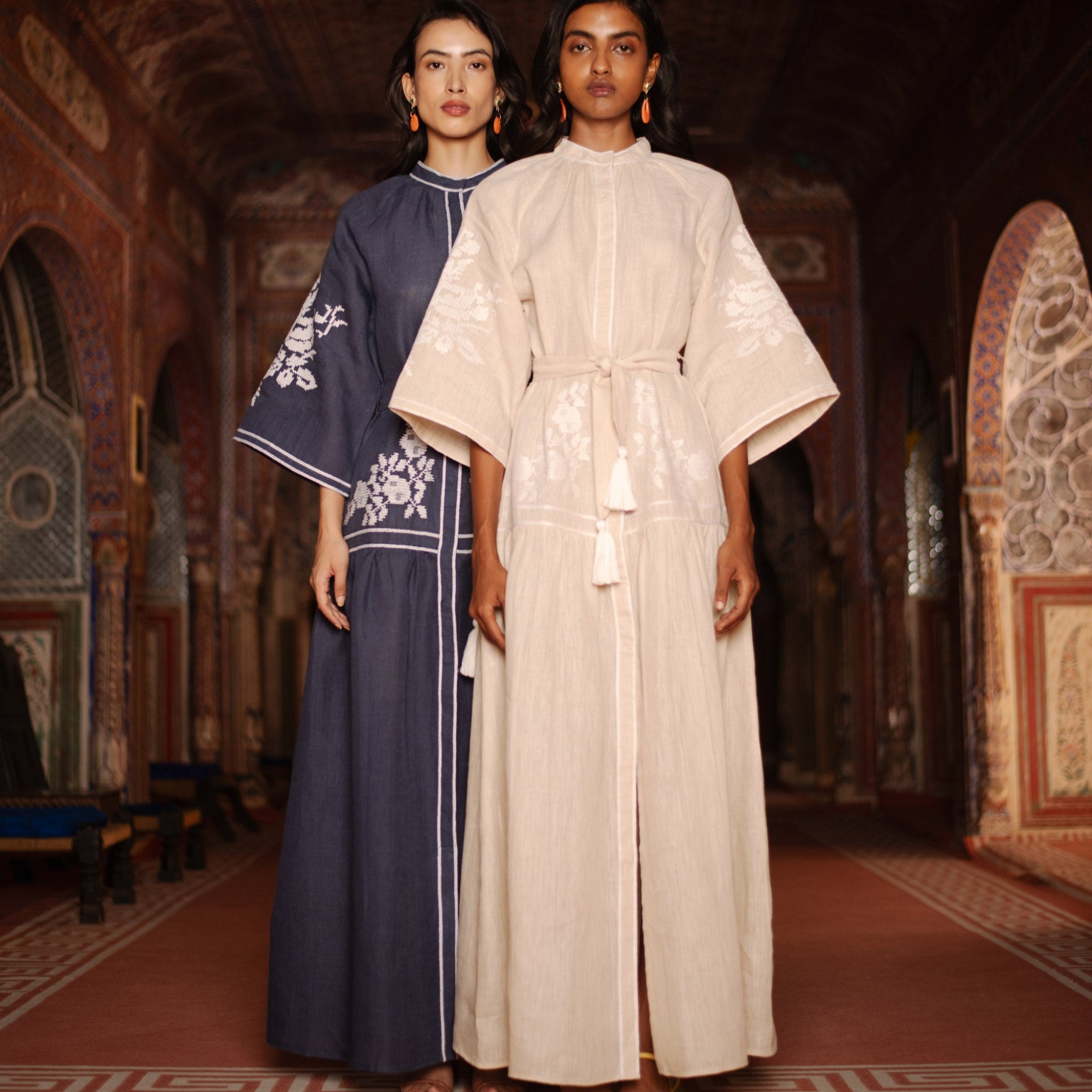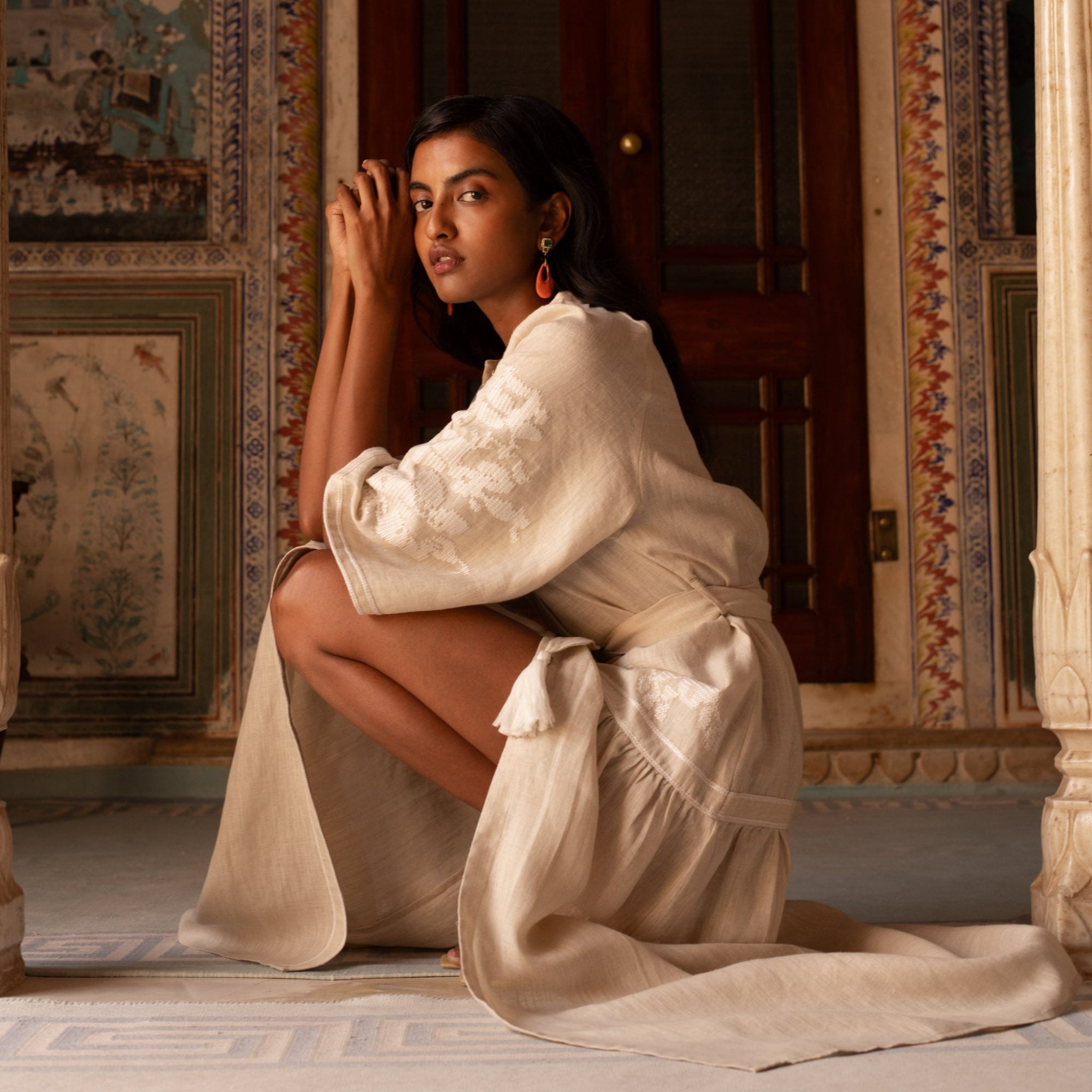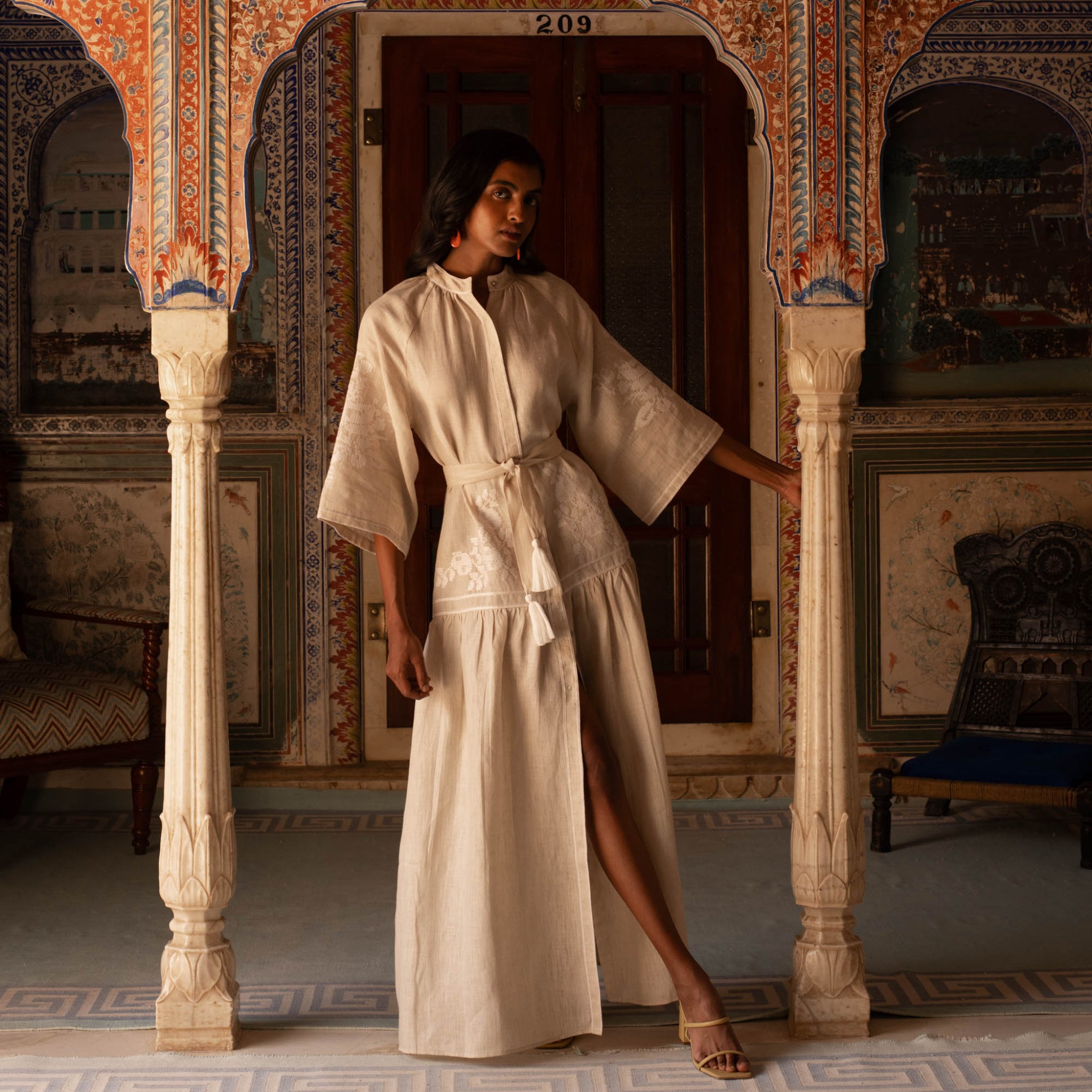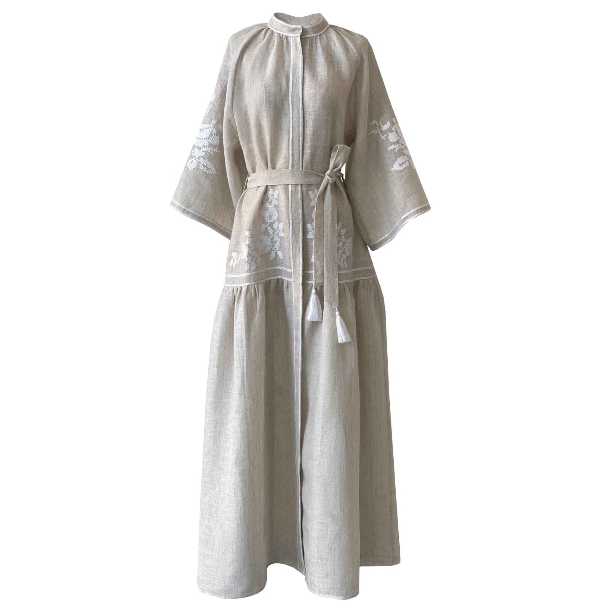 The Swan is made in natural coloured linen from the South of India. It features white embroidery, hidden front buttons, bell shaped raglan sleeves and tasseled belt.