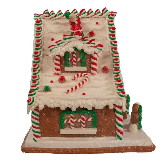 Add a fun, classic touch to your holiday décor with this 10.5" Battery-Operated Light Up Santa's Workshop Gingerbread House from Kurt Adler. "Santa's Workshop" features a gingerbread store festively decorated with candy-inspired detailing, white glittered snow and is battery-operated, requiring 3 AAA batteries not included. It comes with 1 warm white 5mm LED bulb that illuminates the interior and exterior of the workshop, giving it a warm and cozy appearance. The piece also features miniature figurines of Santa Claus and his elves, adding an extra touch of holiday cheer to the display. This charming decoration is sure to bring some holiday cheer to any room or tabletop.