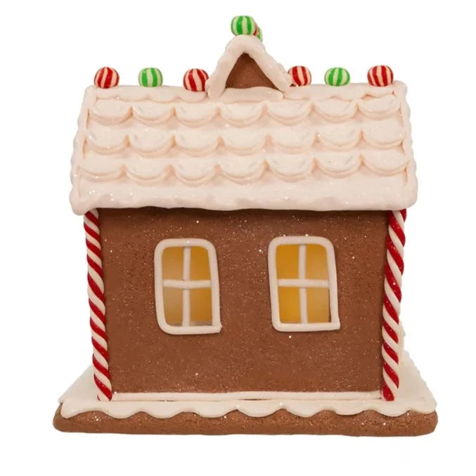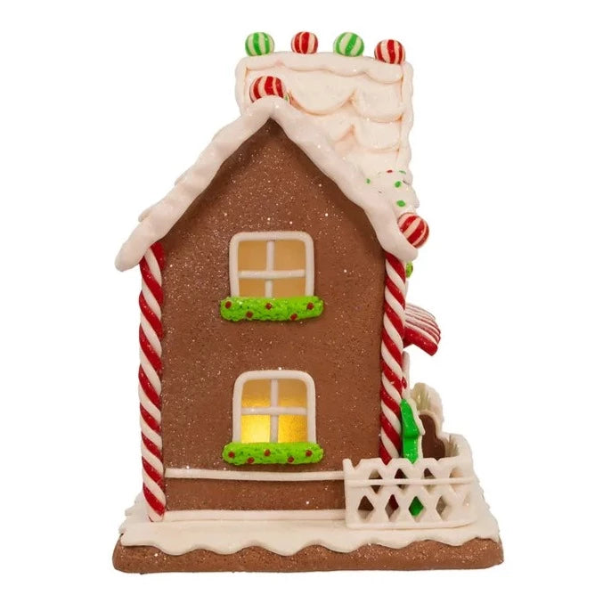 Add a sweet touch to your holiday décor with this 9" Battery-Operated Light Up Two Floor Gingerbread House from Kurt Adler. Its beautifully detailed mansion-style design features candy cane and icing detailing, it is glittered for a sugared effect and each window is decorated with a holly and berry planter. This house is illuminated from within by 1 warm white 5mm LED, giving it a warm and cozy appearance. It has intricate details and is designed to look like a festive holiday dwelling. The gingerbread house is battery-operated, requiring 3 AA batteries, not included. This charming decoration is sure to bring some holiday cheer to any room or tabletop.