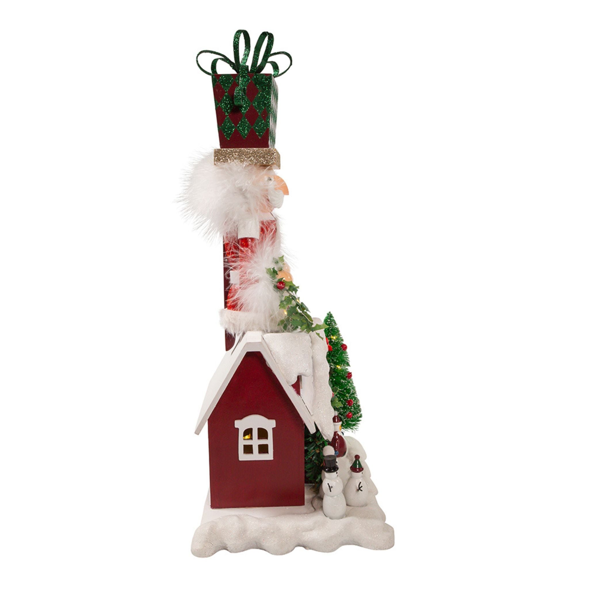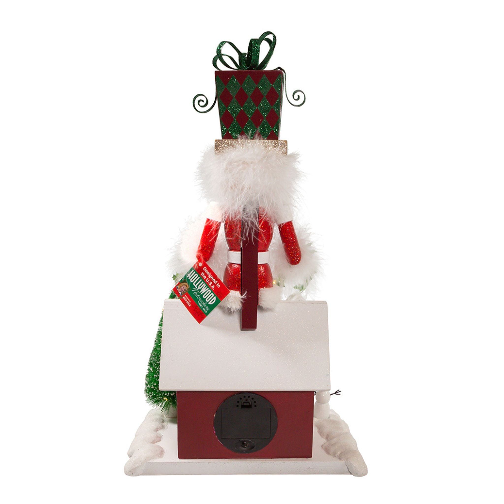 Hollywood Nutcrackers™ is a whimsical collection of nutcrackers that features an assortment of designs that put a unique, vibrant, memorable twist on traditional nutcrackers. This 18-inch battery-operated LED musical nutcracker is a festive addition to any home or office holiday decor. It features a red, white and green glittered nutcracker holding a lighted strand of holly and berries atop a snow-covered house with a snowman family and Santa/ When switched on warm white LED lights illuminate the piece and the tune "Deck The Halls" plays.