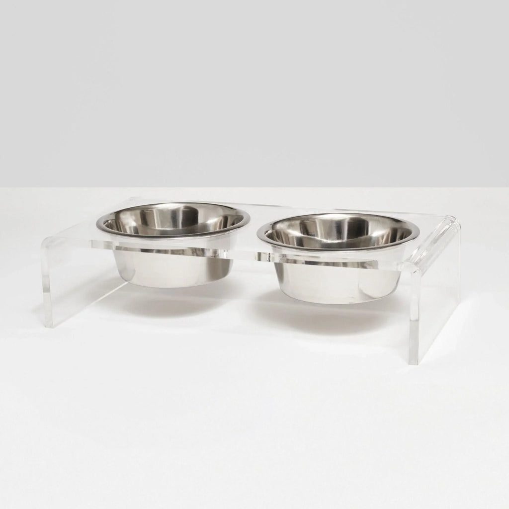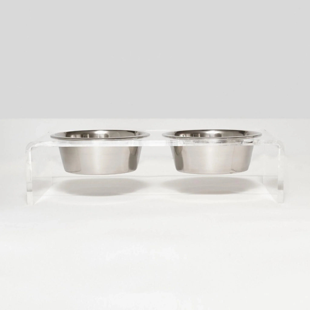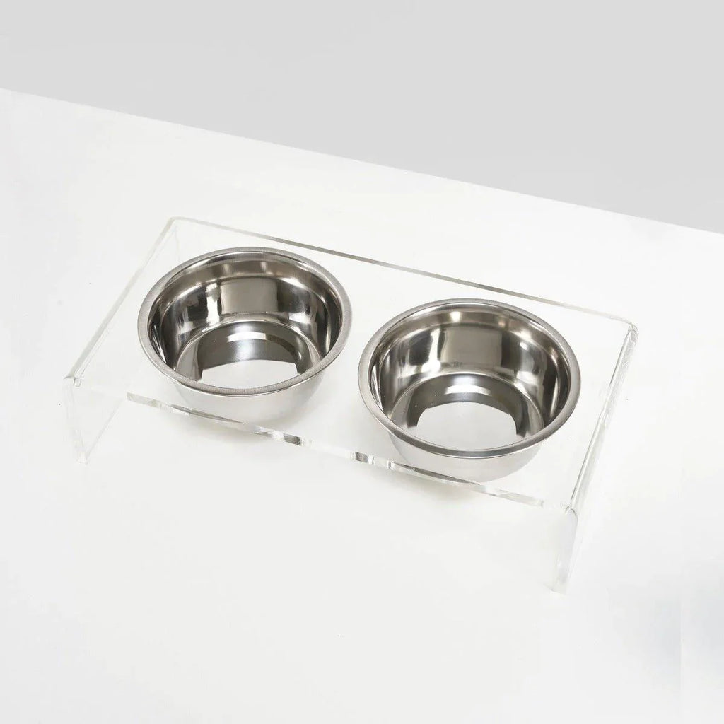Our Large Clear Double Dog Bowl Feeder with Silver Bowls is a modern 3/8" thick lucite feeding stand with lead-free, stainless steel metal bowls. The raised acrylic feeder provides an ergonomically correct eating position and gives the sleek metal bowls a floating effect.