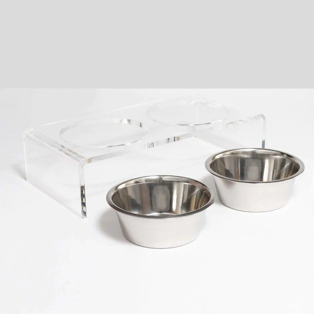 - Includes: 2 lead-free, stainless steel bowls and an acrylic stand