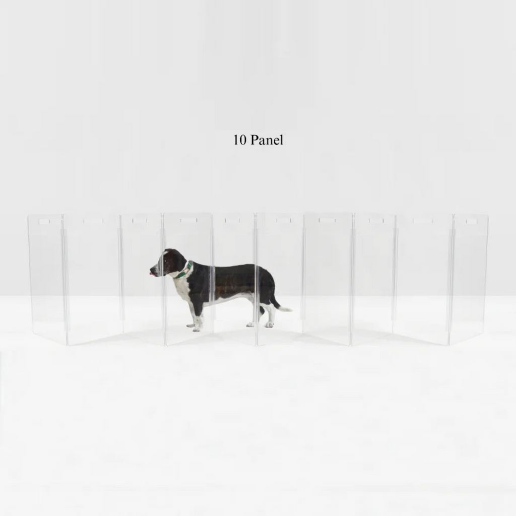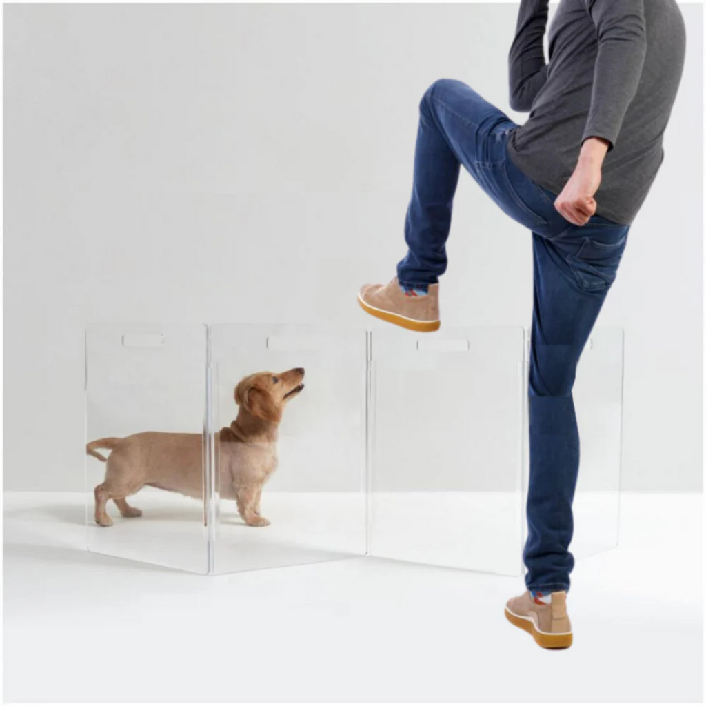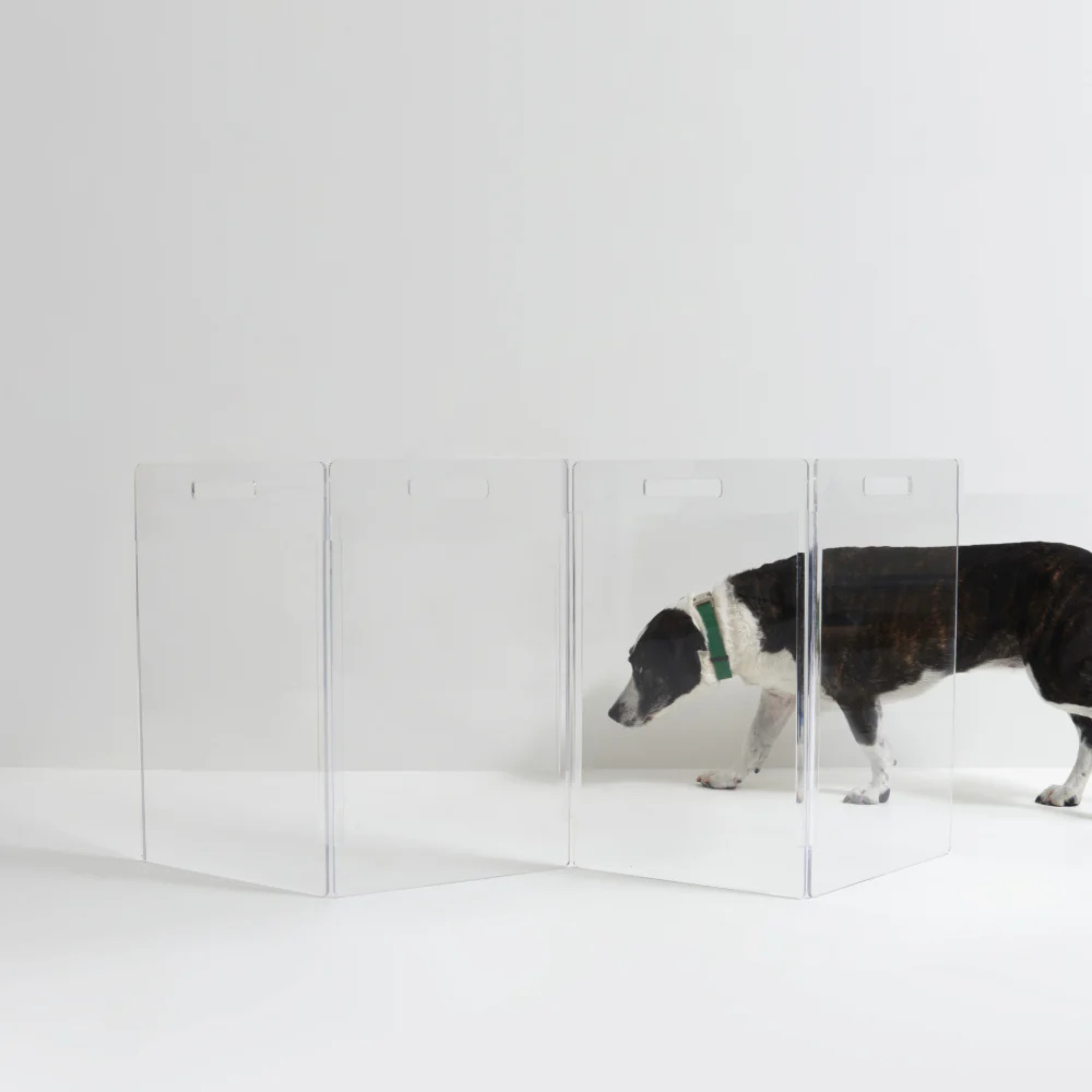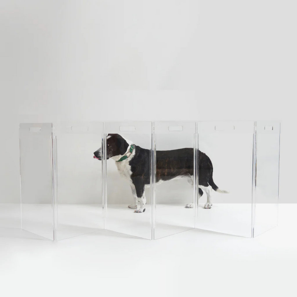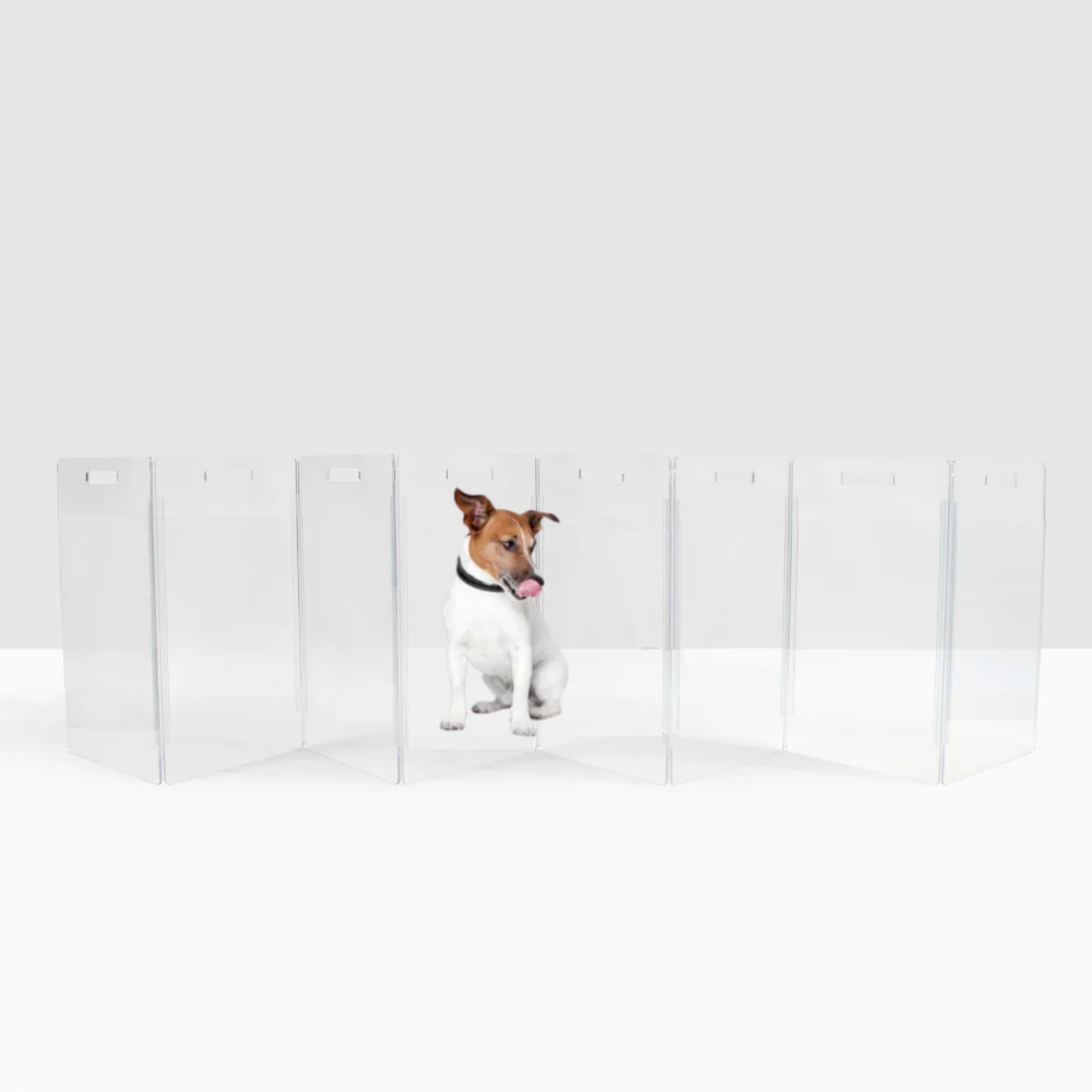 Hiddin's Low Freestanding Zig Zag Pet Gate is your alternative to the unattractive wood or metal pet gates that are unsightly and cumbersome. Our 24" high, adjustable pet gate is designed to confine your pet safely in areas with larger openings and is perfect for home or travel. Lightweight and easy to move, this sturdy, lucite pet gate can withstand a dog's nudge. Simply position the clear folding gate in your doorway, with the end panels resting against the pet's side of the threshold.