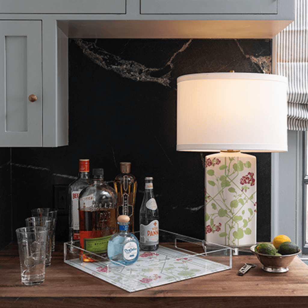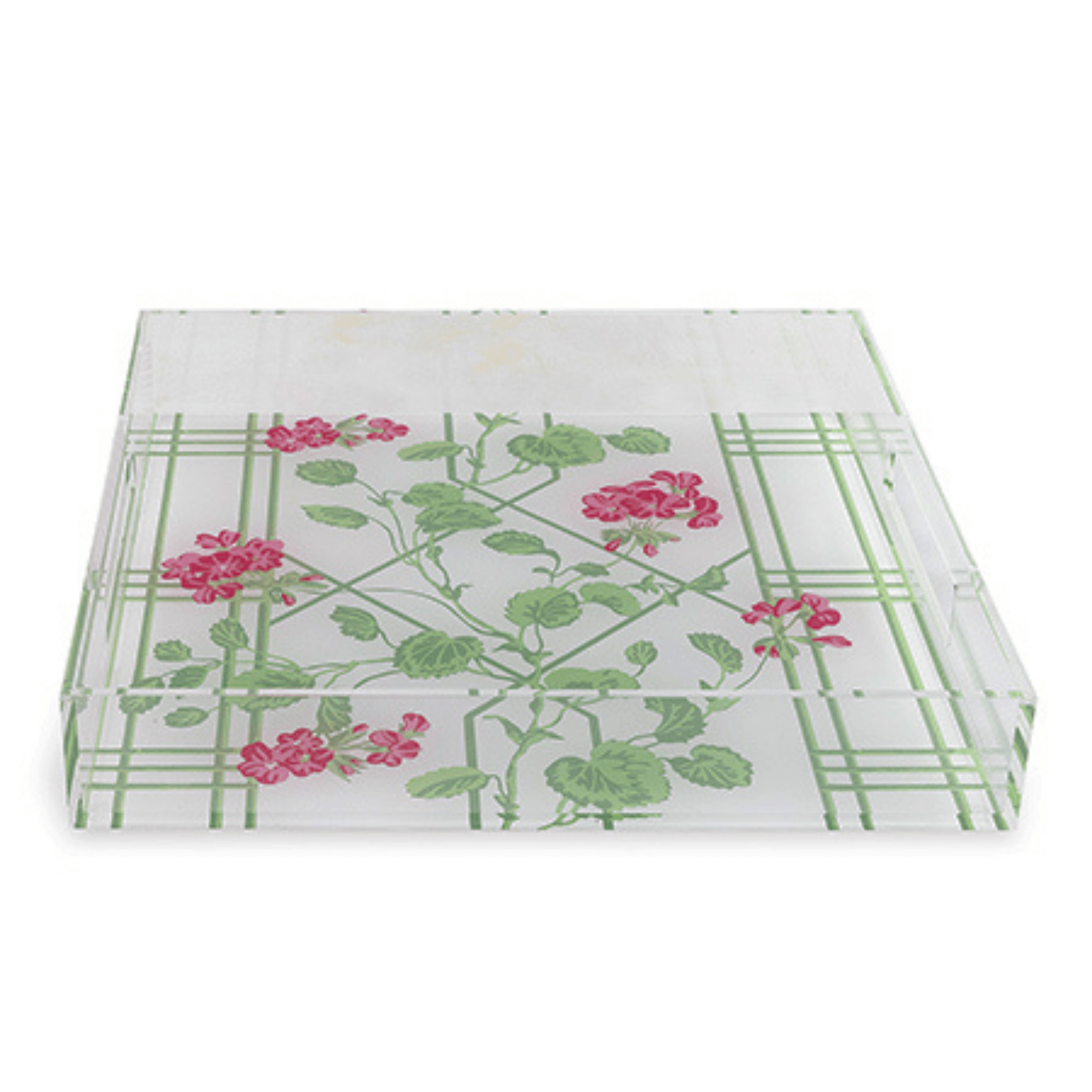 The Geranium Trellis pattern is inspired from a 19th century wallpaper fragment in the Colonial Williamsburg collection. The square lucite tray has the pattern silkscreened on the underside of the bottom. Side cut out handles. Measures: 2.5"H x 15"W x 15"DClick images for greater detail.