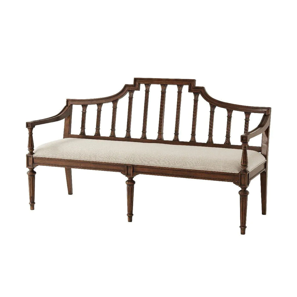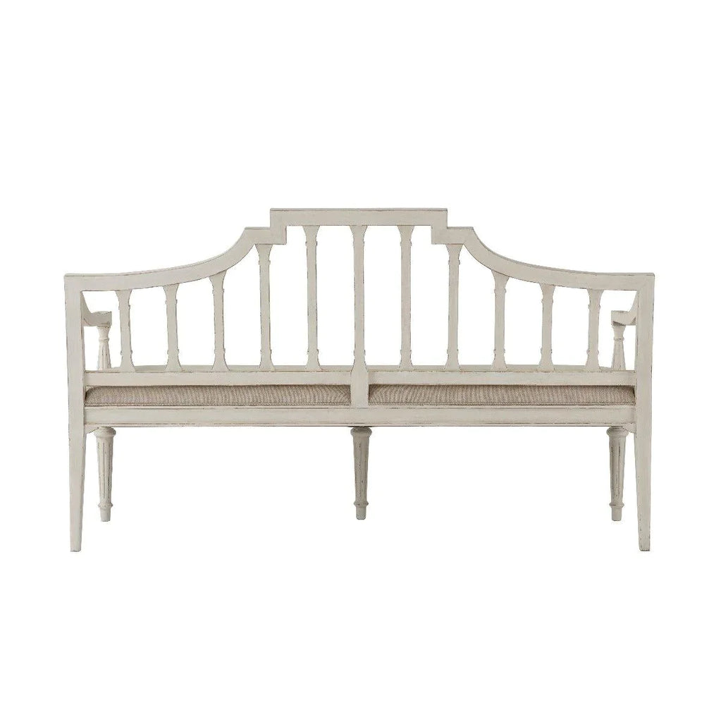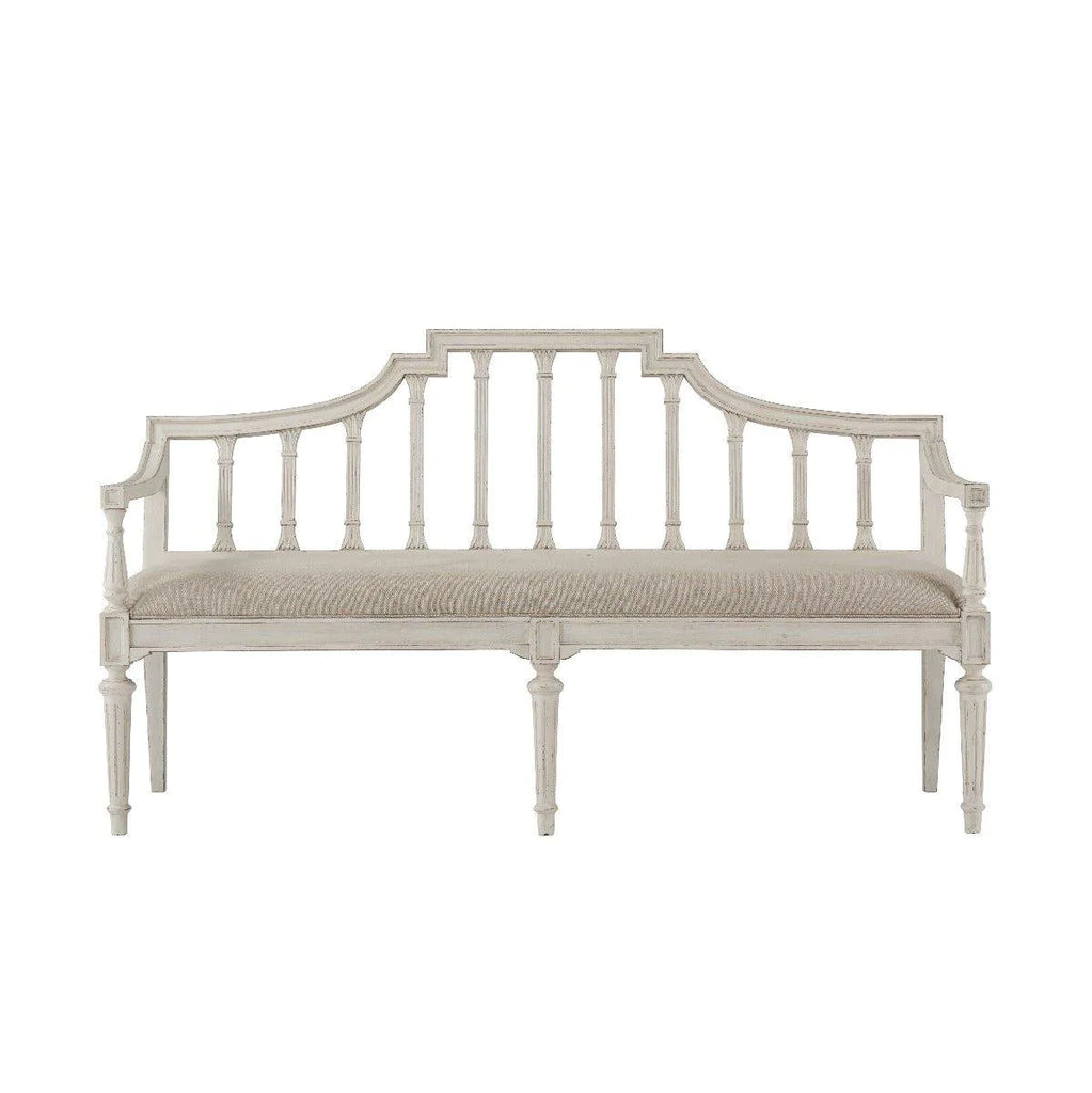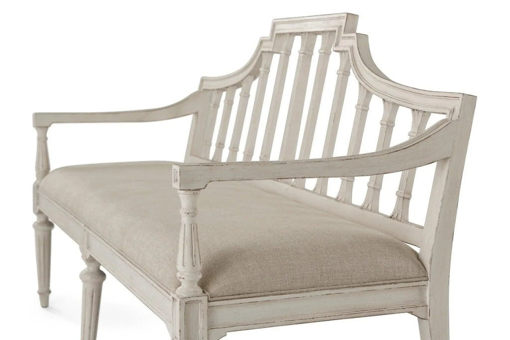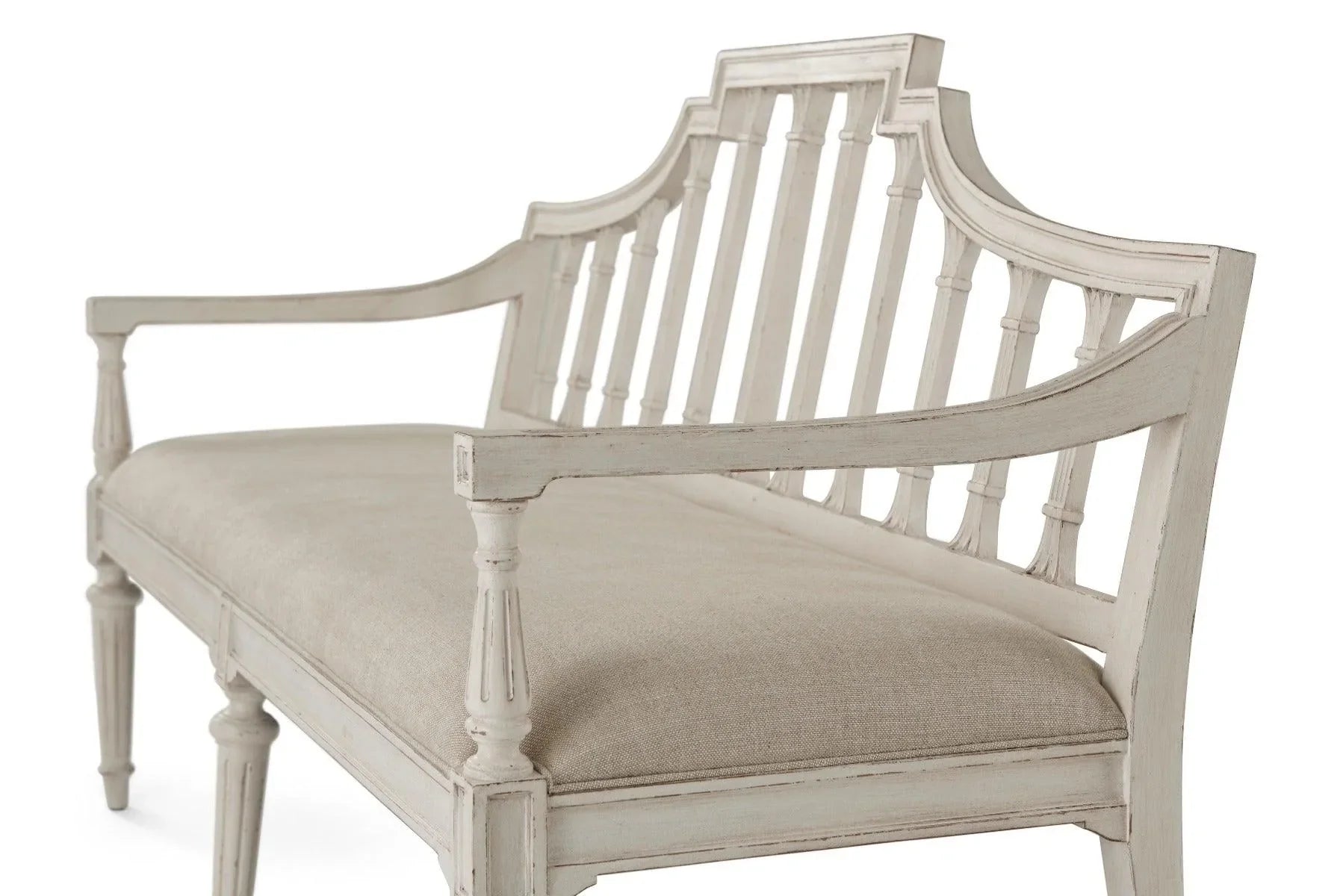 This hand-carved beech settee features a molded angular arched back rail with fluted slats and downswept arms over fluted baluster supports and turned and fluted tapered legs. Pictured in distressed white finish and oatmeal upholstery and is available in two distressed finishes. Please select your option from above.