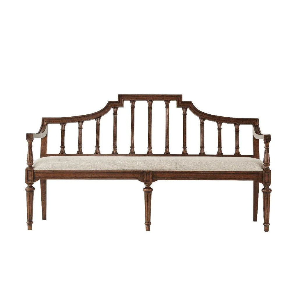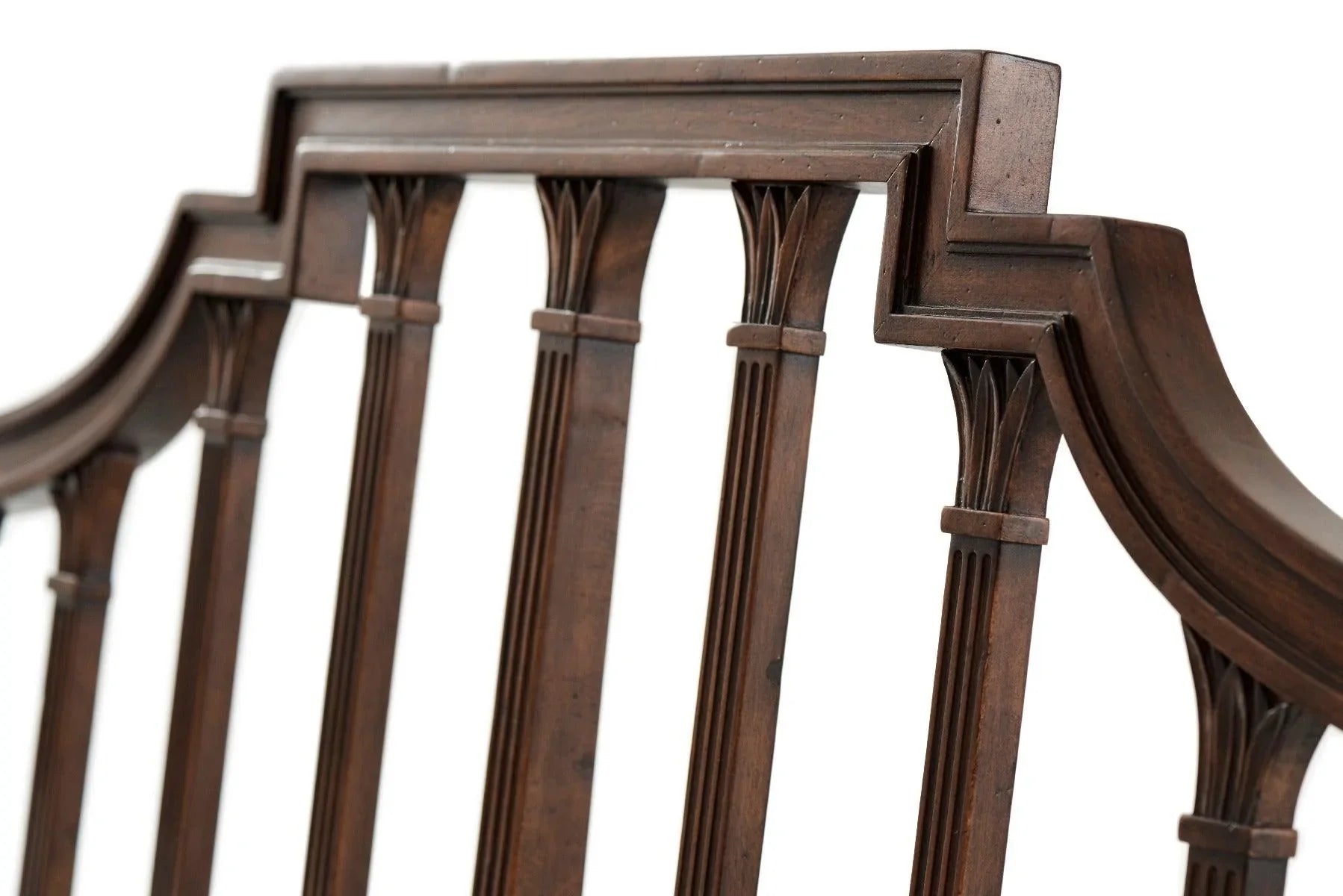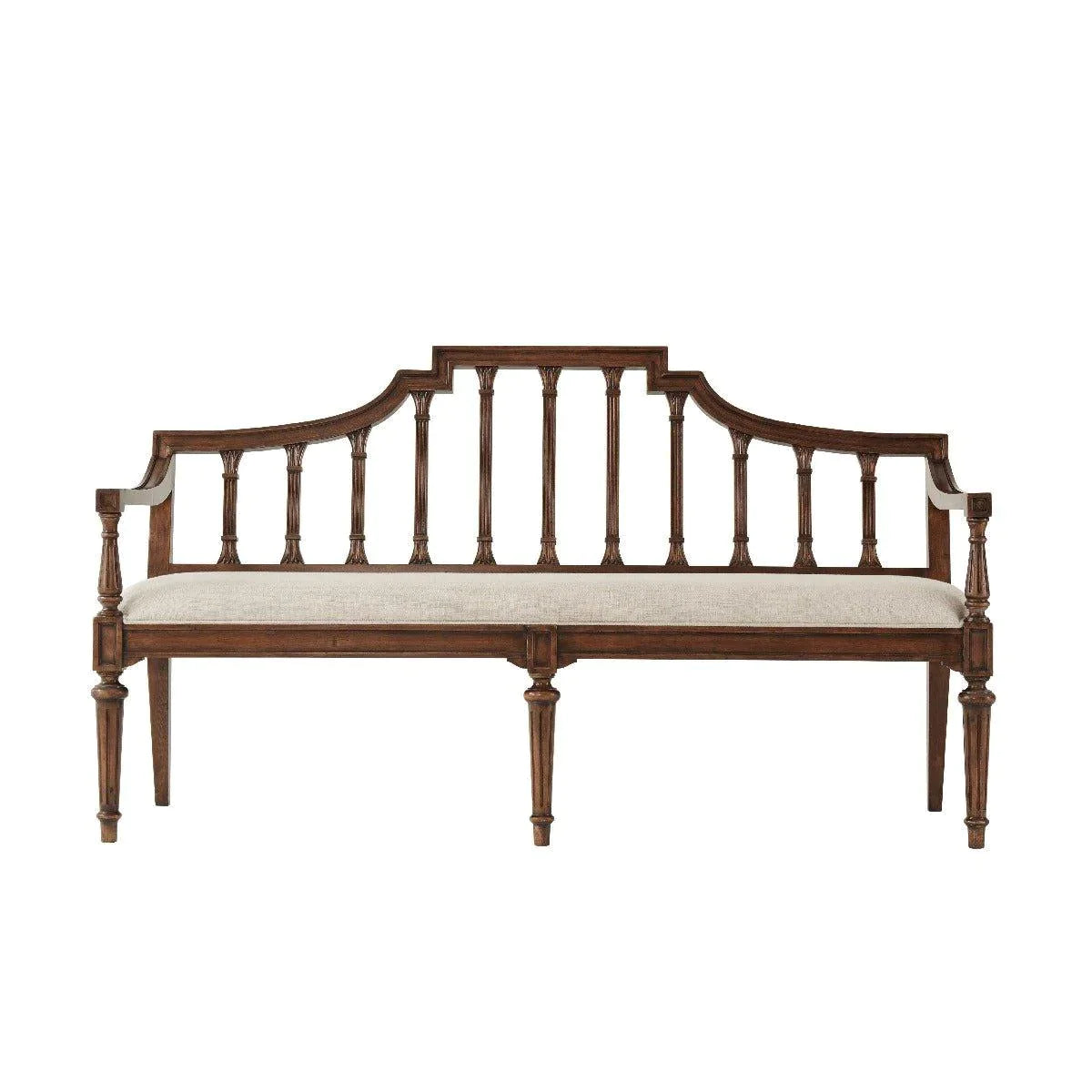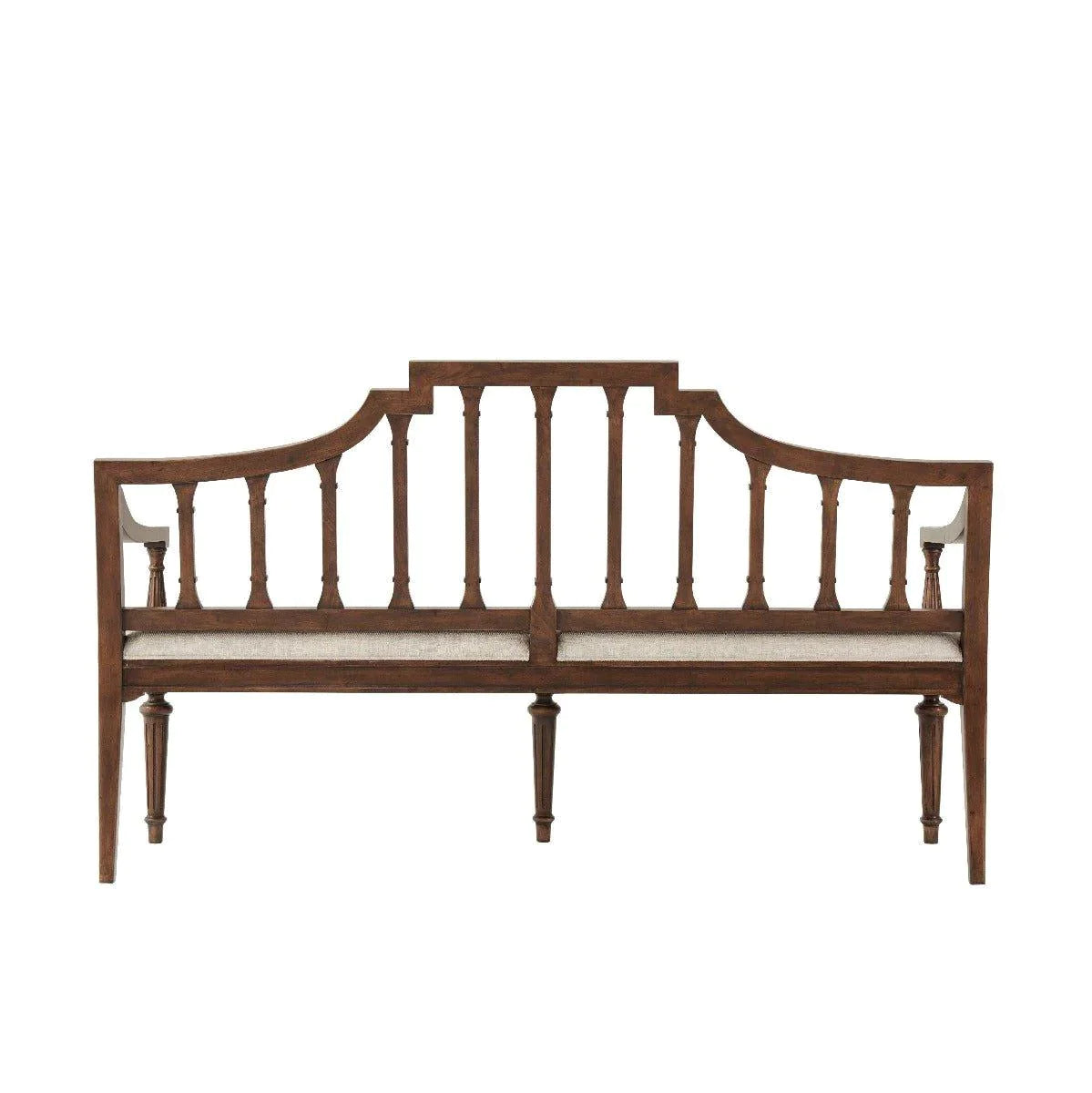 This hand-carved beech settee features a molded angular arched back rail with fluted slats and downswept arms over fluted baluster supports and turned and fluted tapered legs. Pictured in distressed white finish and oatmeal upholstery and is available in two distressed finishes. Please select your option from above.