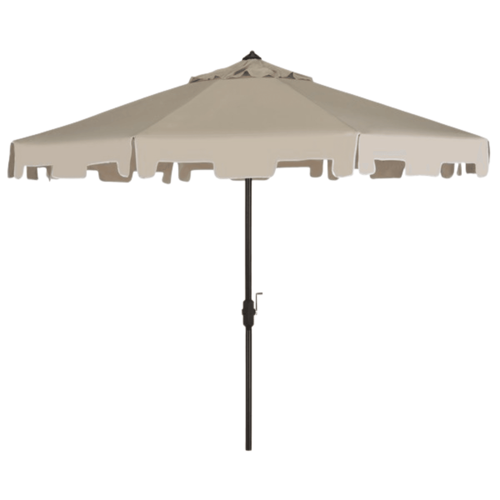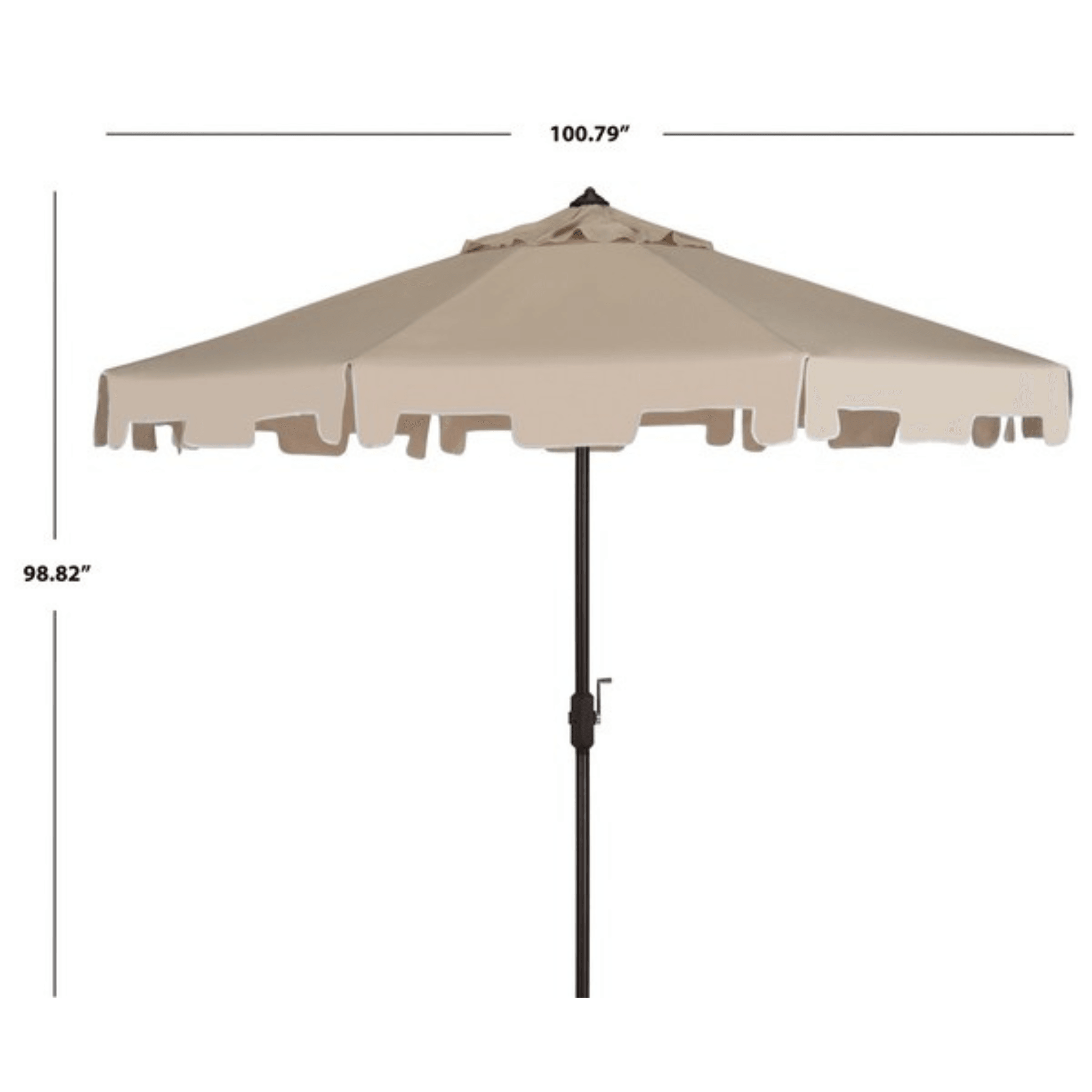 The classic beige market umbrella gets a chic makeover with the addition of a valance for extra sun protection and European flair. Its nine-foot polyester fabric canopy and sturdy brown aluminum frame make this the ideal umbrella for veranda or pool deck. Includes easy crank and tilt mechanism. When open this umbrella measures 100.79"W X 100.79"D X 98.82"H and when closed it measures 6.1"W X 6.1"D X 98.82"H. Assembly required. Click on images for greater detail.