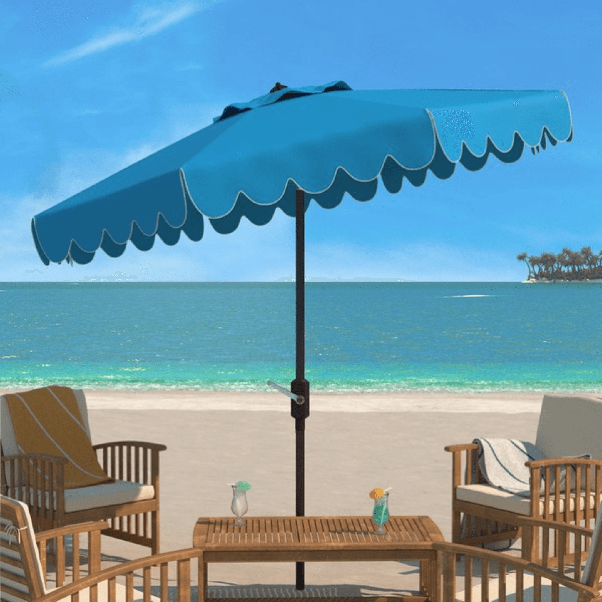 The signature white and blue coloration of Santorini’s lush legendary resort inspired this nine-foot crank umbrella. Its sophisticated Pacific blue hue features a single scallop white trim to create an outdoor retreat for the modern tastemaker. When open this umbrella measures 100.79"W X 100.79"D X 98.82"H and when closed it measures 6.1"W X 6.1"D X 98.82"H. Click images for greater detail.