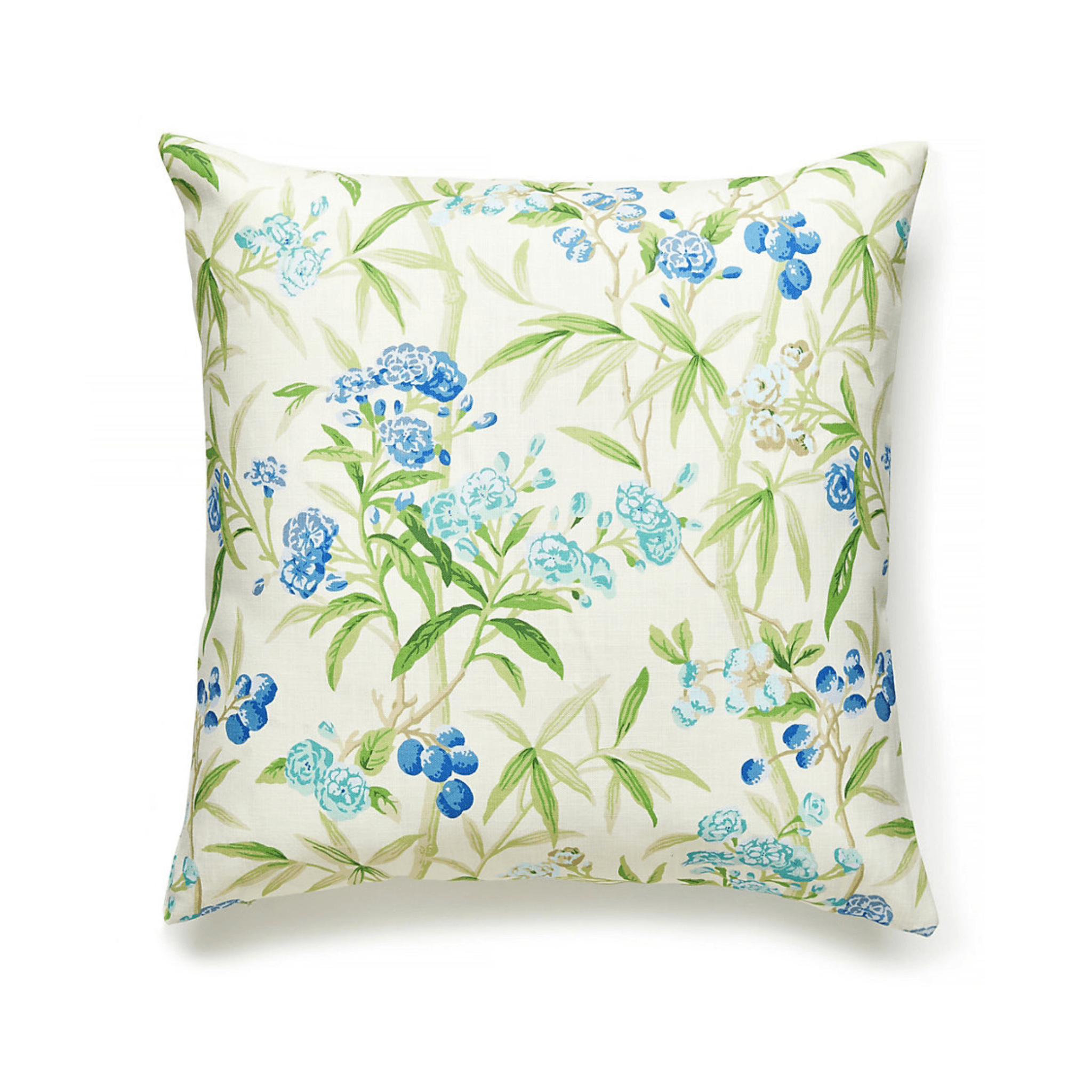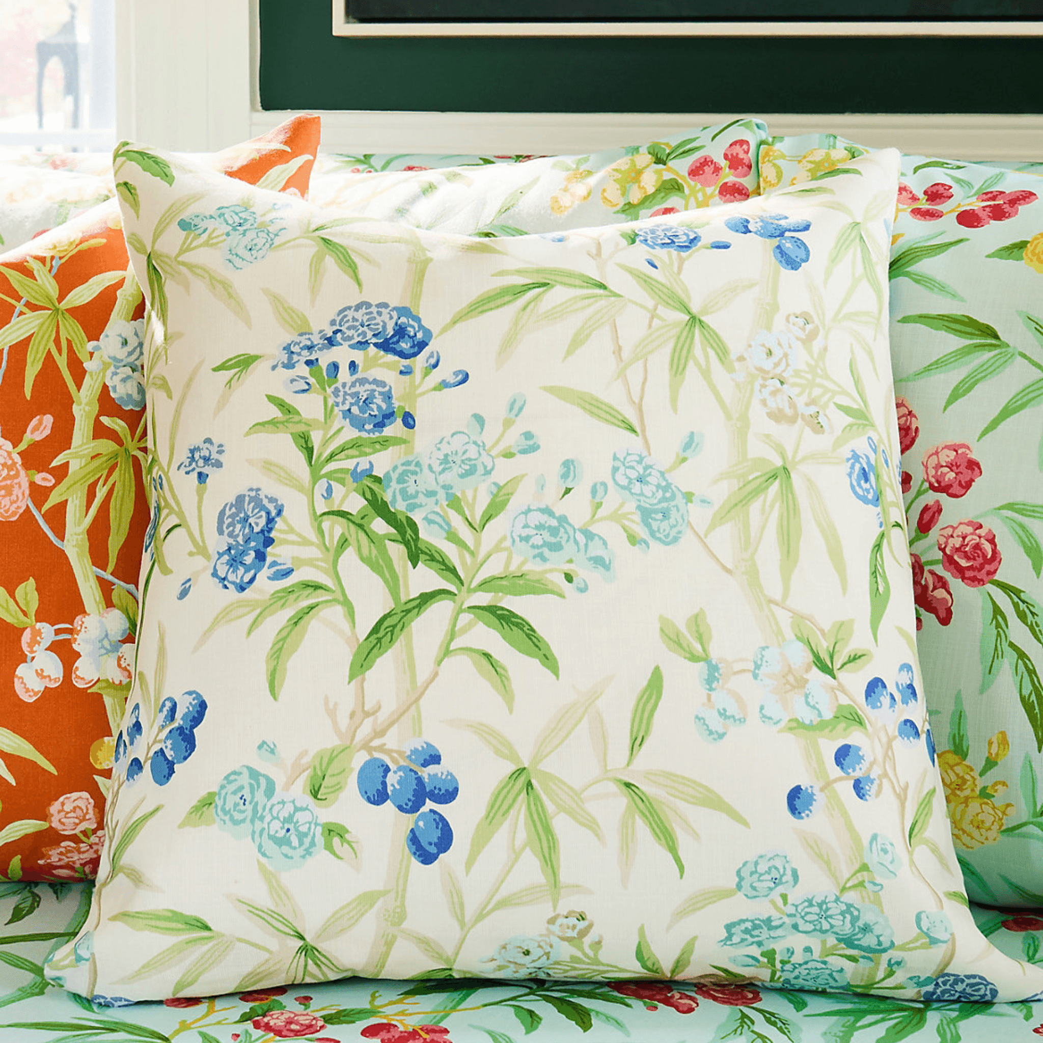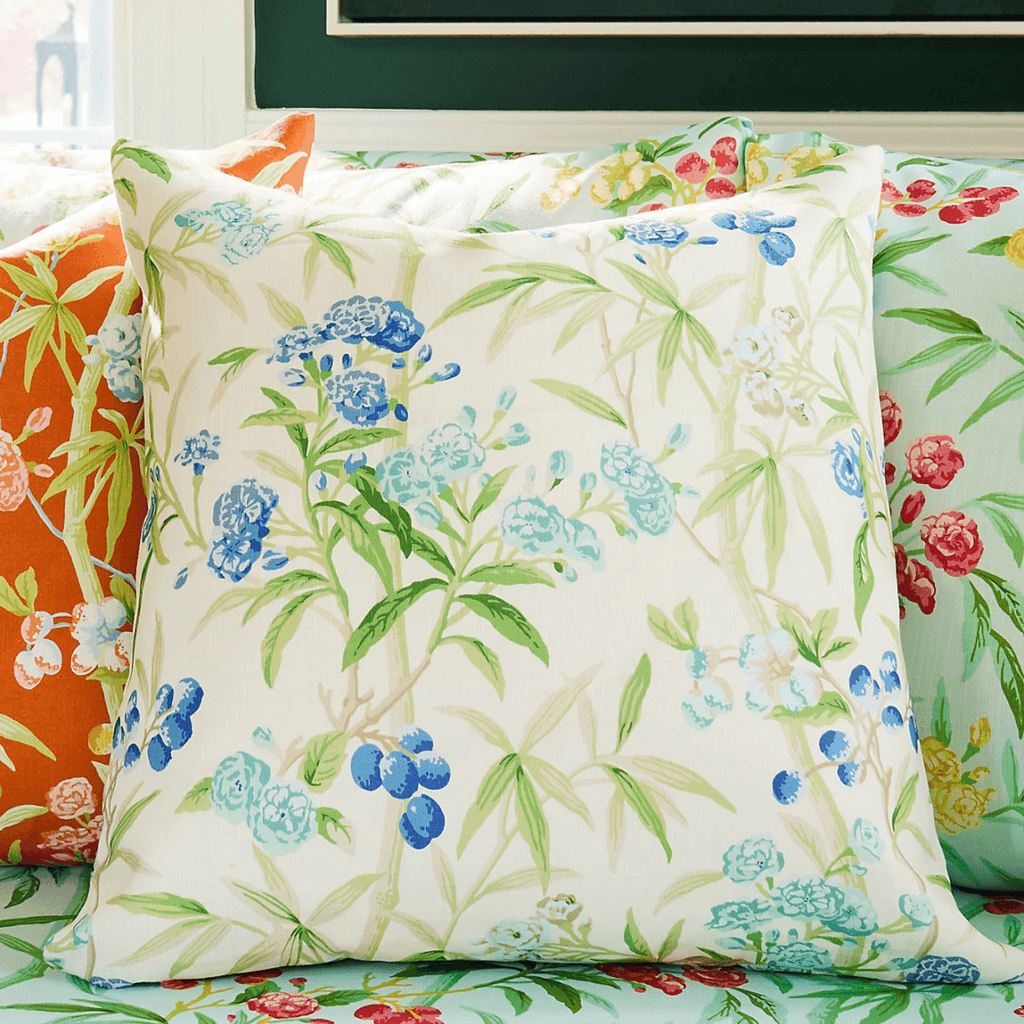 Lanai was an archival find relaunched as a wallcovering in 2019, now available as a pillow suited for indoor and outdoor use.