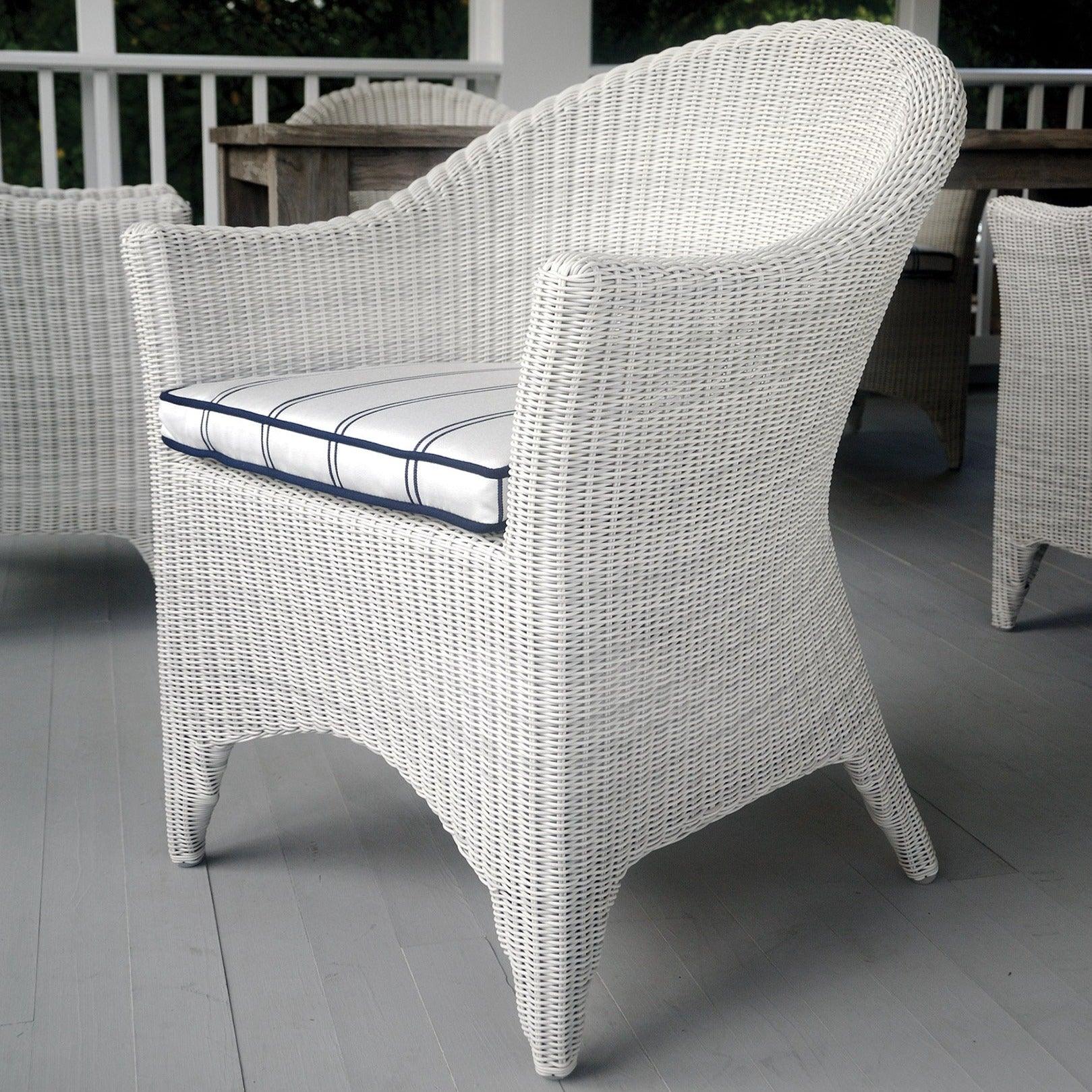 With its elegant sweeping lines and fully woven frame, our Cape Cod dining chair is an updated, more sophisticated version of classic wicker porch furniture. The chair is constructed from all-weather wicker and a rustproof aluminum frame, allowing it to be used outdoors, completely exposed to the elements. Ships fully assembled.