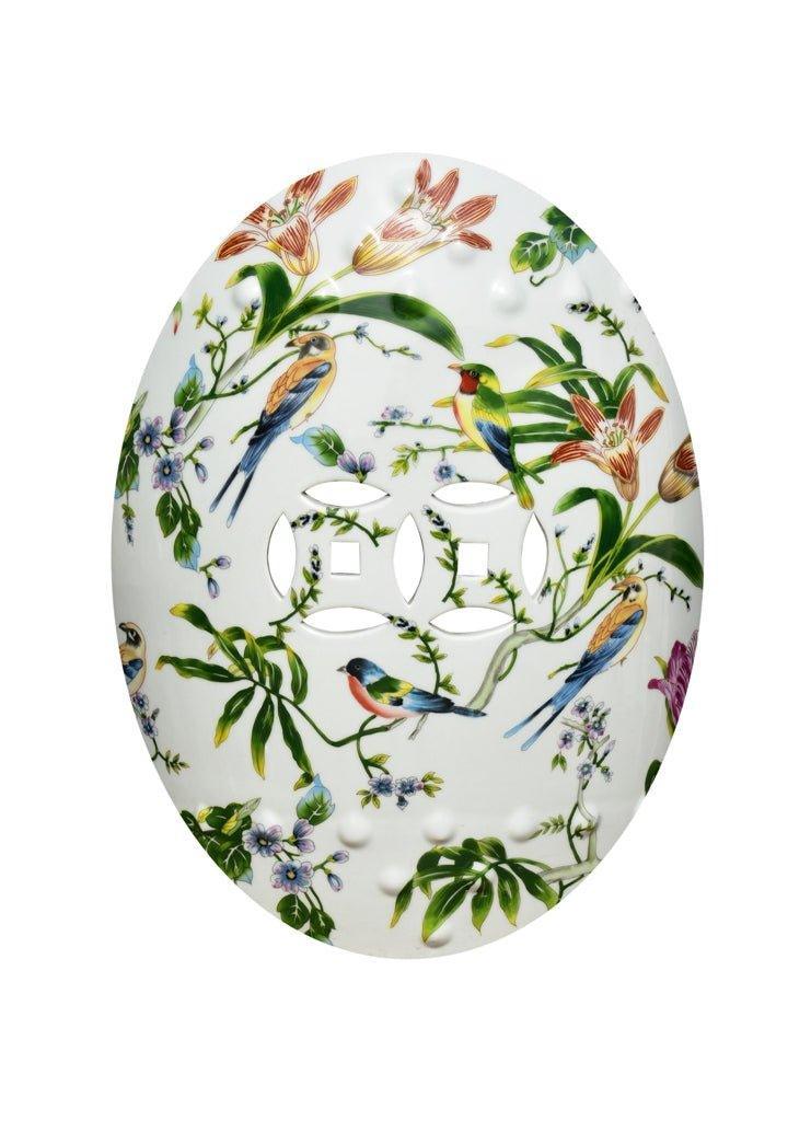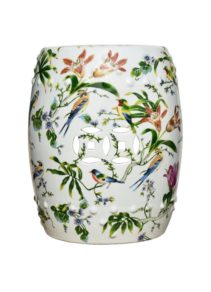 This lovely porcelain garden seat features a bird and lily pattern. The seat measures 16.5"H. Shade and color variations are intrinsic to the beauty of handmade items and are not a product defect. Each product is unique, and the product photo shown represents one, but colors can vary.