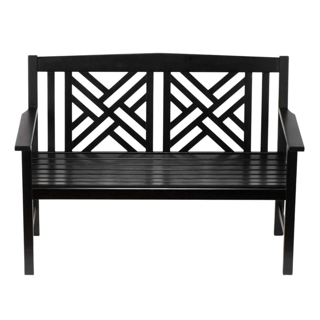 The elegant Fretwork Outdoor Wooden Bench has a classic English garden style with a lattice-work backrest, slatted seat, and straight armrests. The Fretwork Outdoor Wooden Bench is striking against colorful foliage and flowers. Enjoy a comfortable resting place, bird-watching, or conversation in the garden. The attractive gloss black lets this bench blend well with indoor décor as well, for casual seating, or an occasional bench in a playroom, mudroom, or hall.