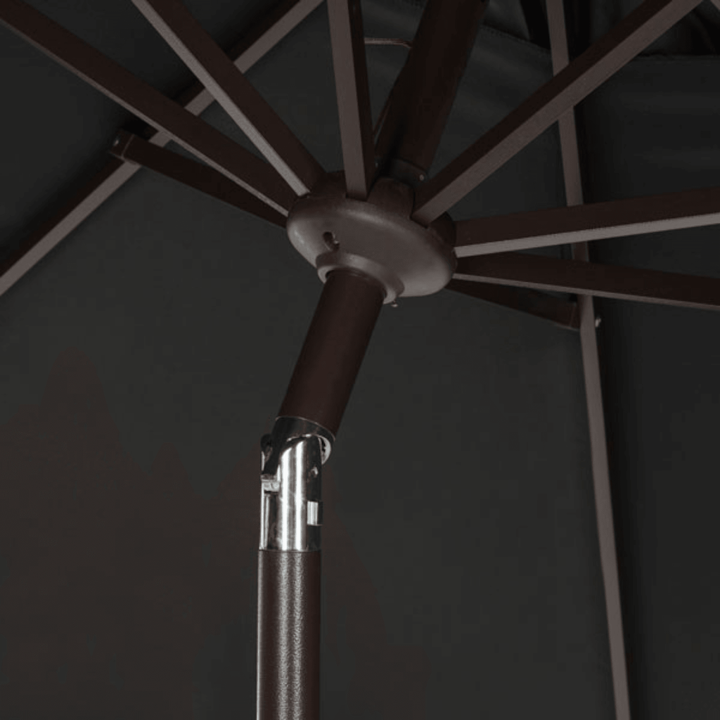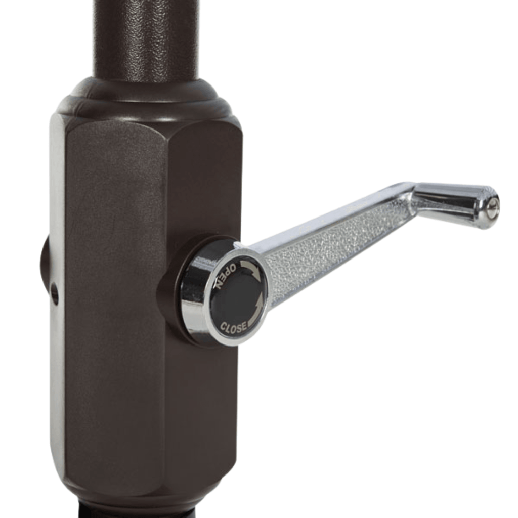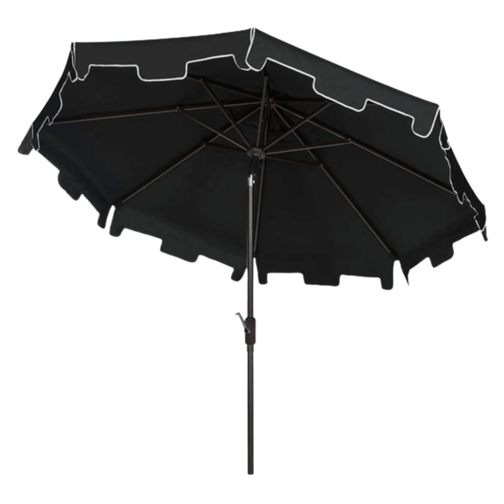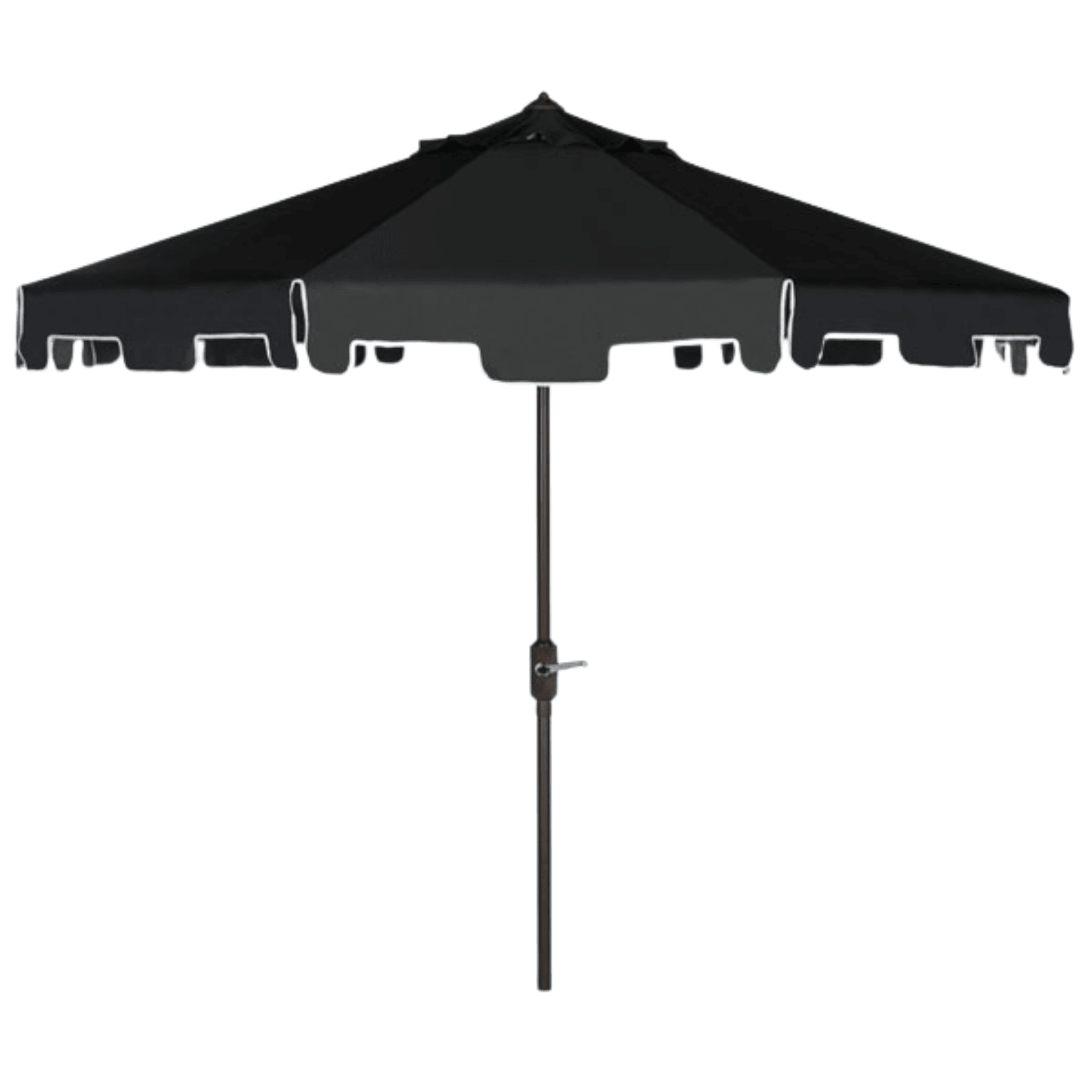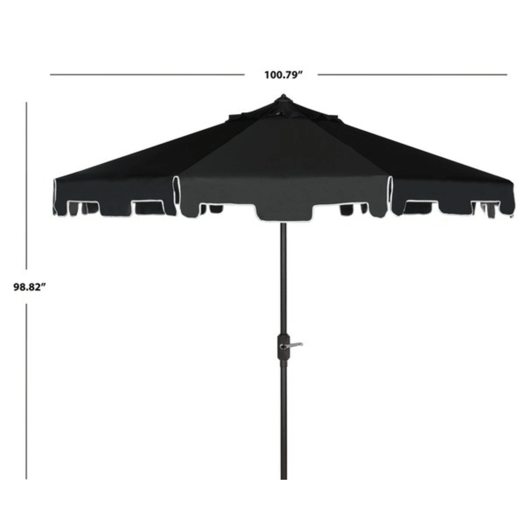A classic market umbrella gets a chic makeover with fashion-forward black and white fabric and a valance for extra sun protection and European flair. Its nine-foot polyester canopy and sturdy brown aluminum frame make it the ideal umbrella for veranda or pool deck. Includes easy crank and tilt mechanism. When open, the umbrella measures 100.79"W X 100.79"D X 98.82"H, and when closed 6.1"W X 6.1"D X 98.82"H. Pole diameter measures 1.5". Please note some assembly is required for this item. Click images for greater details.