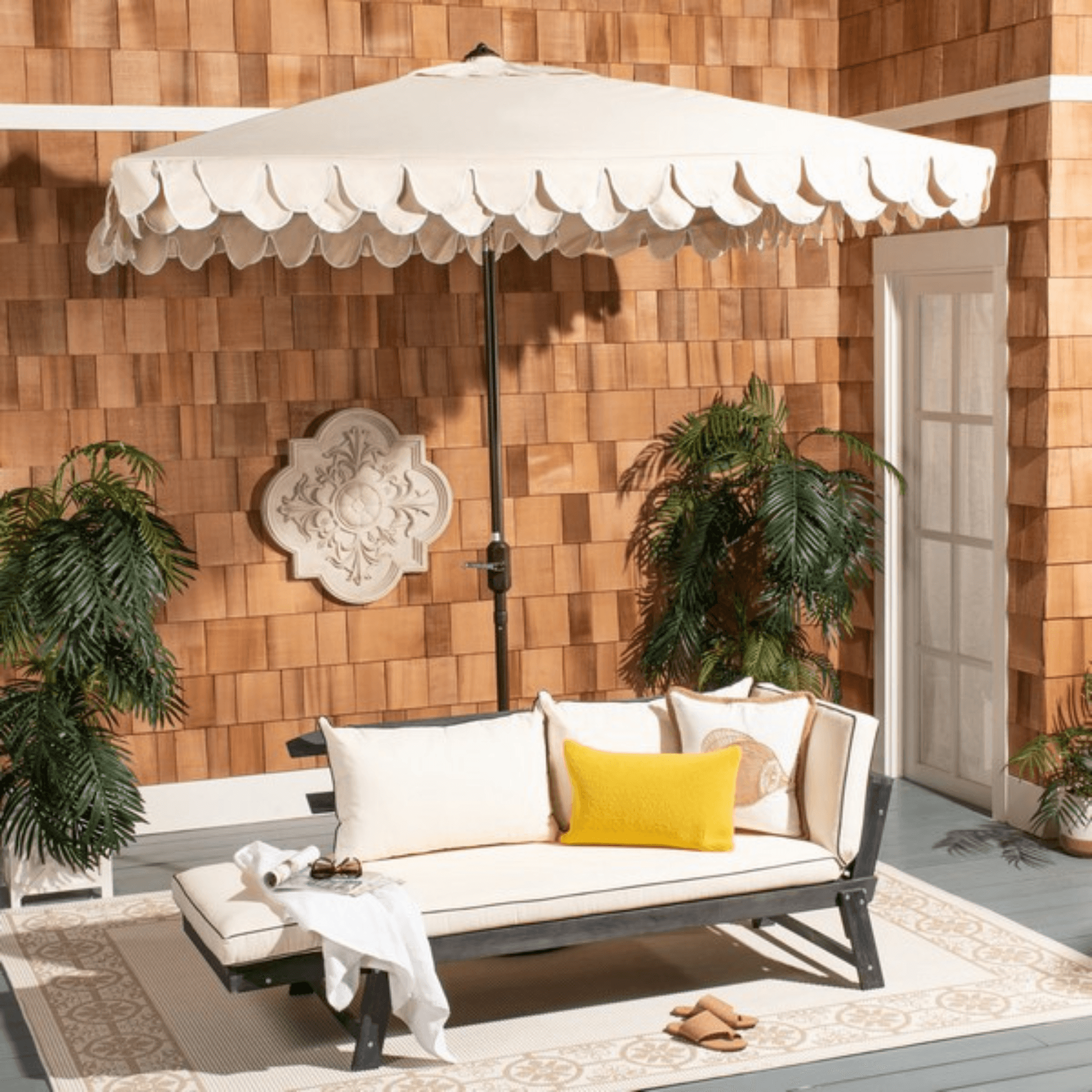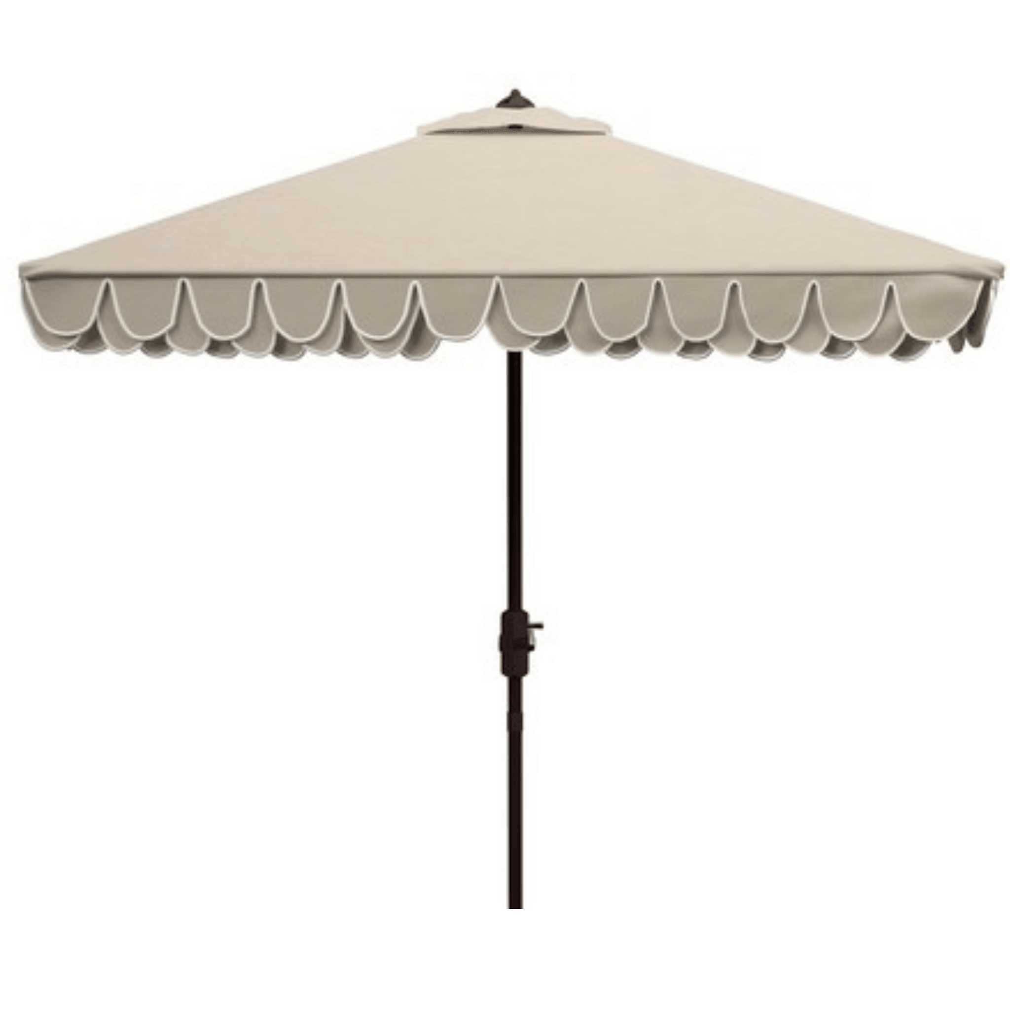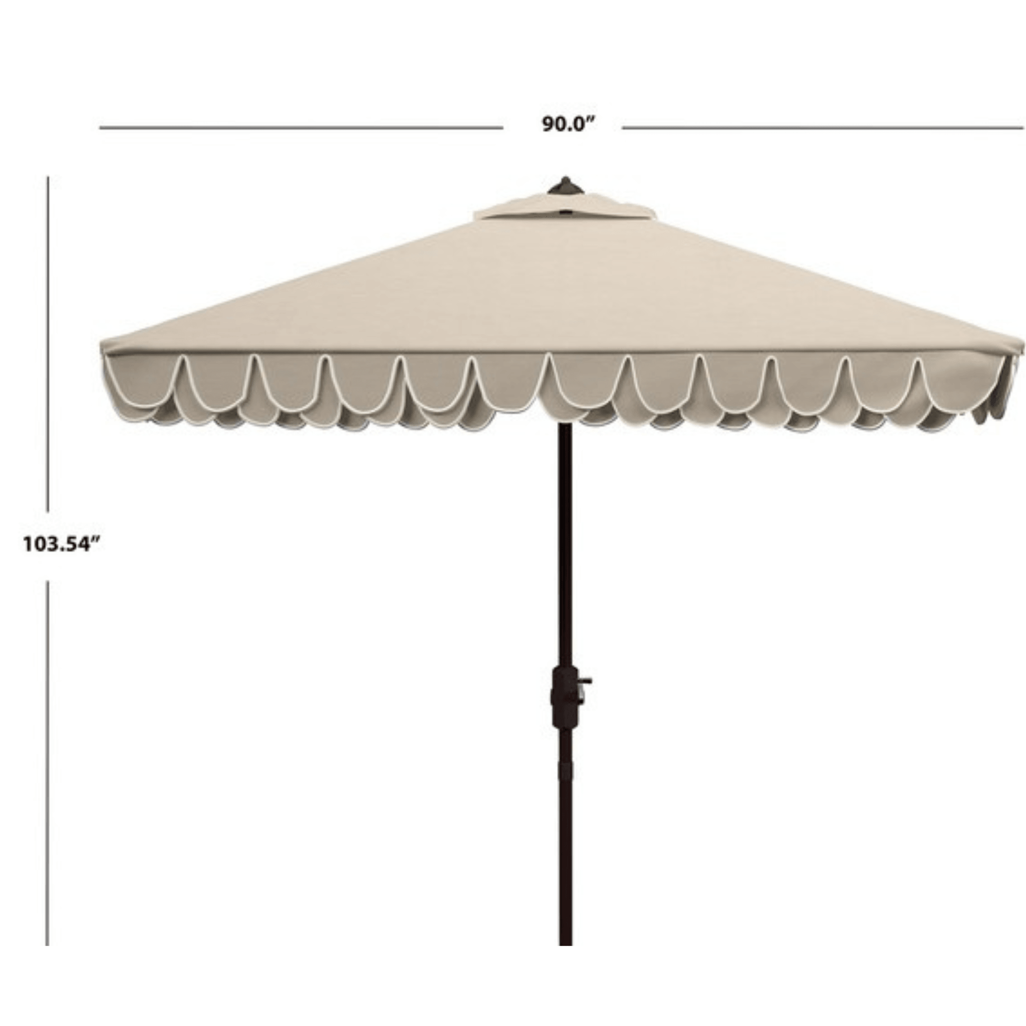 Give your backyard the luxurious feel of lounging by the French Riviera with this 7.5Ft Elegant Valance Umbrella. With a polyester canopy and petal trim finished in soft beige and white, it recalls the inimitable glamour of the Cote d’Azur. When open this umbrella measures 90"W X 90"D X 92.12"H and when closed it measures 5.79"W X 5.79"D X 92.12"H. Click images for greater detail.