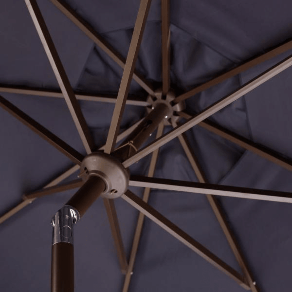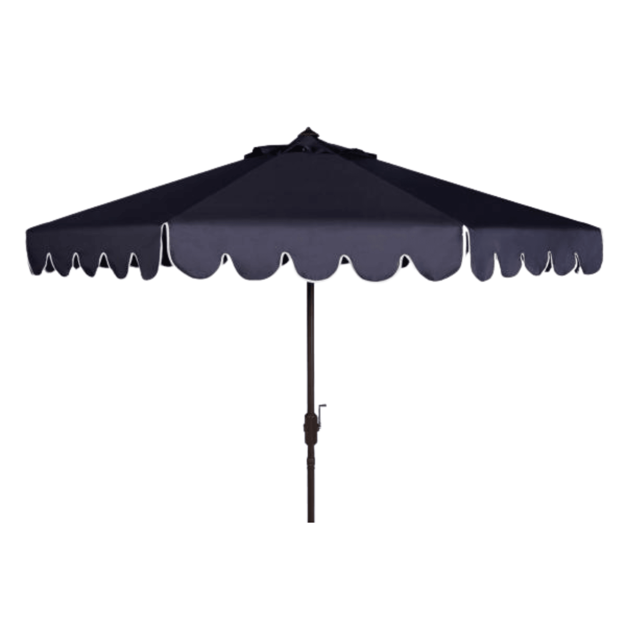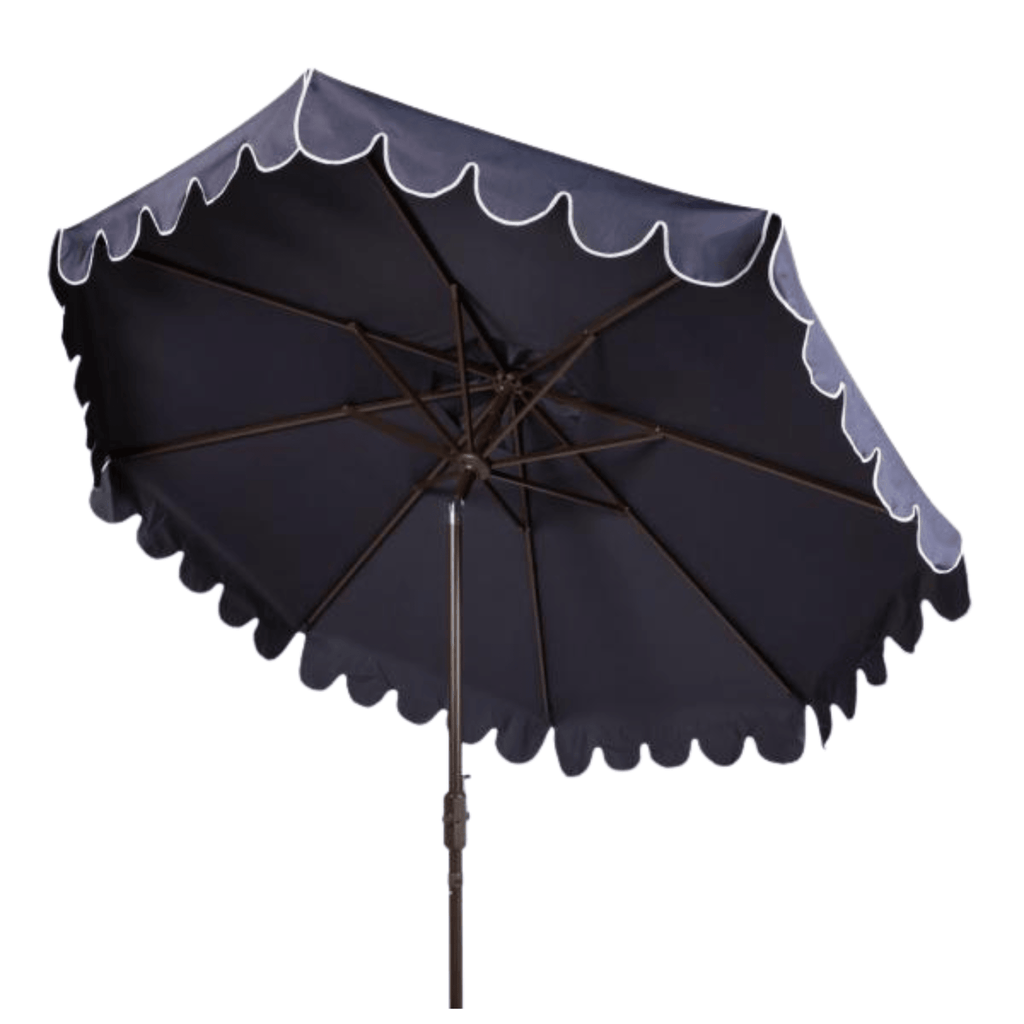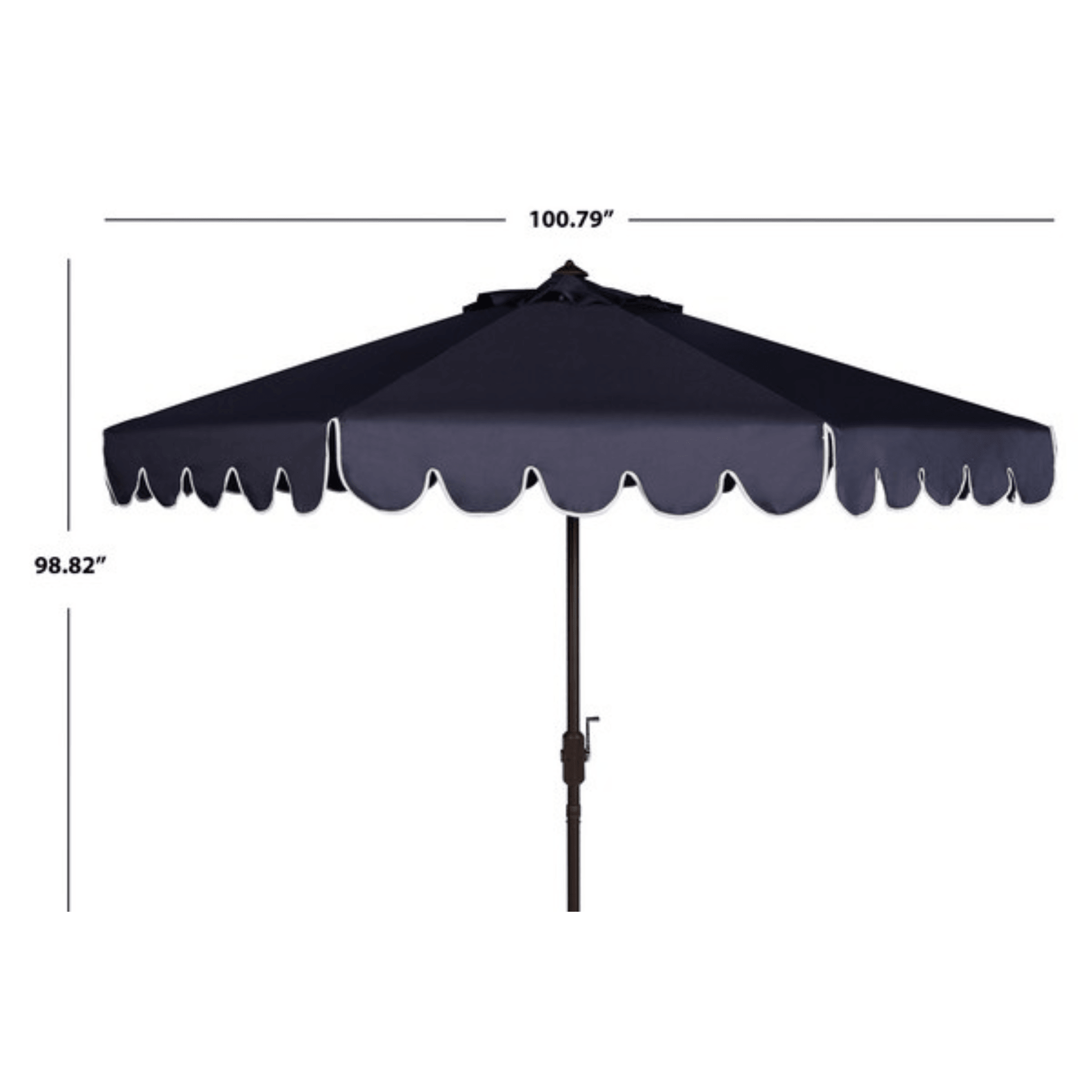The signature white and blue coloration of Santorini’s lush legendary resort inspired this nine-foot crank umbrella. Its sophisticated navy hue features a single scallop white trim to create an outdoor retreat for the modern tastemaker. When open this umbrella measures 100.79"W X 100.79"D X 98.82"H. and when closed it measures 6.1"W x 6.1"D x 98.82”H. Click on images for greater detail.