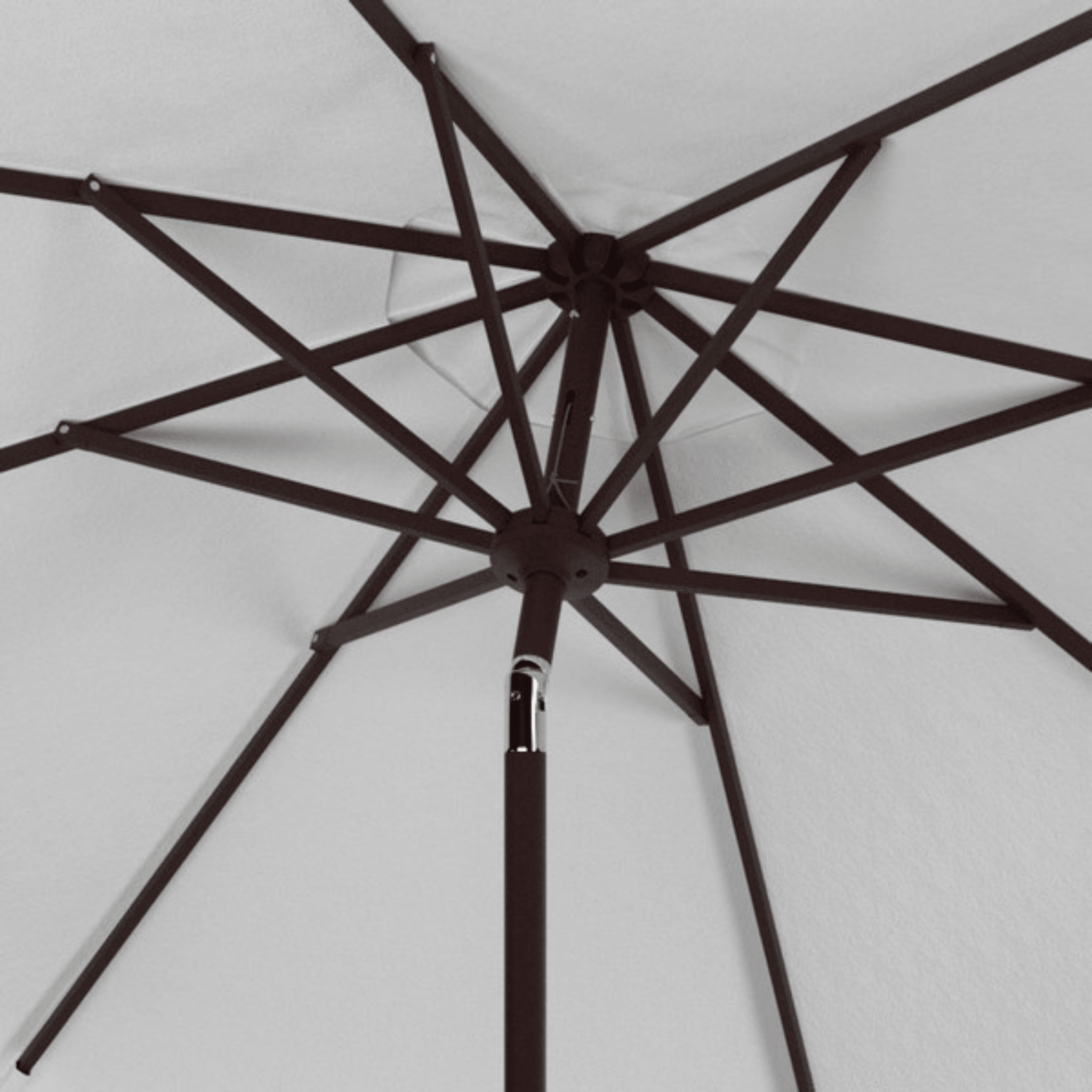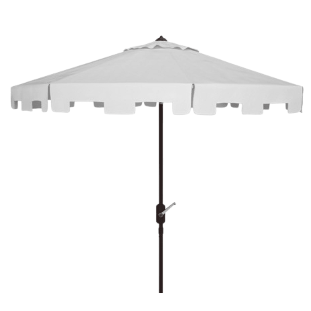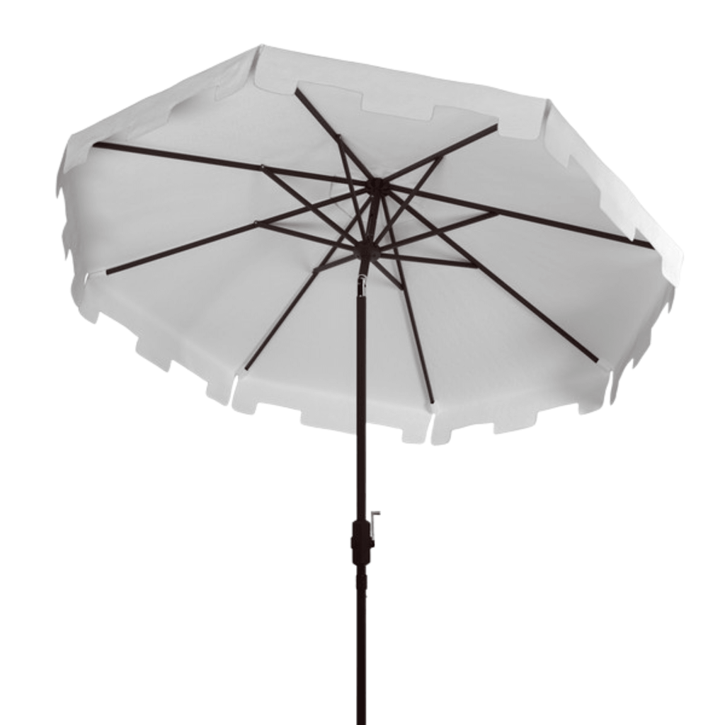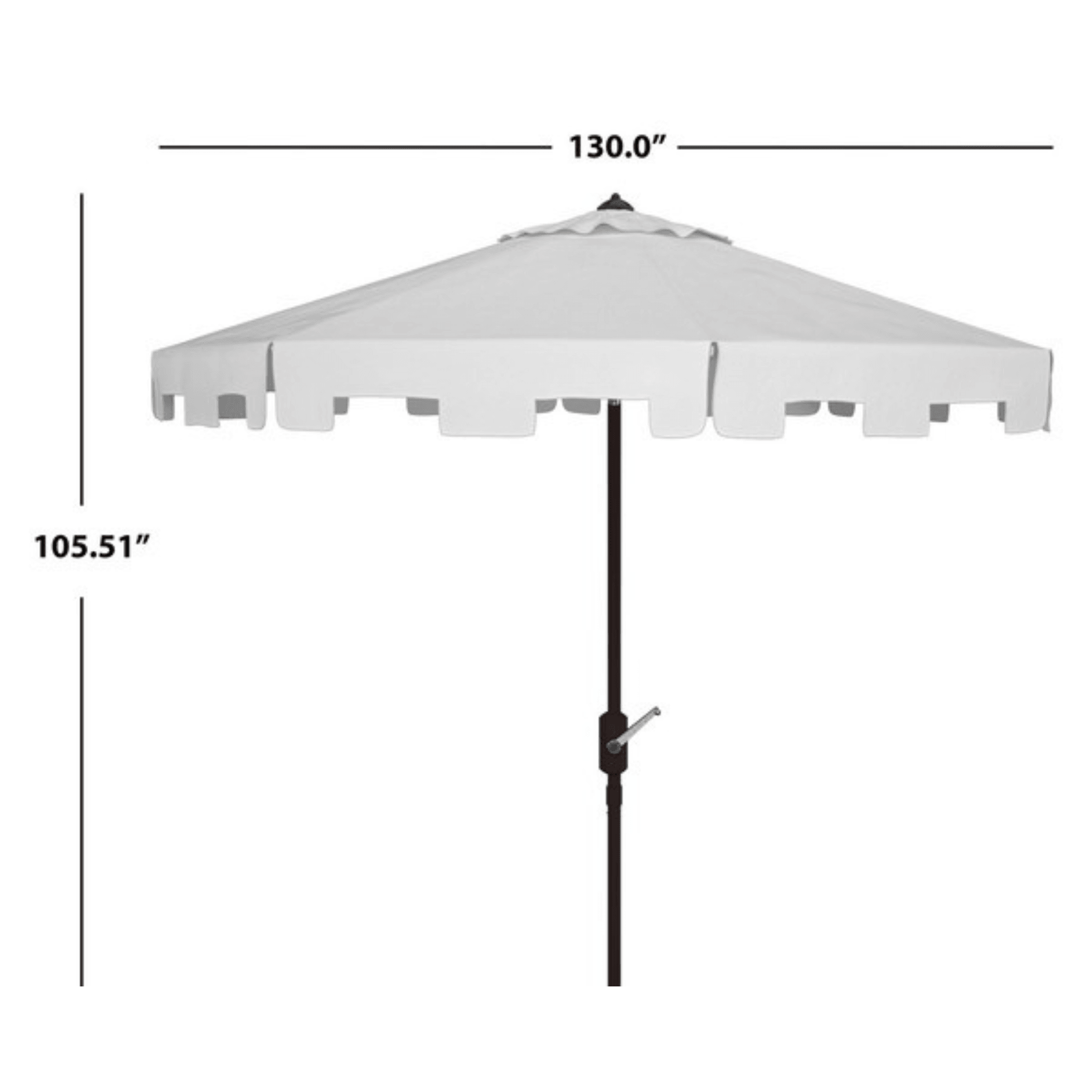 A classic market umbrella gets a chic makeover in tone-on-tone shades of white with a stylish valance for extra sun protection and European flair. Its round eleven-foot polyester canopy and brown aluminum post make it ideal for the veranda or pool deck. Includes easy crank and tilt mechanism. When open, this umbrella measures 130"W x 130"D x 105.51"H. When closed it measures 6.1"W X 6.1"D  X 105.51"H. Please note some assembly is required for this item. Click images for greater detail.