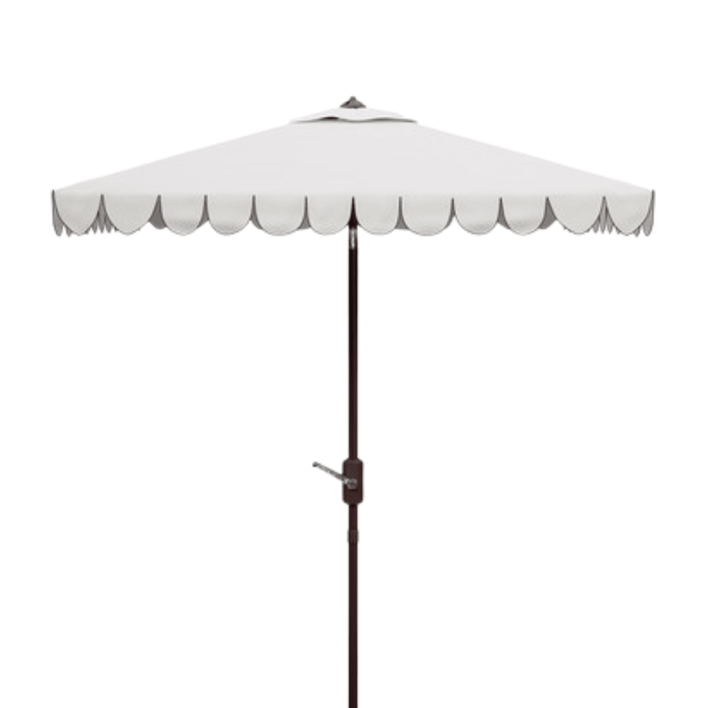 This European resort inspired square market umbrella features a chic white hue and matching scalloped trim to create an outdoor retreat for the modern tastemaker. When open this umbrella measures 90"W X 90"D X 103.54"H and when closed it measures 5.91"W X 5.12"D X 103.54"H. Click images for greater detail.