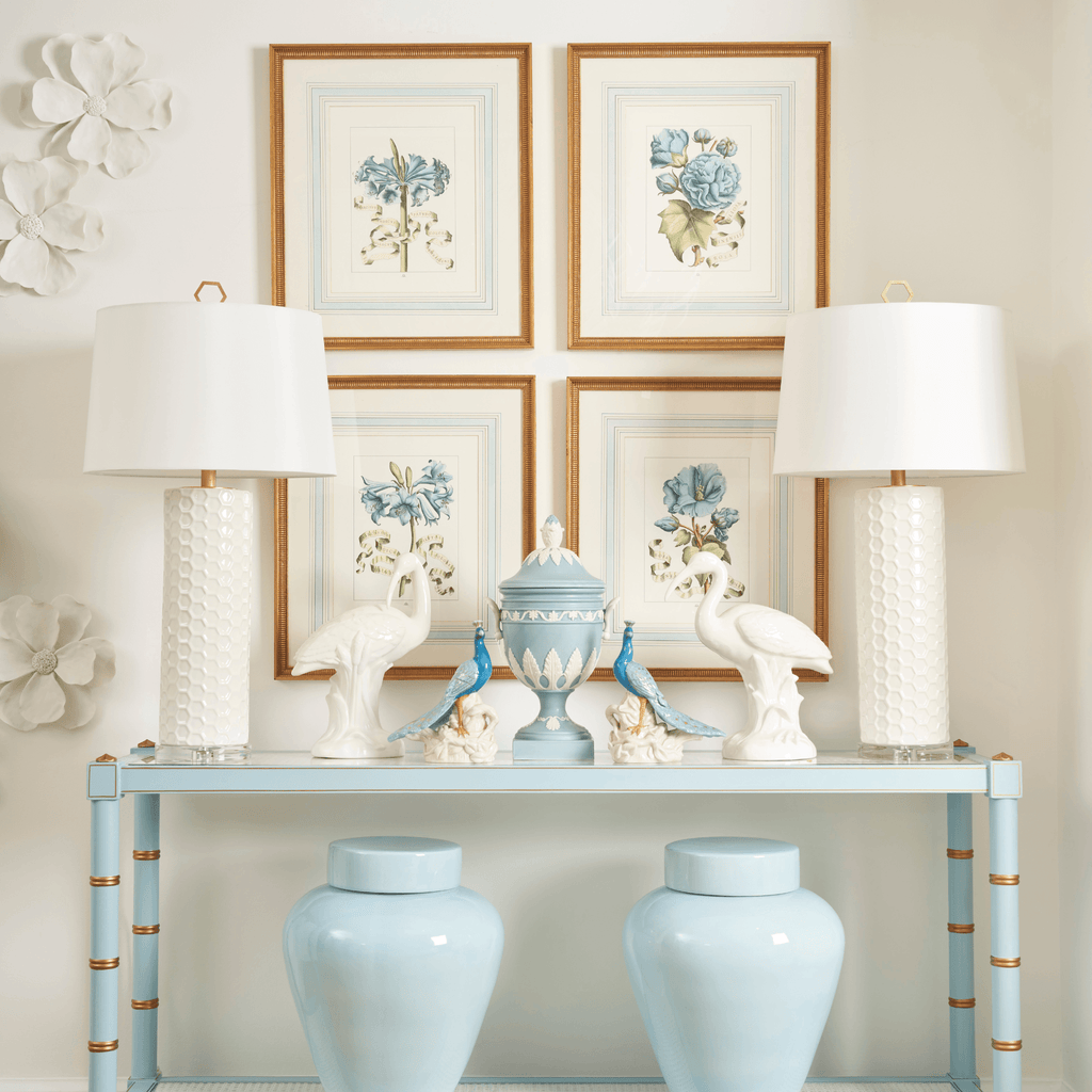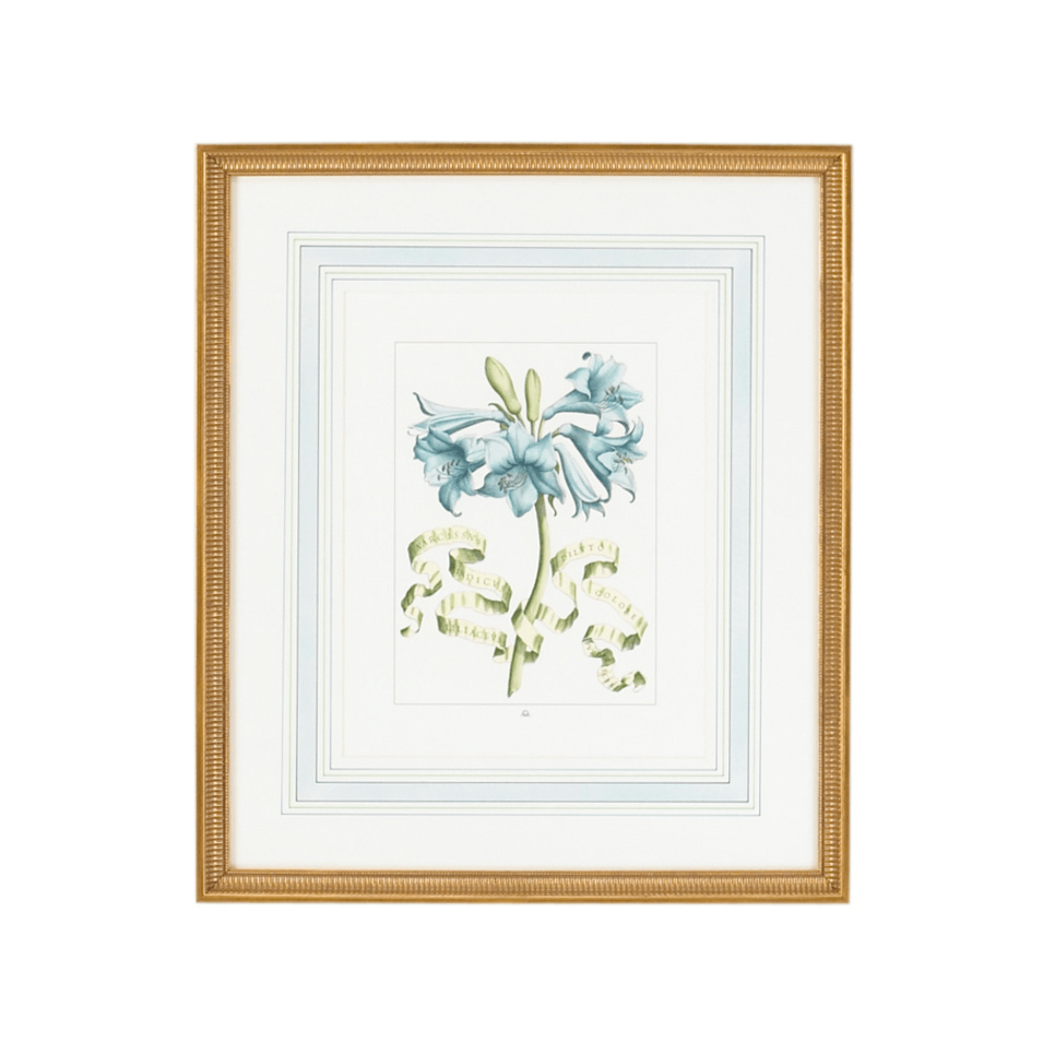 This blue and green floral bouquet and ribbon artwork is beautifully framed in a gold wood and French mat with hand colored engraving.