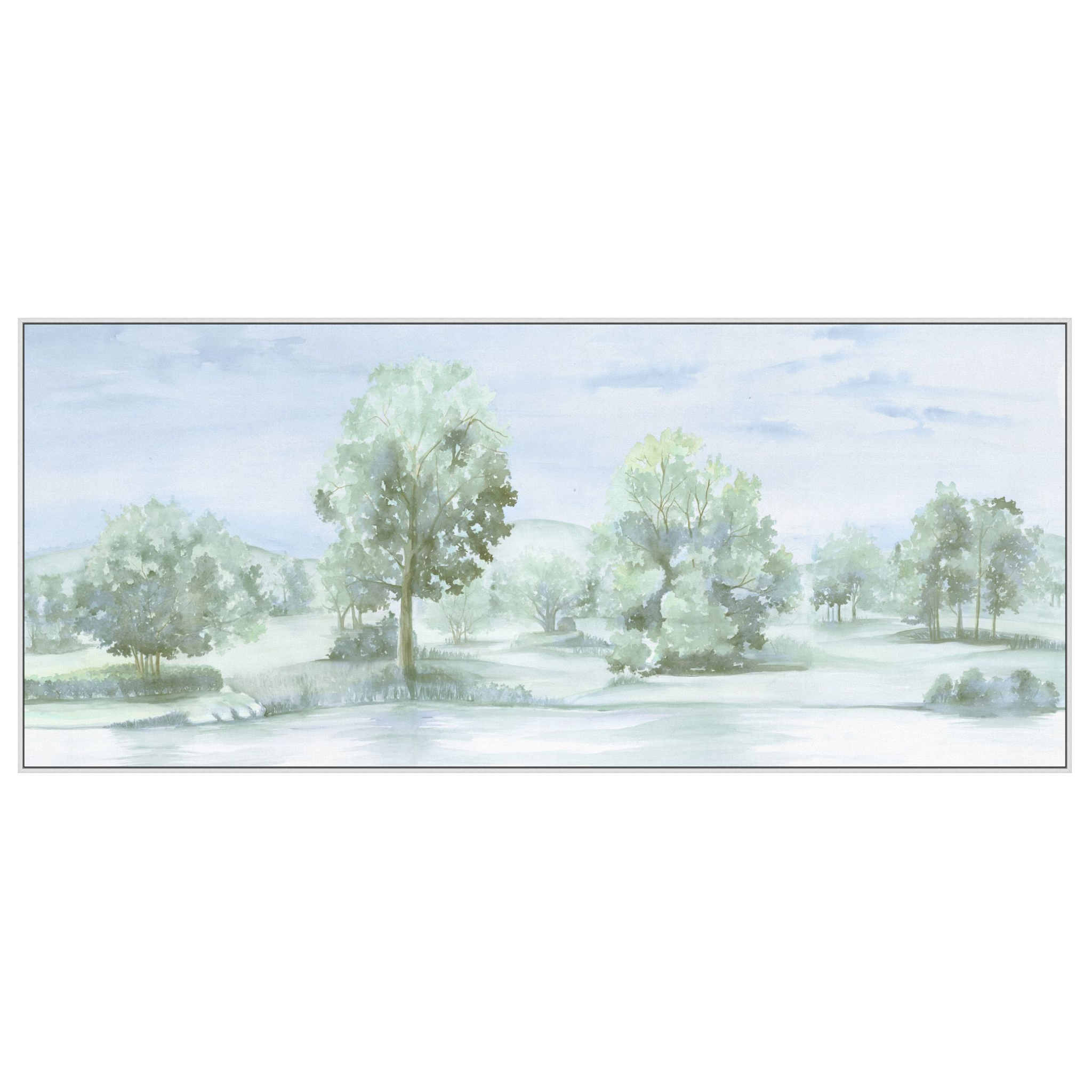 The Through the Morning Mist Framed Wall Art features a giclee on a gallery wrapped raw canvas. Click images for greater detail.