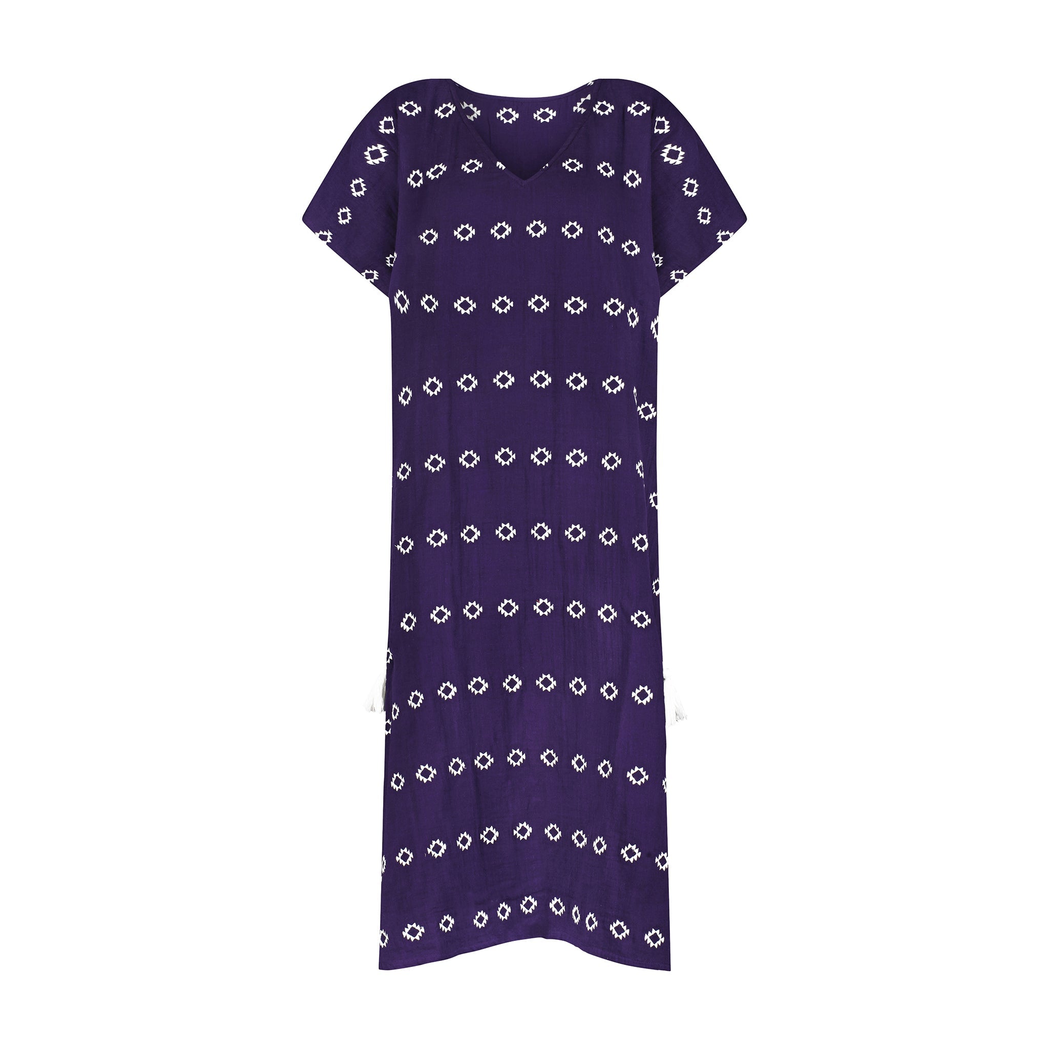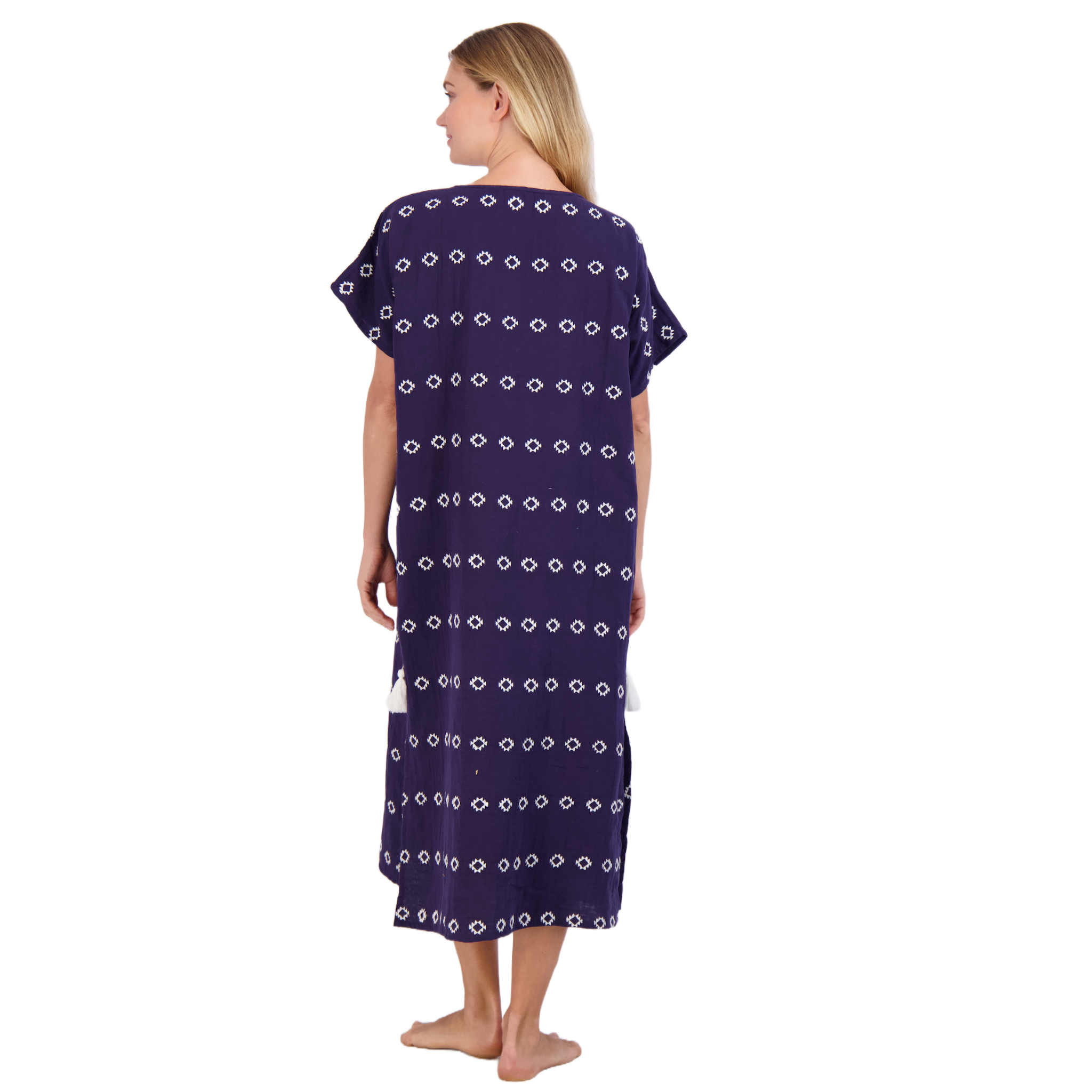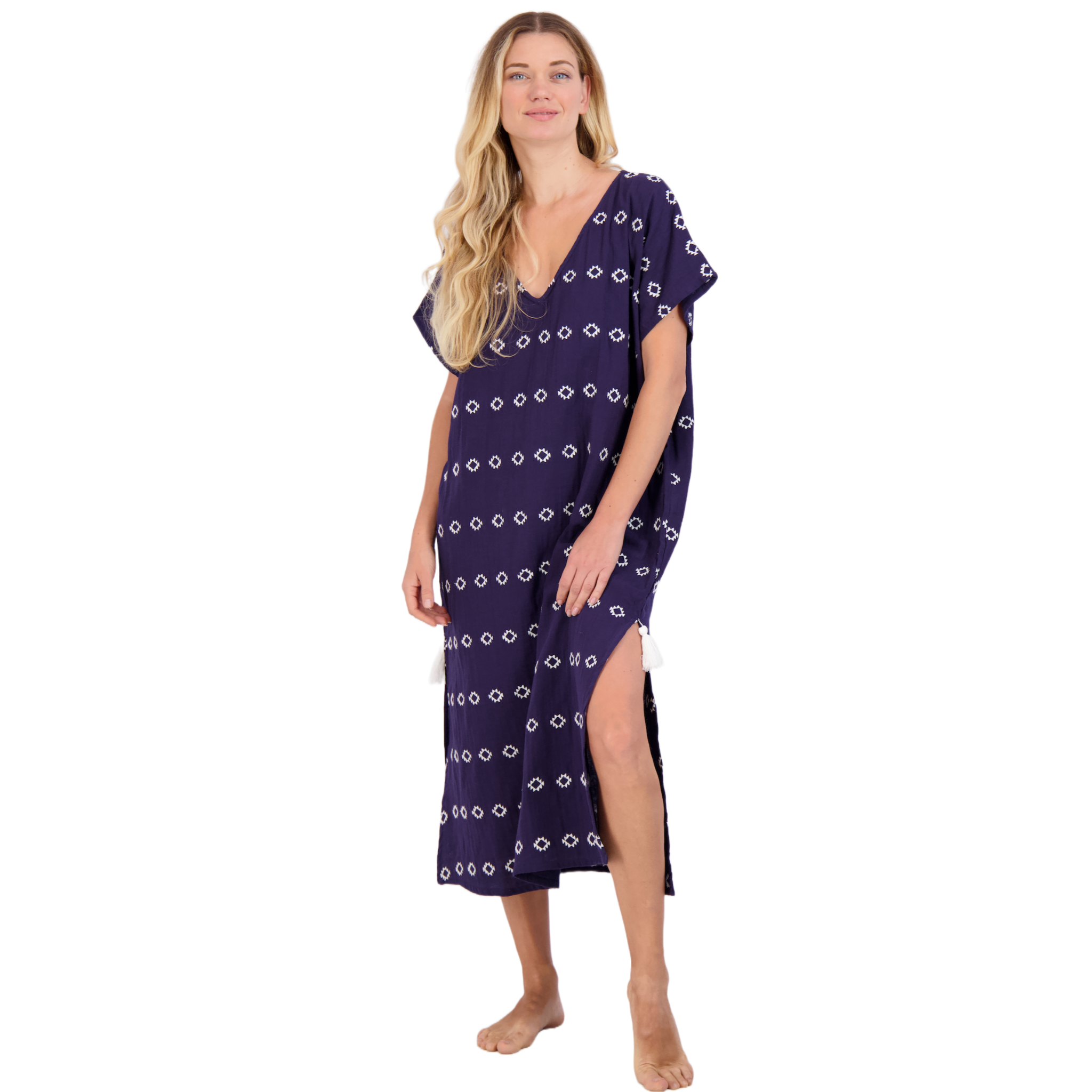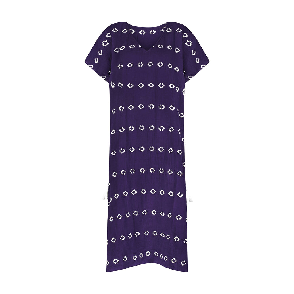 Envelope yourself in our timeless boho chic Capucine Women's Caftan.  Relaxed drop shoulders, embroidered detailing and a deep V make this one-size-fits-most beach-to-lunch cover up stand out.  With cotton gauze construction and a maxi length, you'll look fashionable without sacrificing comfort.