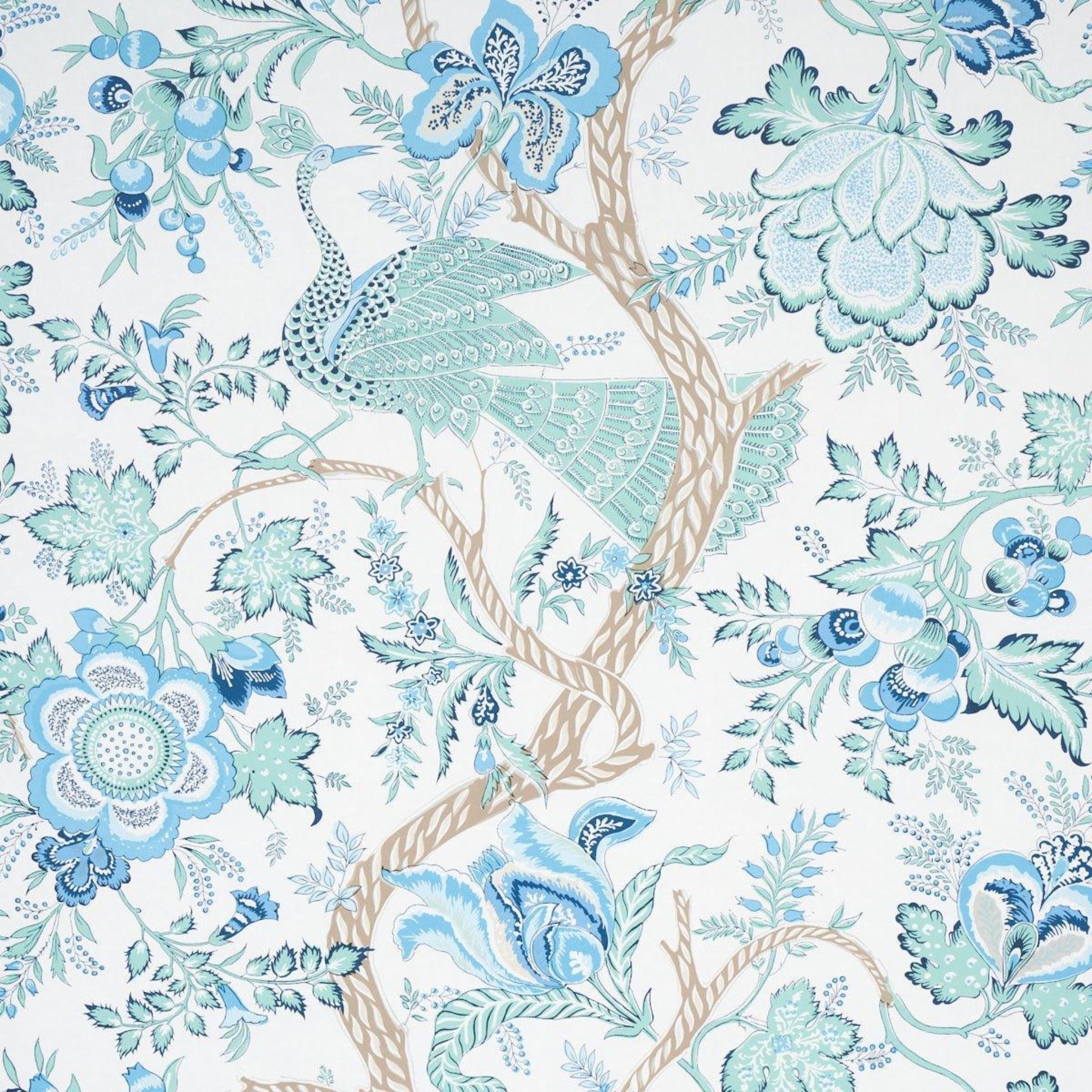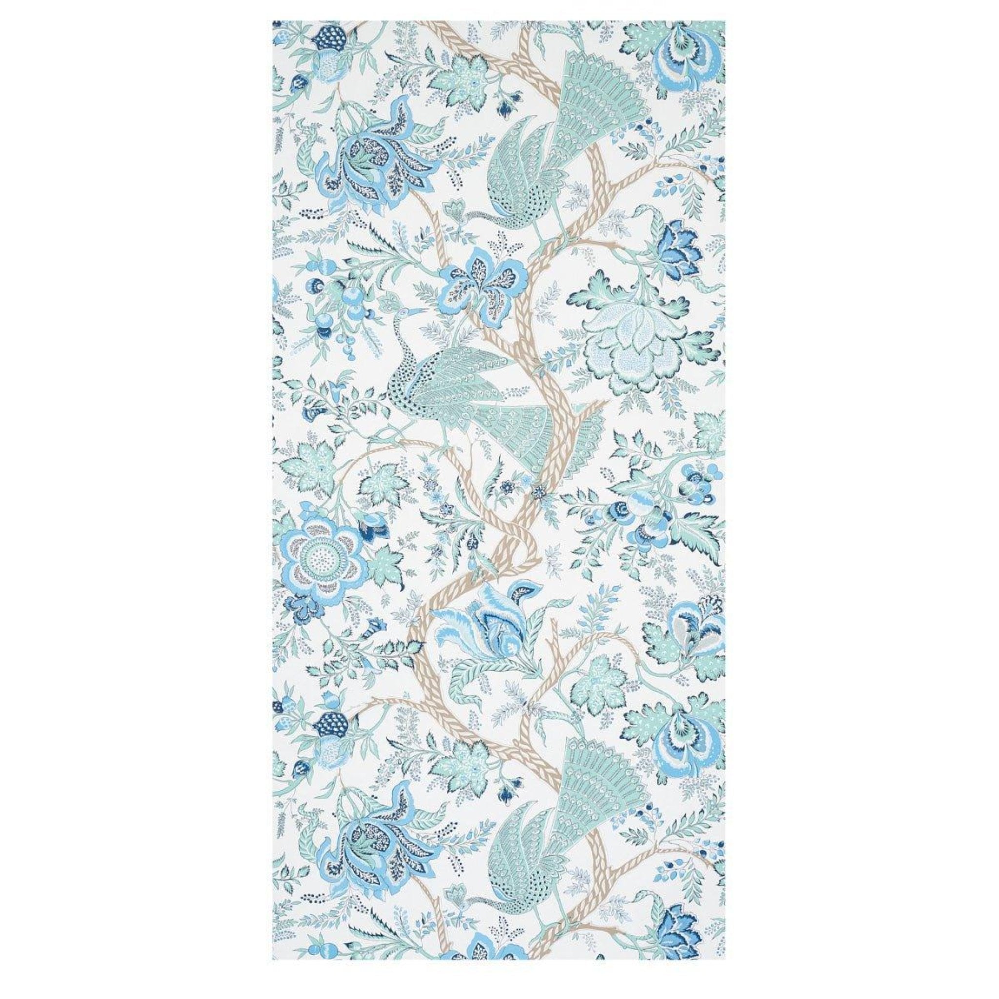 Inspired by 19th-century Indian textiles, Aveline in sea glass is inhabited by regal peacocks and an undulating flowering vine, both rendered with fanciful, delicate details.