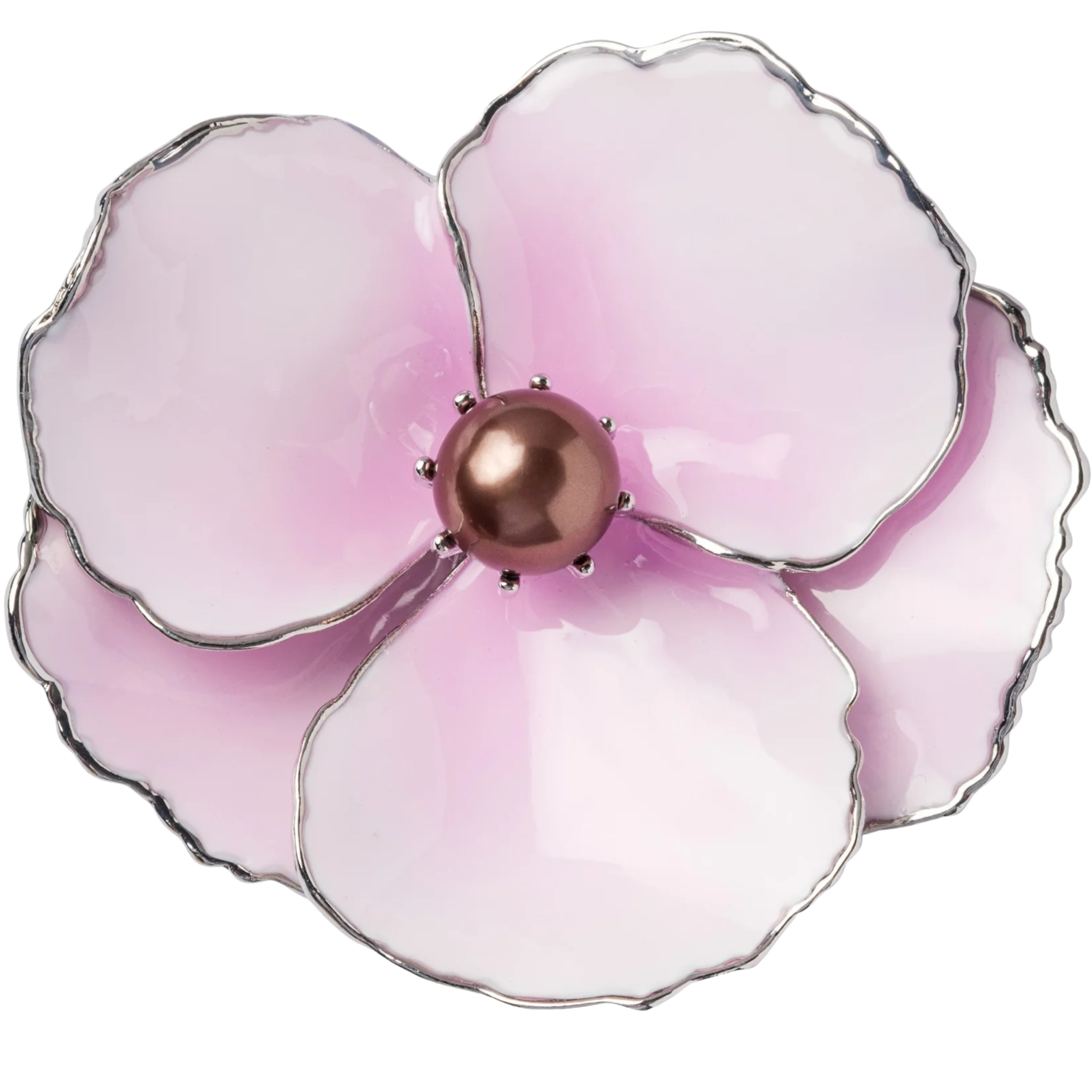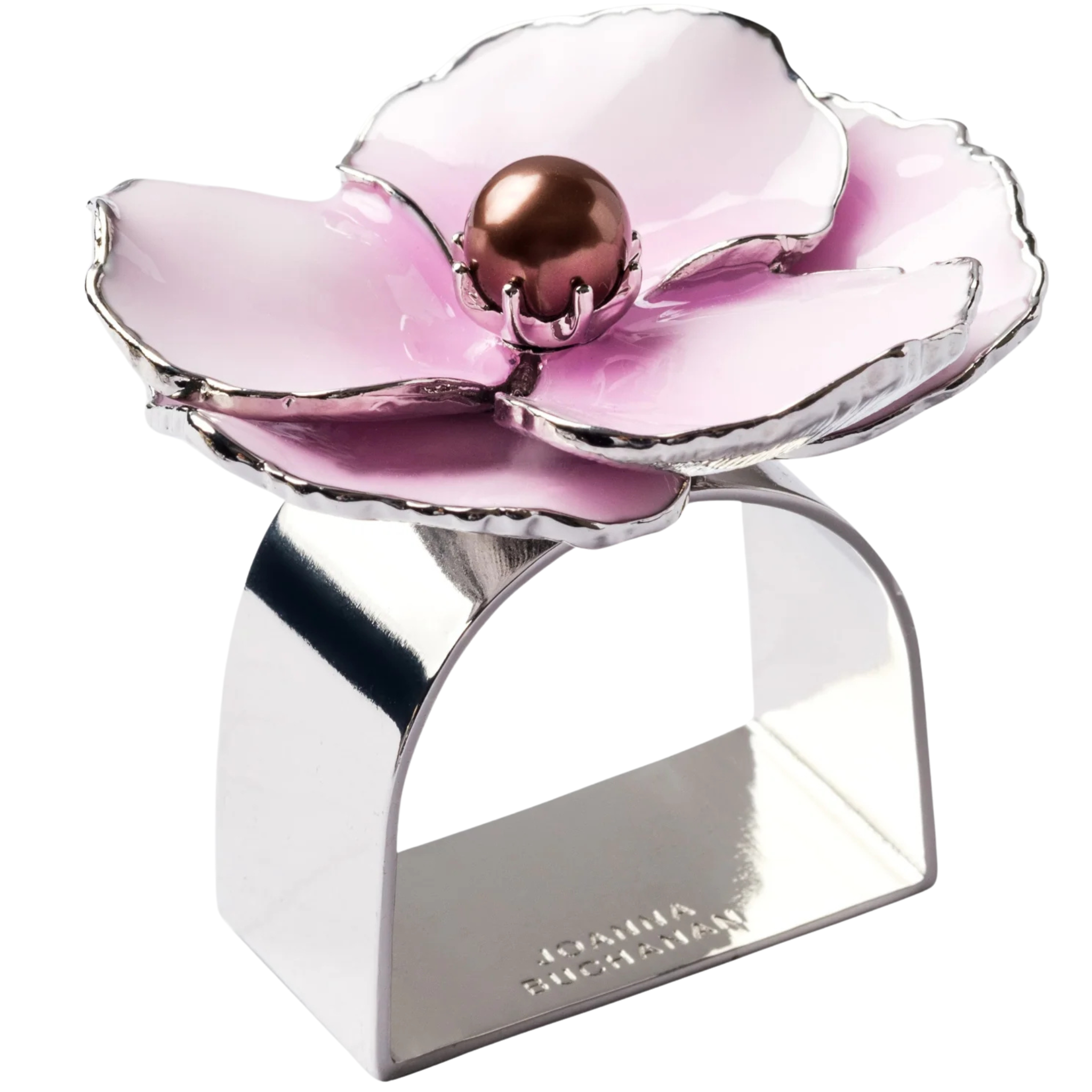 Crafted from durable brass and zinc with a shiny silver finish, each napkin ring is adorned with a delicate pink enamel flower, offering a fresh, feminine touch. Perfect for spring gatherings, special occasions, or adding a touch of charm to everyday dining, these napkin rings effortlessly combine timeless sophistication with vibrant floral design.
