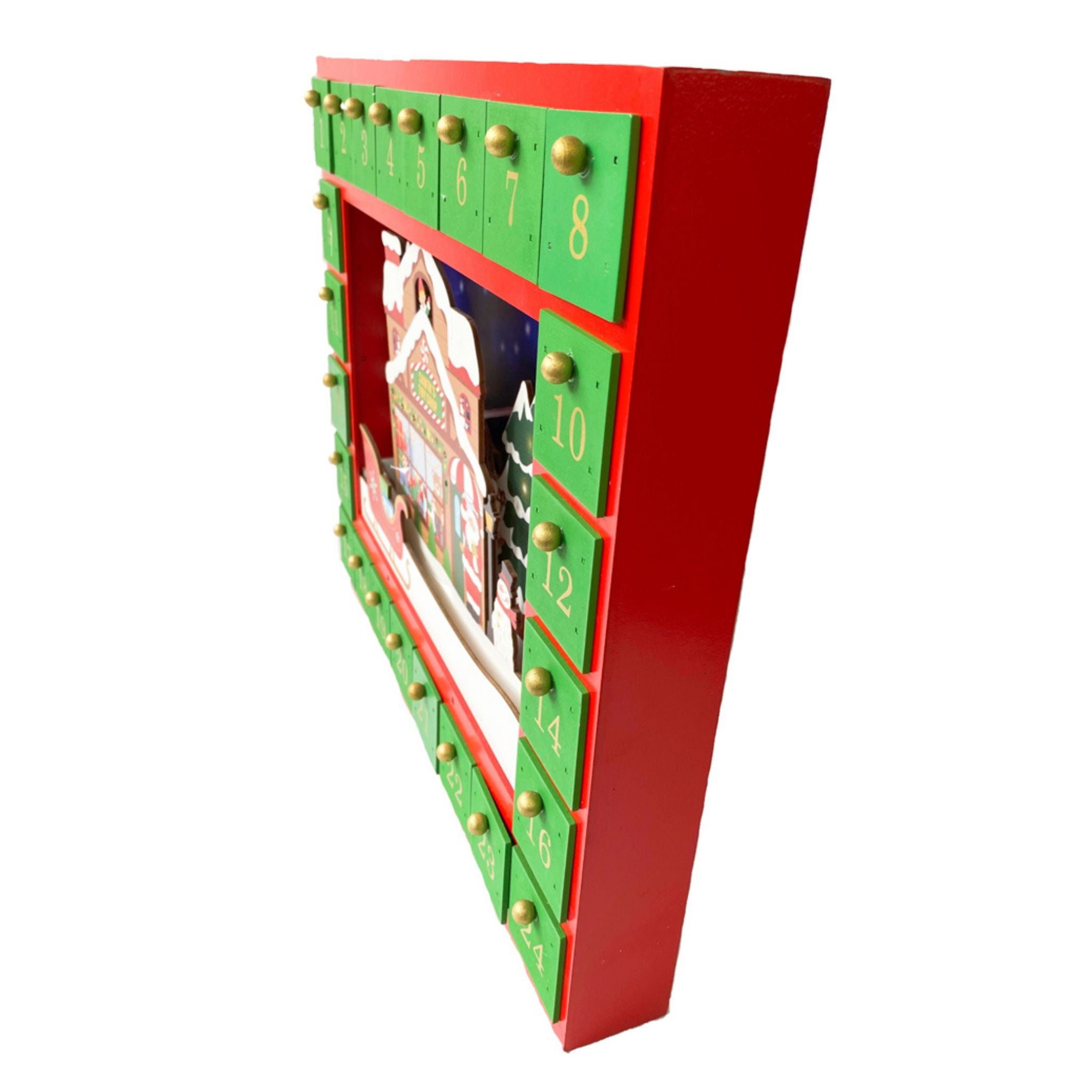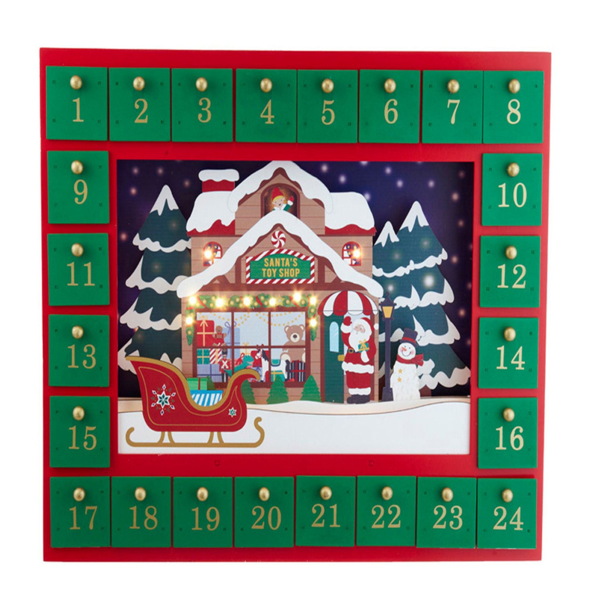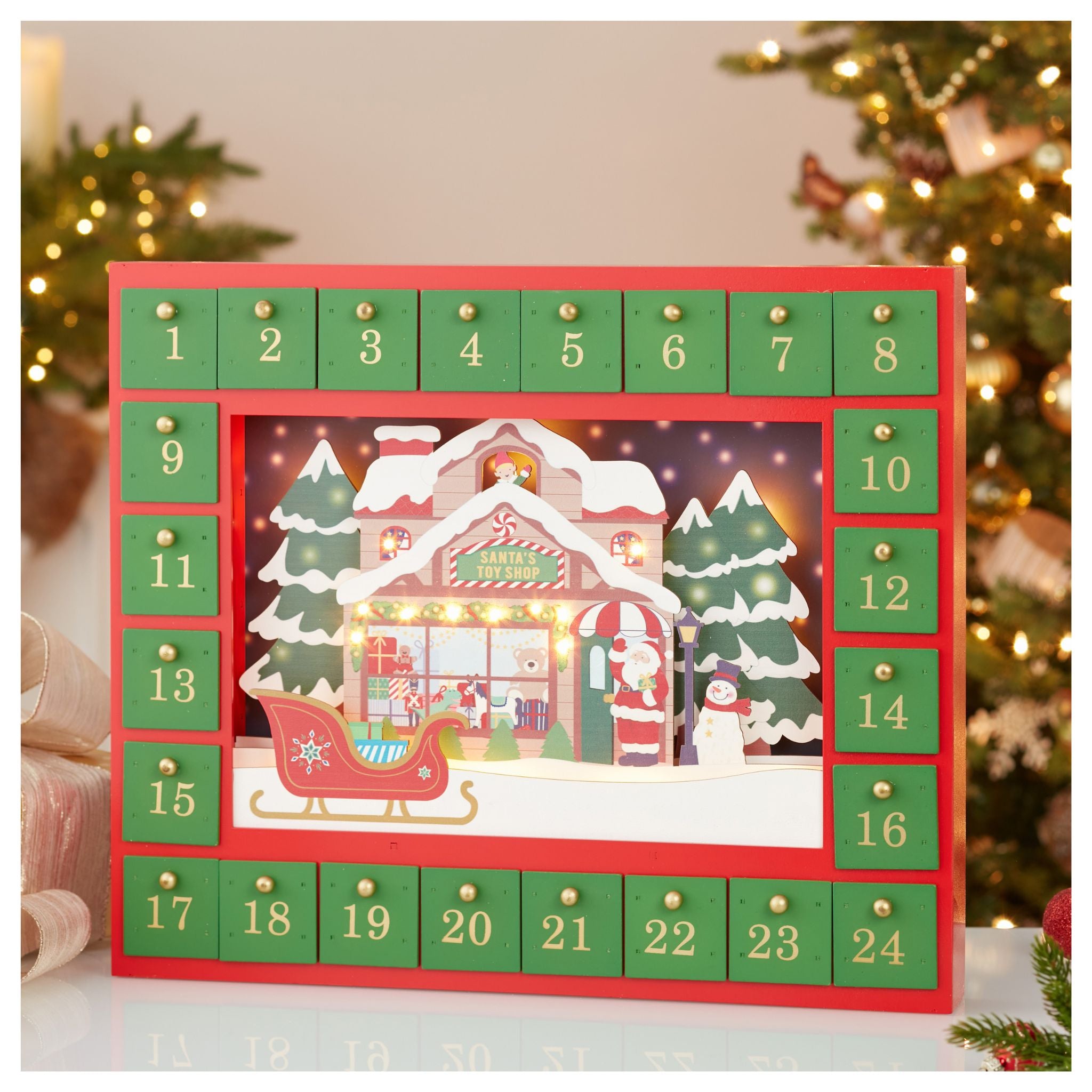 Count down the days until Christmas with this battery-operated LED Santa Toy Shop advent calendar! Its design features a toy shop scene pre-lit with 20 warm white LED lights and Santa. This Advent Calendar features 24 tiny numbered drawers. The empty drawers on the cabinet are individually numbered, ready for you to fill each drawer with a treat or a small trinket to enjoy as you open each one as you make your way towards Christmas Day!