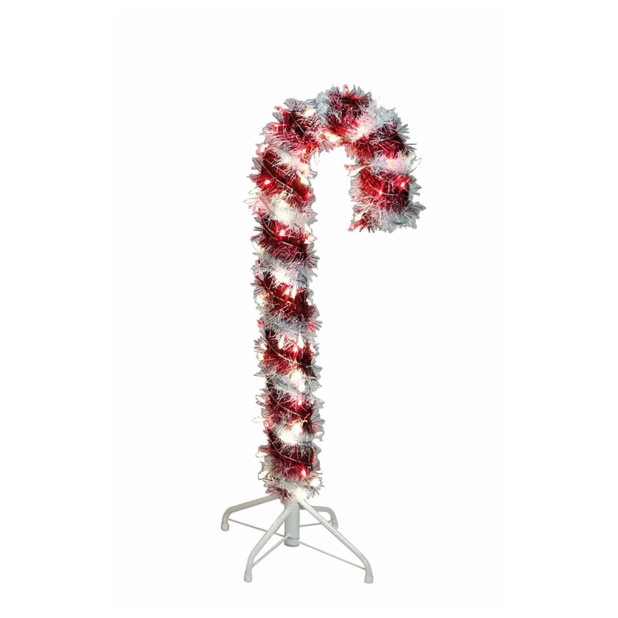 This 3' pre-lit red and white tinsel candy cane is a fun and festive addition to any home or office holiday décor. This red and white candy cane features 50 red and 50 warm white LED lights on a clear wire and stands 3 feet tall with a white metal folding base.