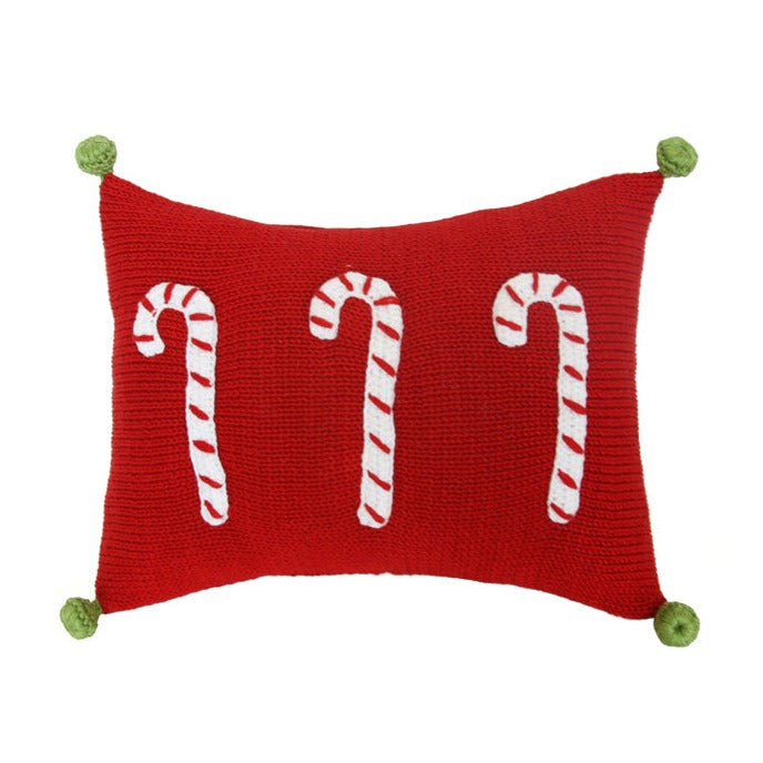 - Red pillow hand-embroidered with classic red and white striped candy canes