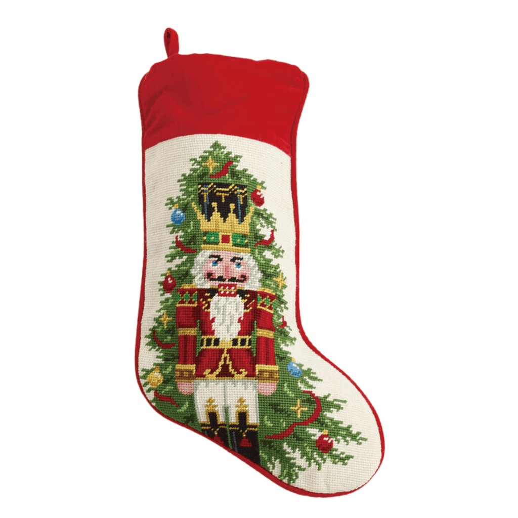 Celebrate the holidays with this adorable stocking! This festive stocking features a nutcracker in front of a Christmas tree in a lovely needlepoint design. This beautiful stocking will make a statement on your mantle. Please note holiday items cannot be returned. Click image for greater detail.