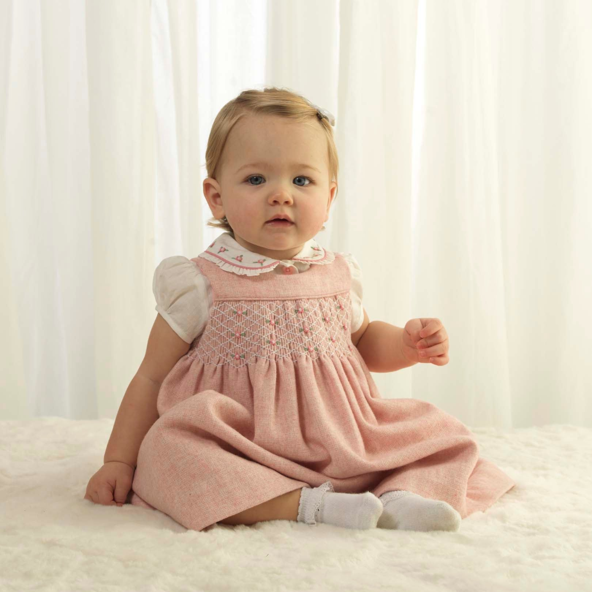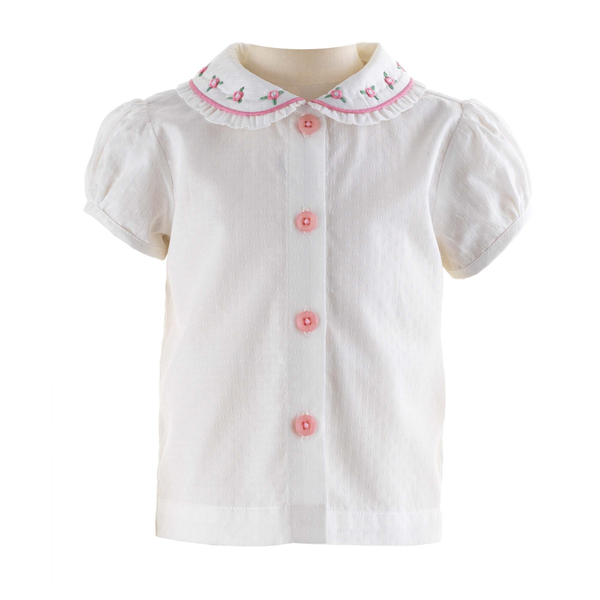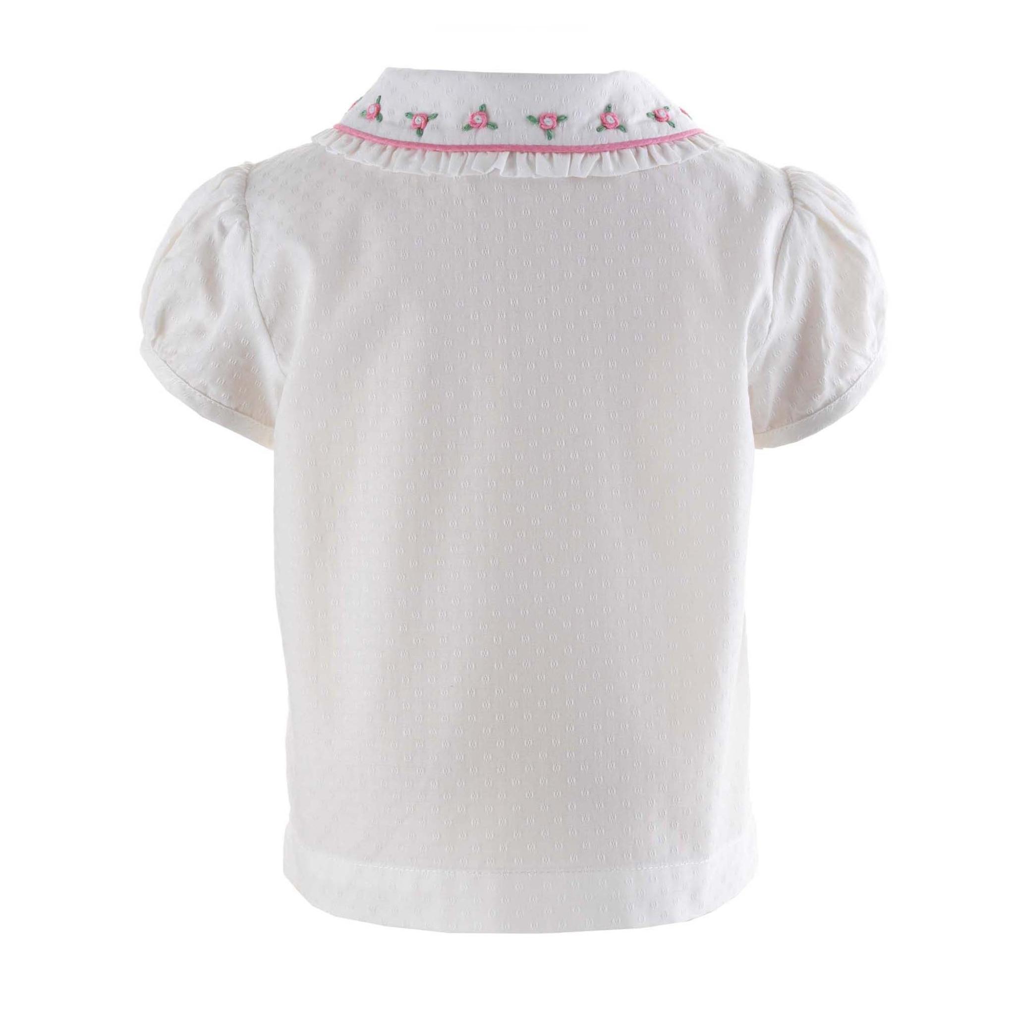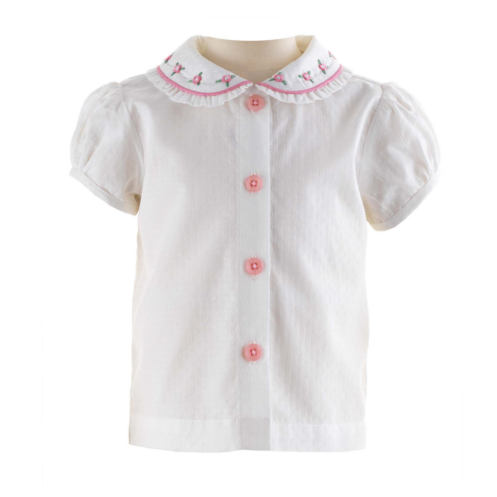 Puff-sleeved blouse in ivory textured cotton fabric, hand embroidered with sweet little rosebuds around the collar, trimmed with frill and pink piping at the collar edge and matching pink buttons.