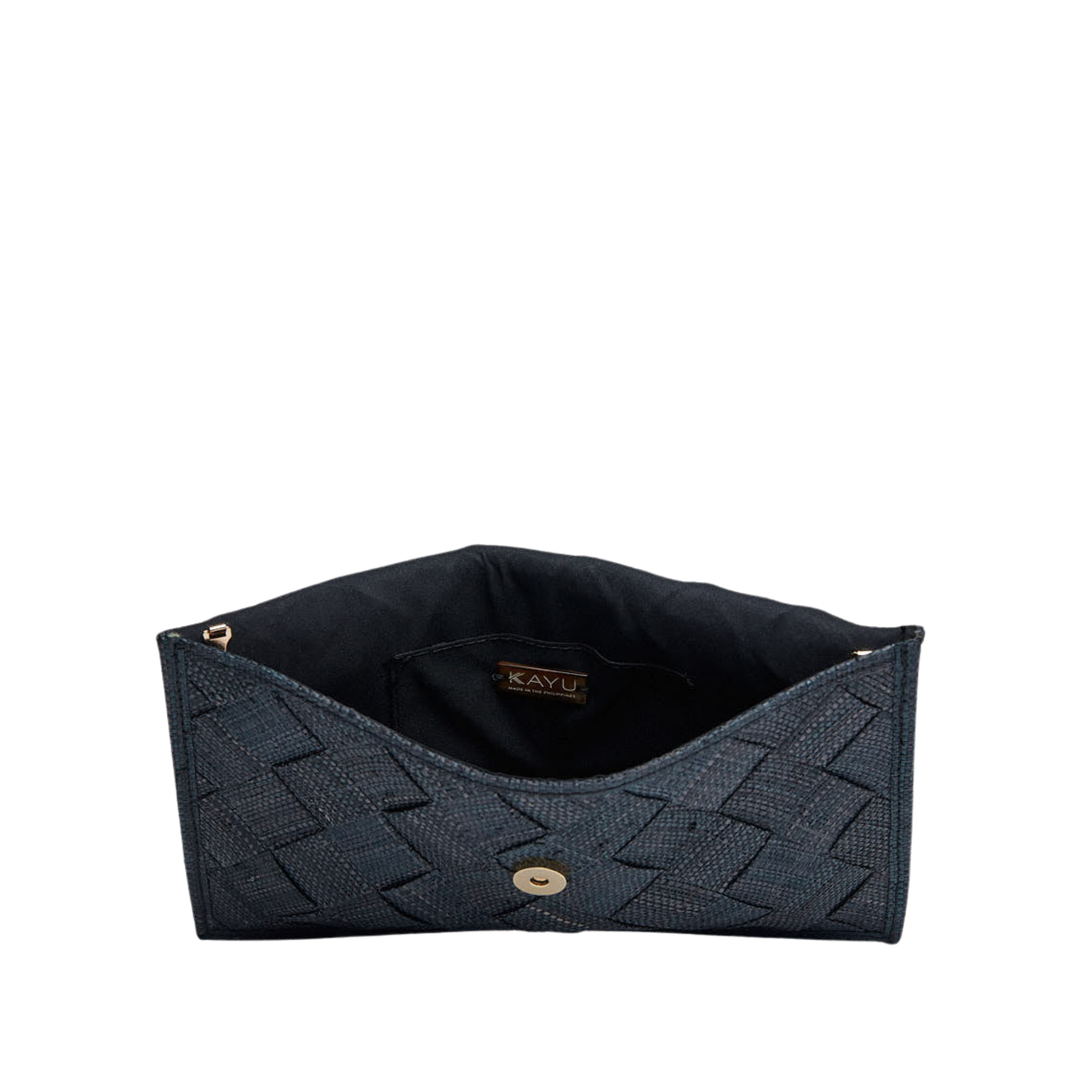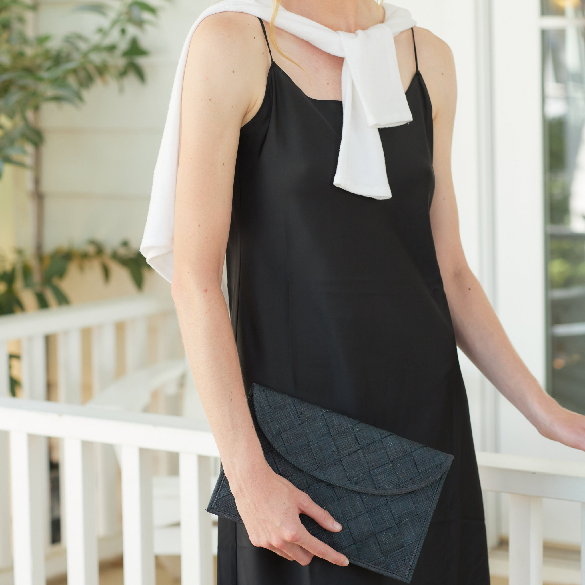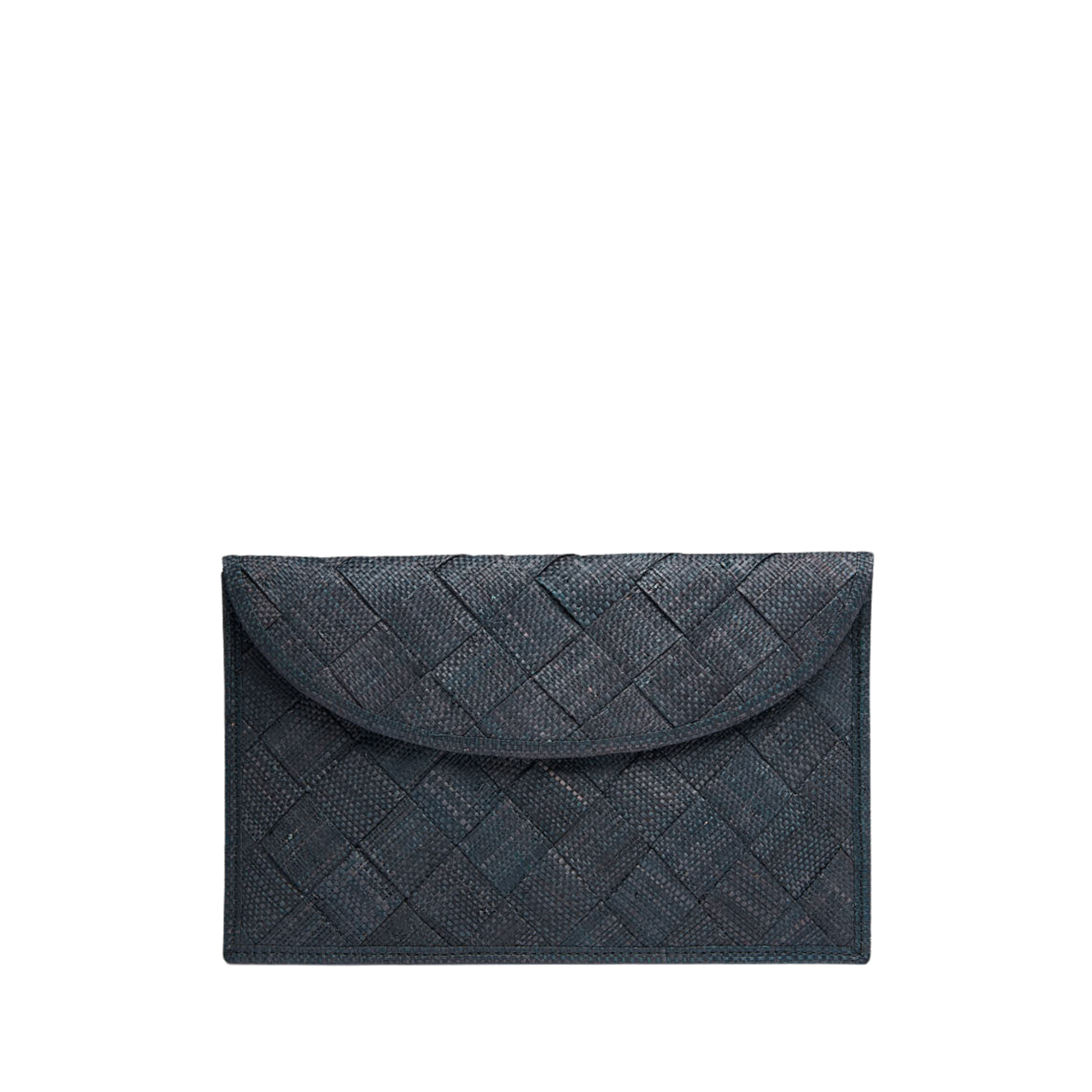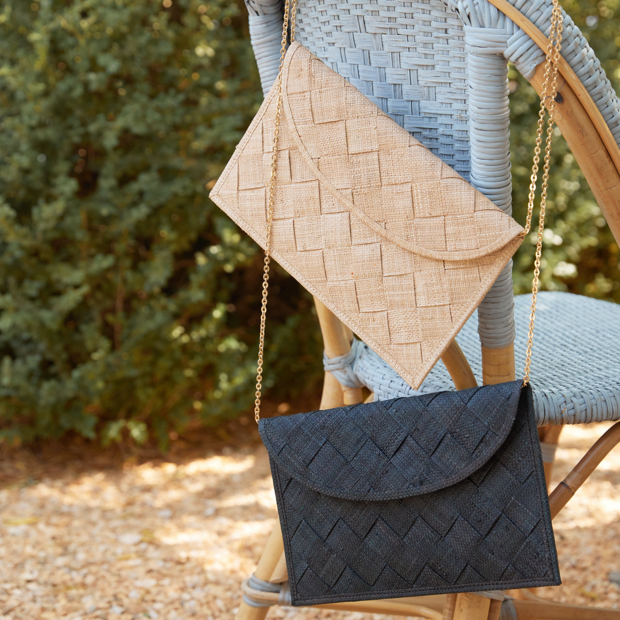 Intricately woven strips of raffia, adorned with a gold chain strap, for an envelope clutch that blends artistry and sustainability.