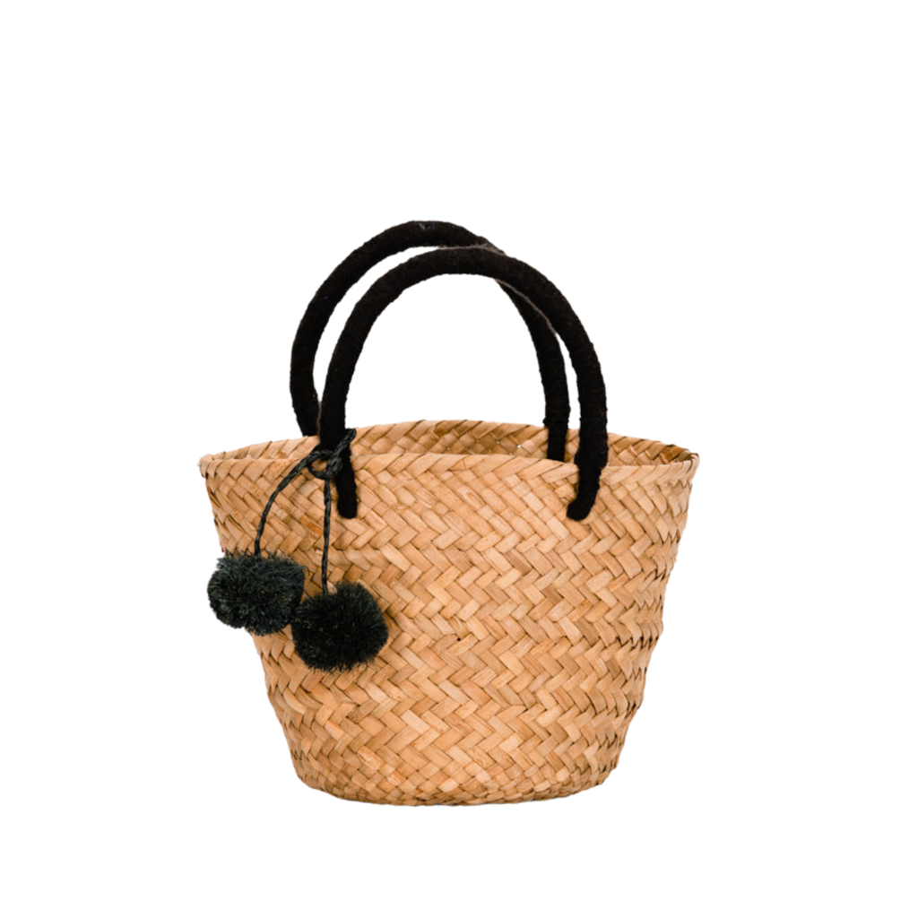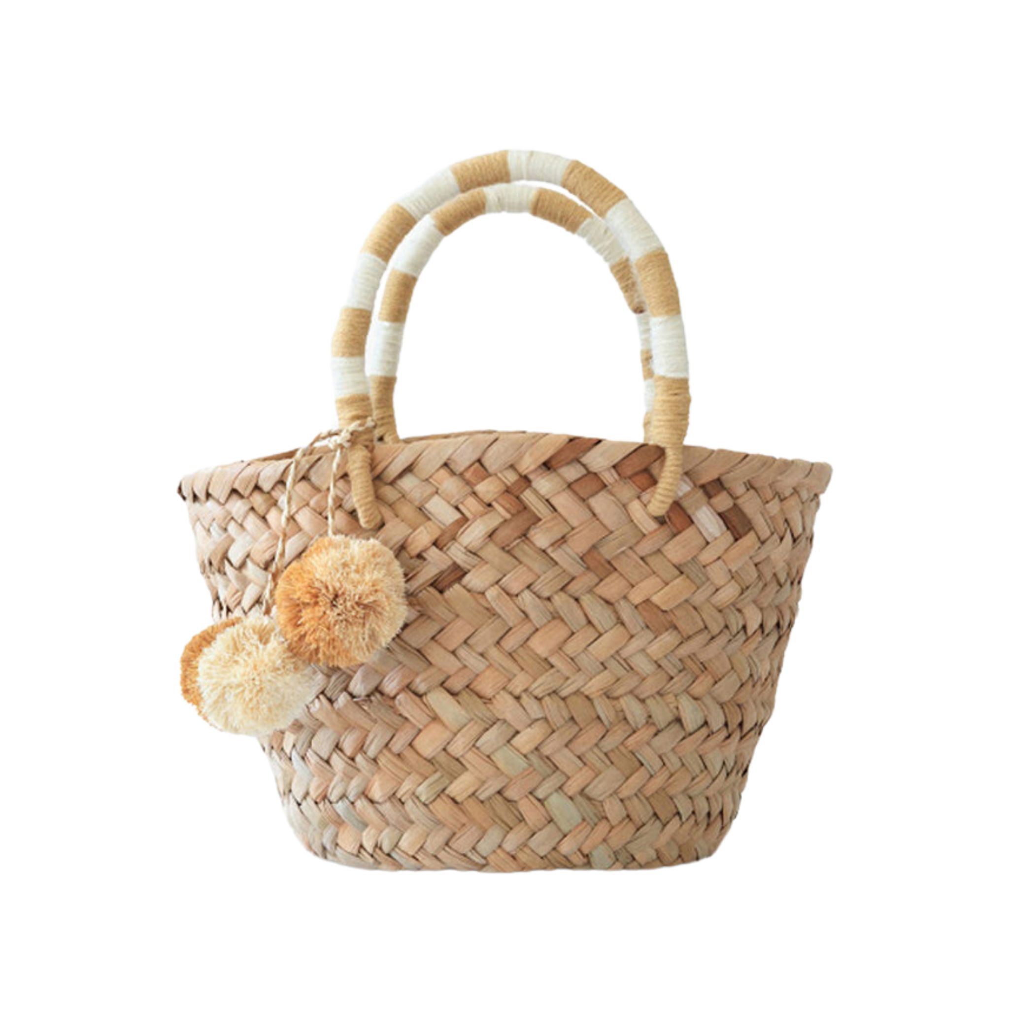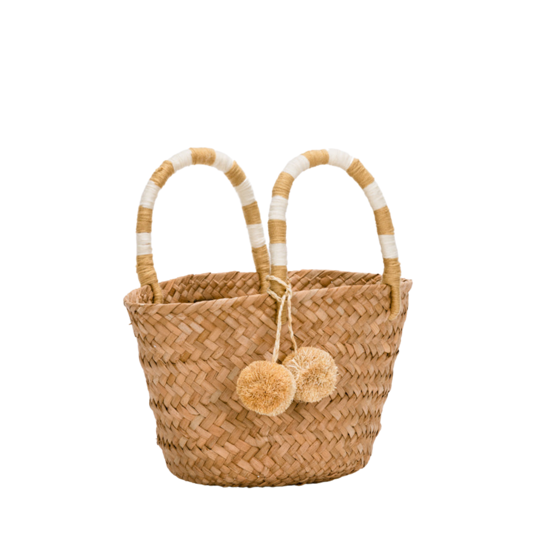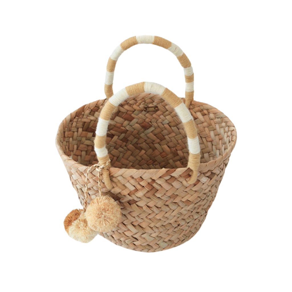 • Features yarn-wrapped handles with coordinating raffia pompoms.