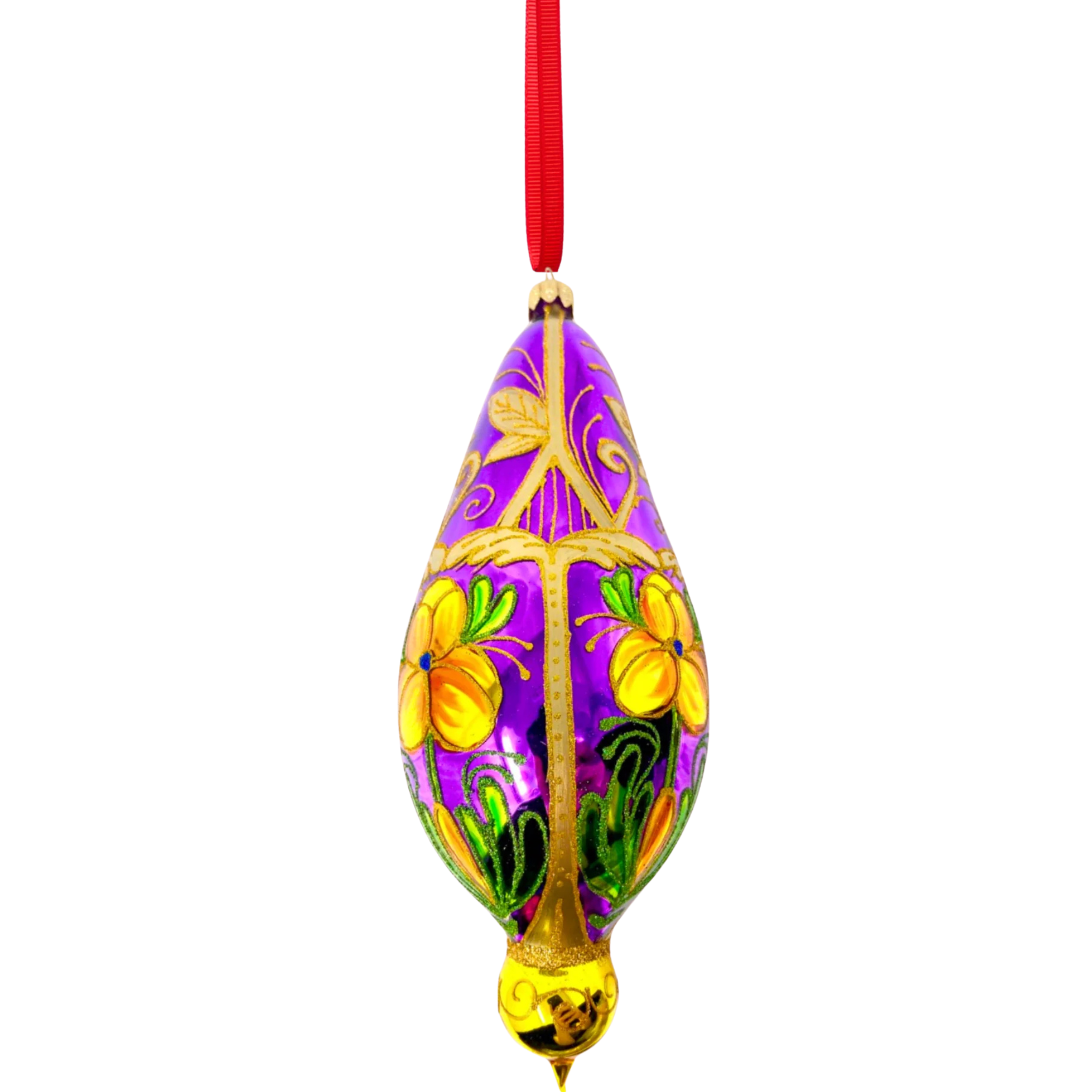 Bright and elegant, this glass ornament showcases vivid yellow primroses blooming against a rich violet backdrop, evoking the beauty of a twilight garden. Delicate gold filigree accents shimmer across the surface, adding a touch of regal sophistication and refined sparkle. A perfect blend of bold color and intricate detail, this ornament brings floral grace and timeless charm to any holiday setting.