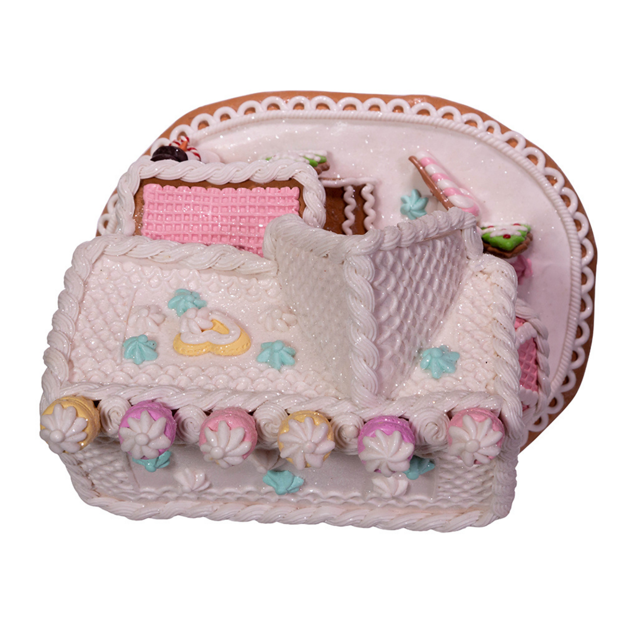 Add a sweet touch to your holiday décor with this 9" Battery-Operated Gingerbread LED Cake House table piece from Kurt Adler. This table piece features a gingerbread cake house with a cupcake and frosting roof, gingerbread cookies and peppermint columns. This piece is glittered throughout for a sugared effect.