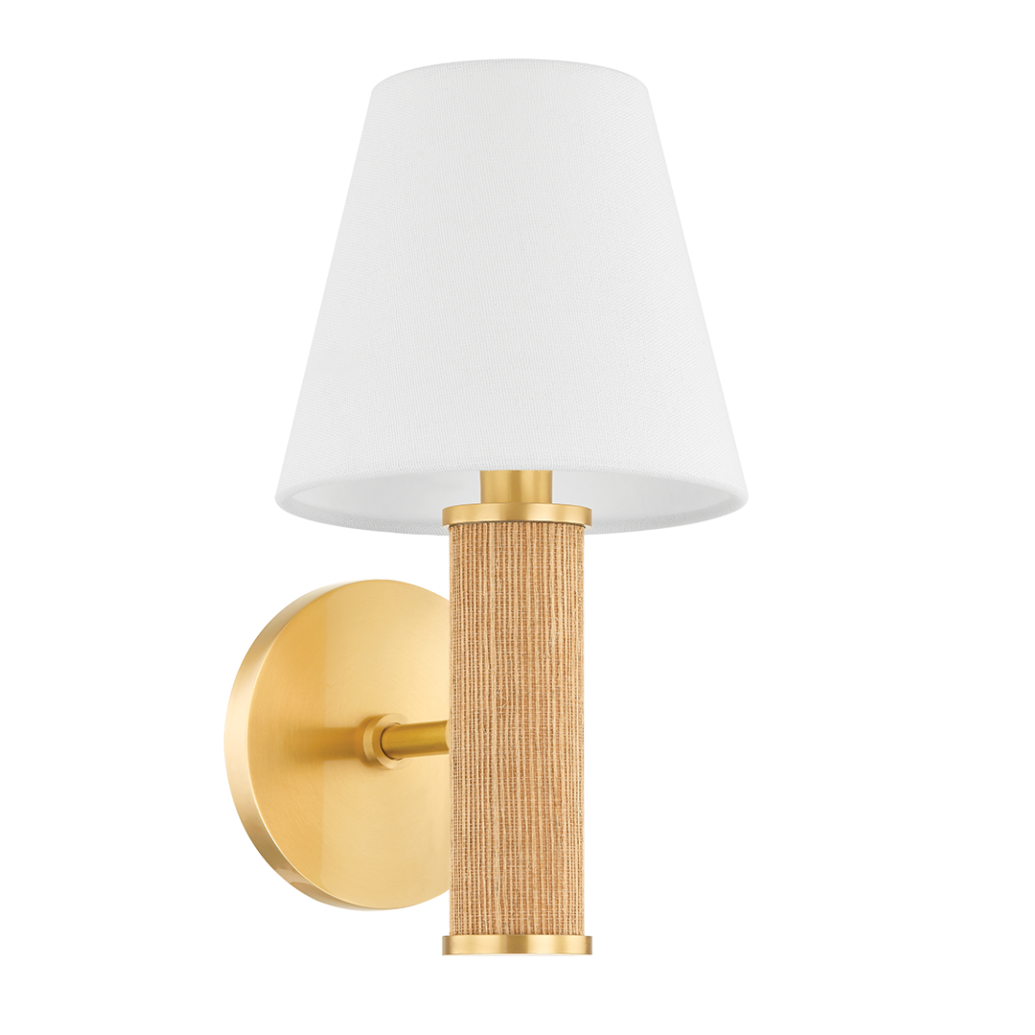 Bring a little sunshine into your space with Amabella. Inspired by resort design, the one light wall sconce moves between modern and coastal by mixing tone and texture. Grasscloth wraps around the tubular form, contrasted with aged brass accents. Exposed bulbs add a more contemporary quality to the piece.