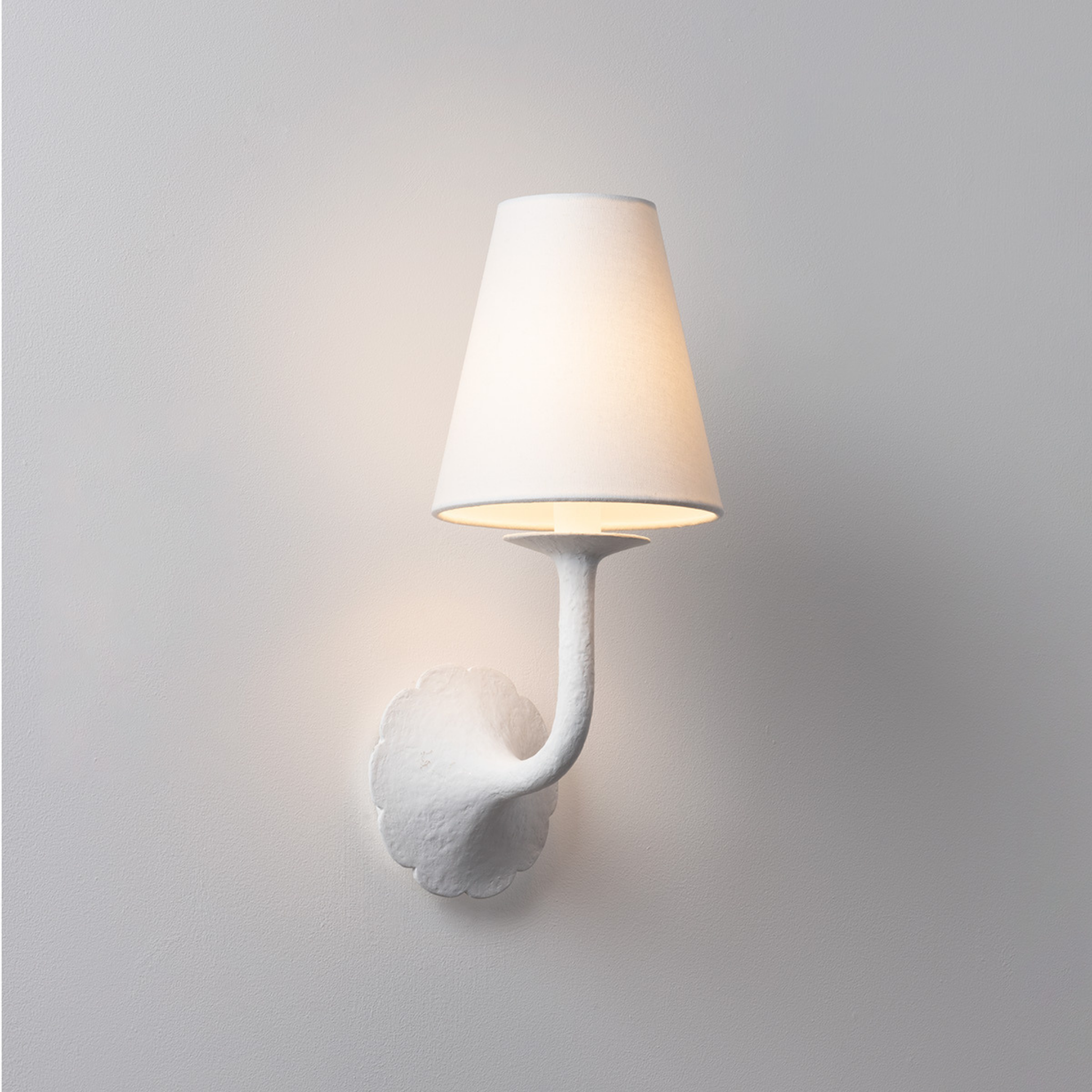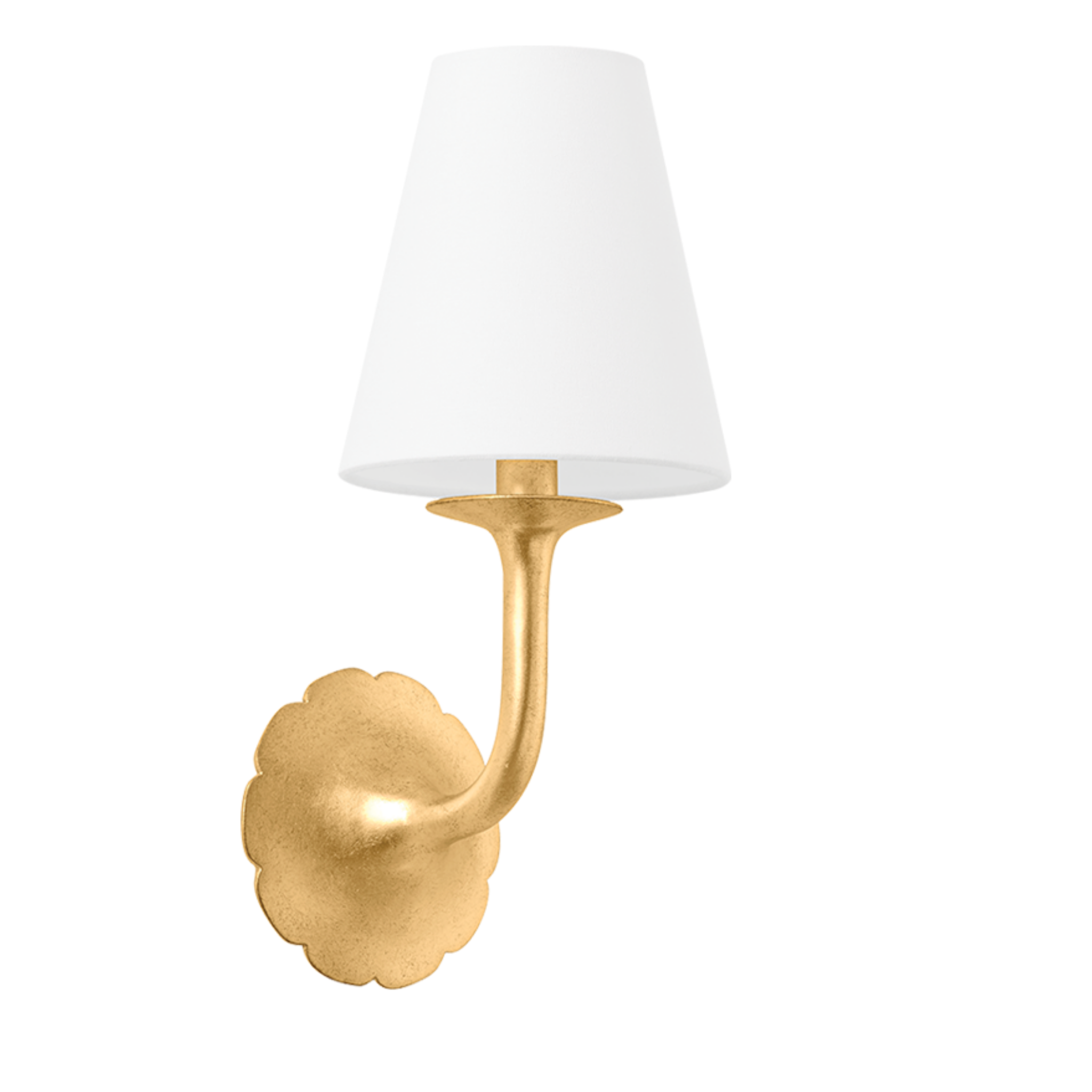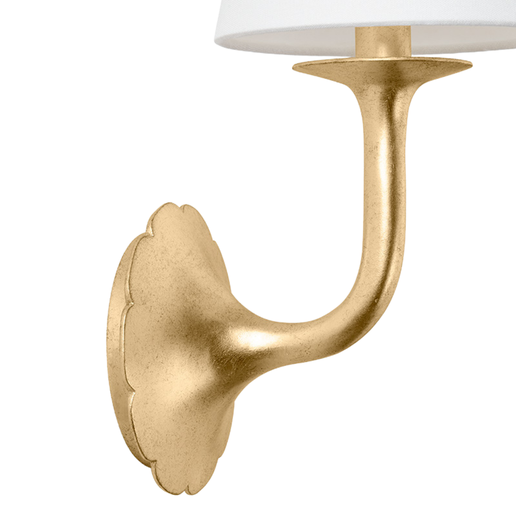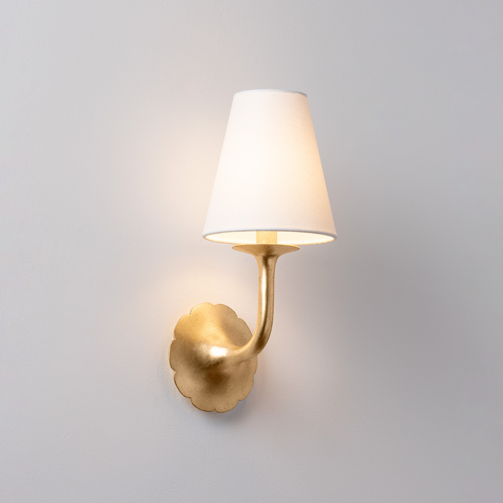Inspired by a flower in bloom, the charming Winnipeg sconce features delicate scalloped edges and a tailored silhouette. The botanical backplate swoops elegantly upwards to cradle the light source, which glows through a tapered white linen shade. A White Plaster finish imparts a chic, contemporary feel, while the Vintage Gold Leaf is refined and classic.