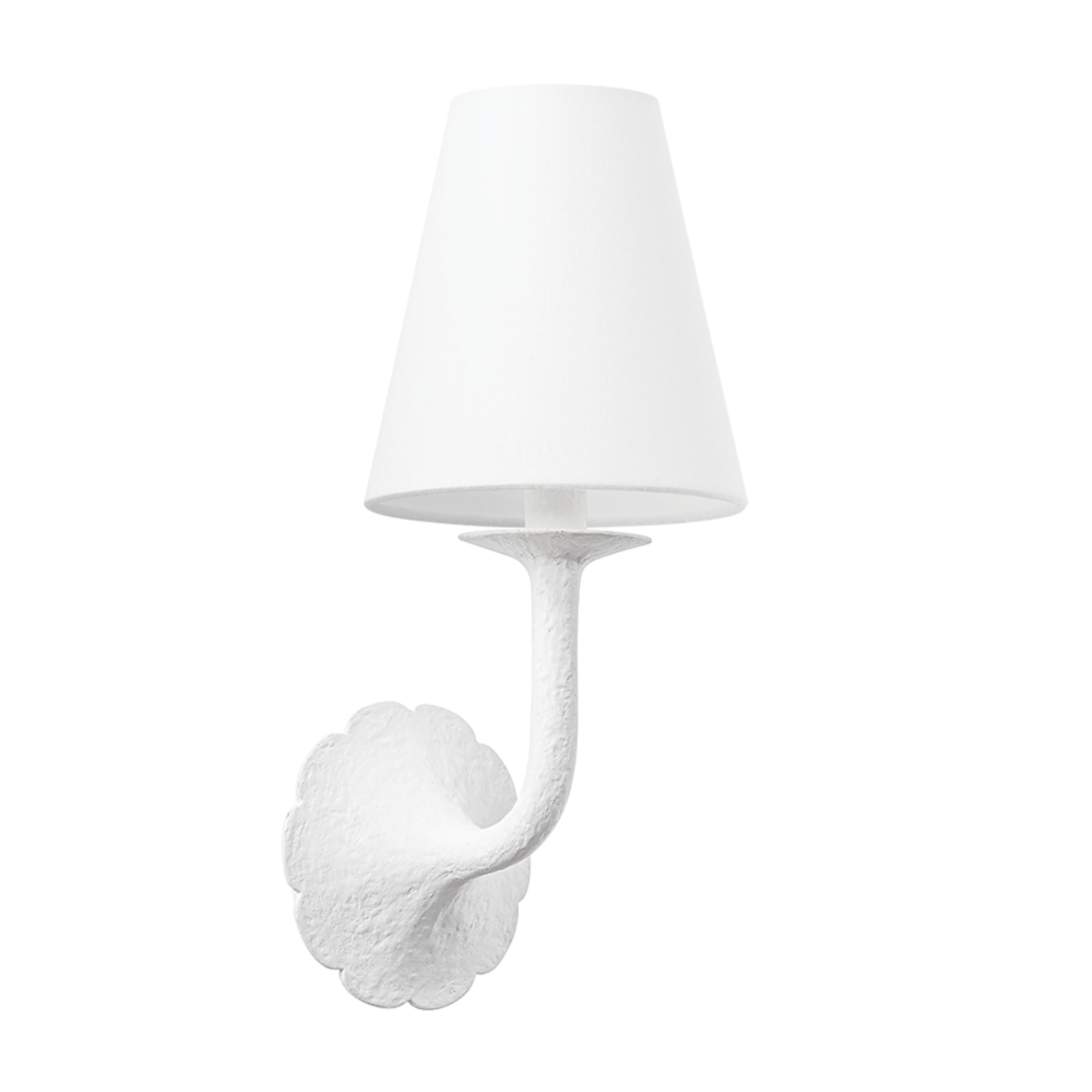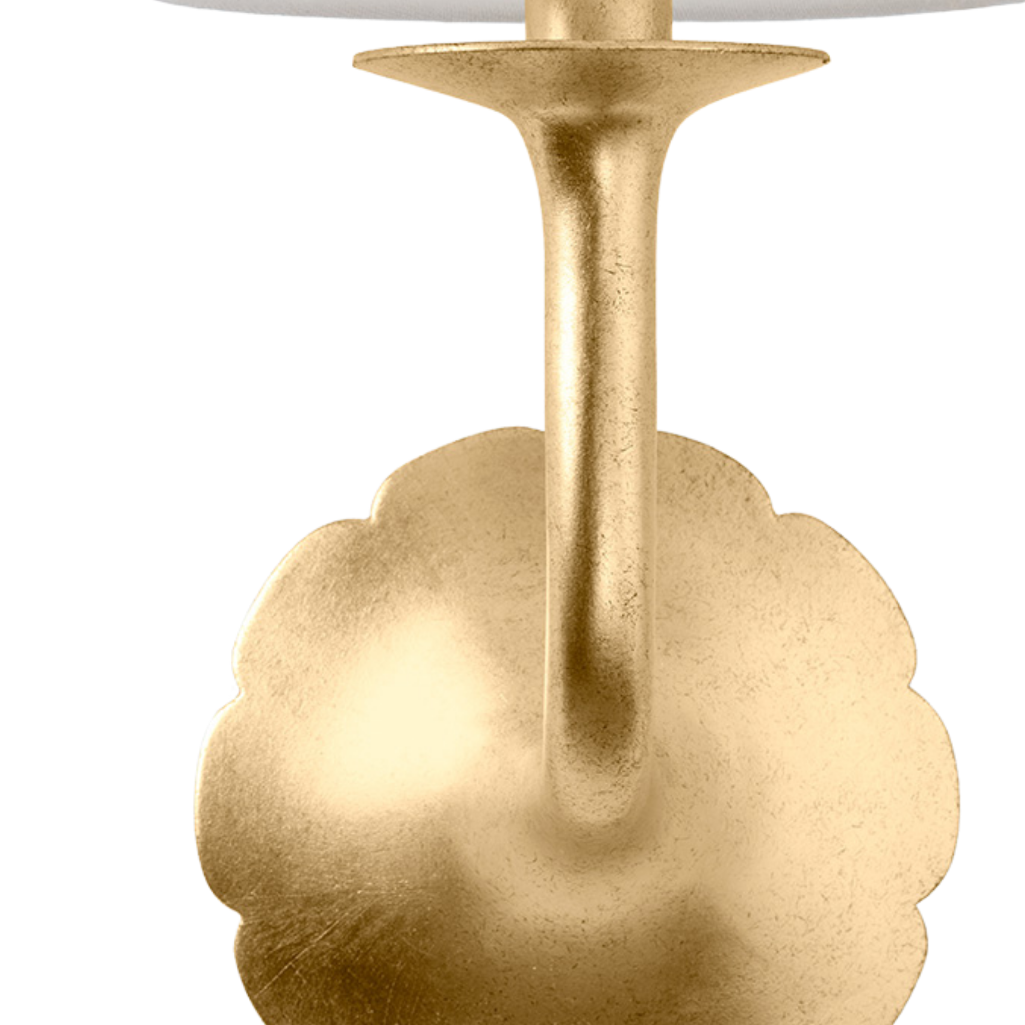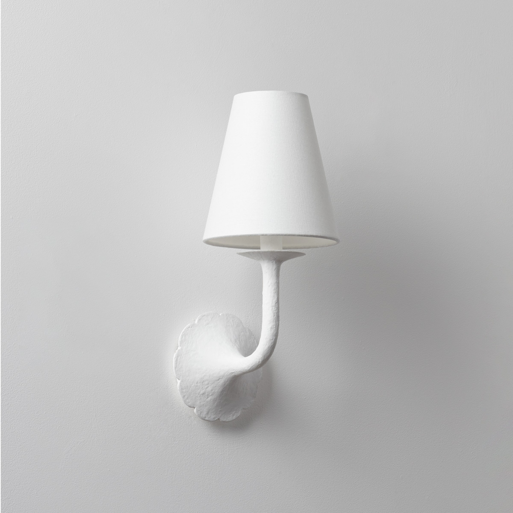 Inspired by a flower in bloom, the charming Winnipeg sconce features delicate scalloped edges and a tailored silhouette. The botanical backplate swoops elegantly upwards to cradle the light source, which glows through a tapered white linen shade. A White Plaster finish imparts a chic, contemporary feel, while the Vintage Gold Leaf is refined and classic.