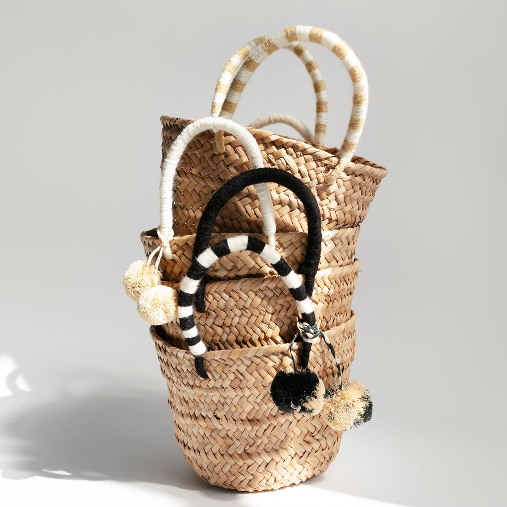 • Features yarn-wrapped handles with coordinating raffia pompoms.
