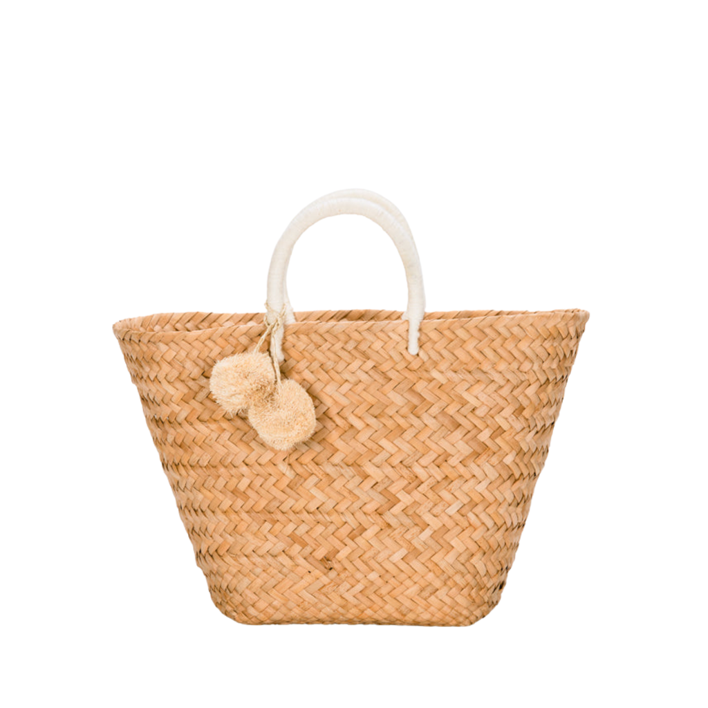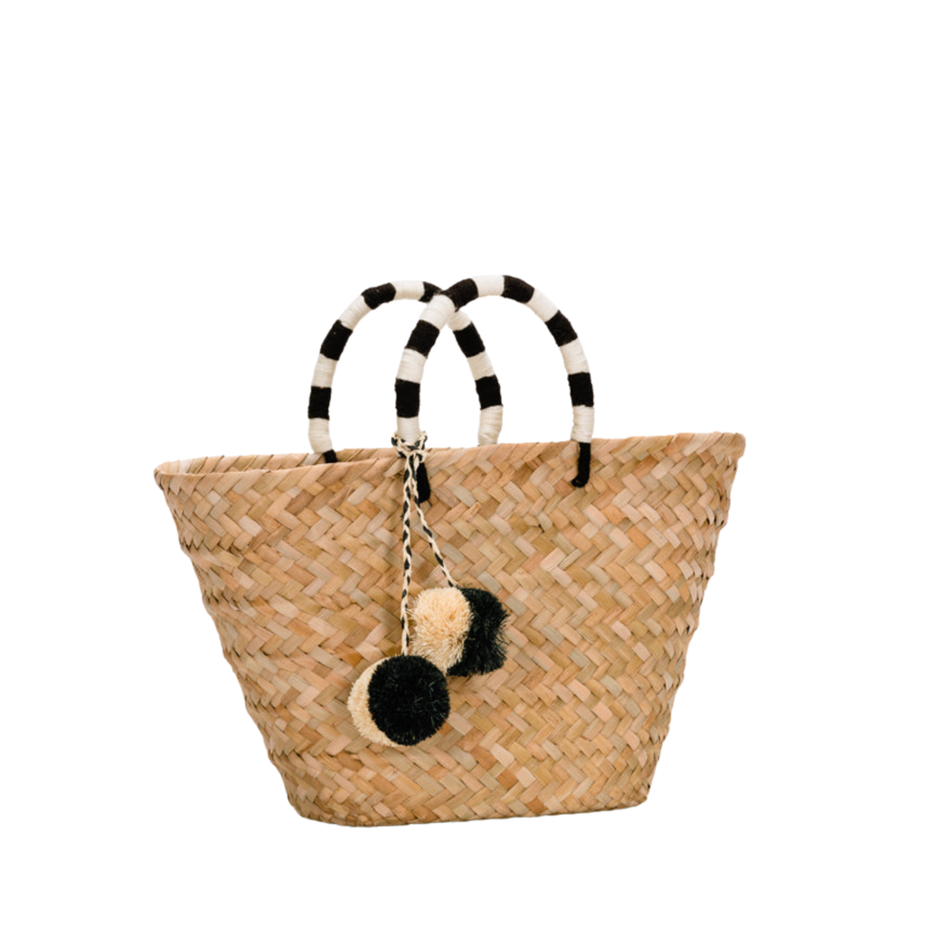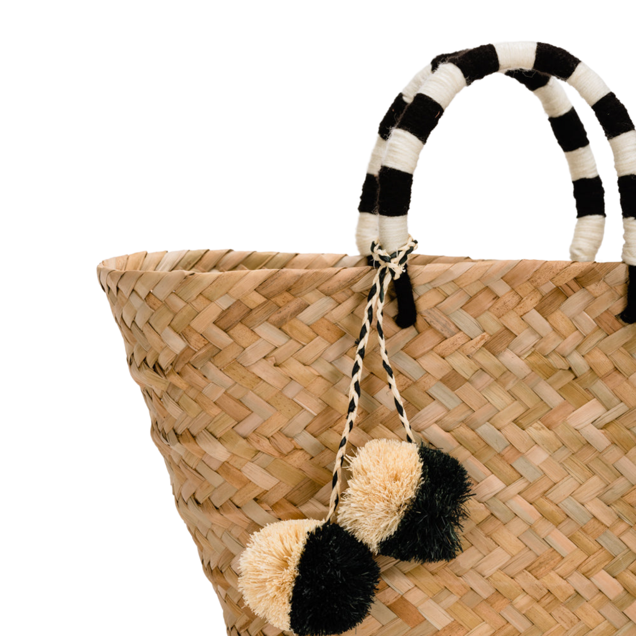 - Features yarn-wrapped handles with coordinating raffia pompoms.