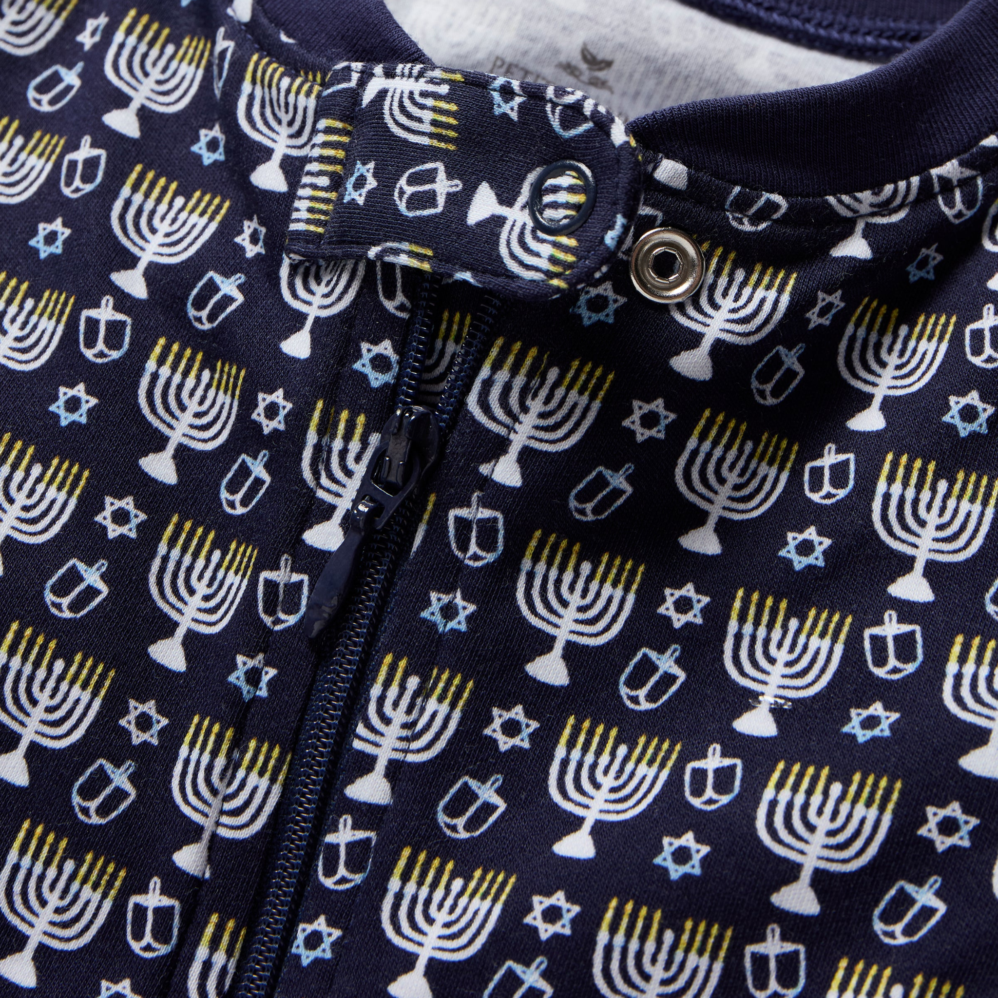 Celebrate the Festival of Lights with this classic navy and white print featuring menorahs and dreidels. A nod to timeless traditions, and a keepsake style to honor new memories as families draw near. The bestselling Pima snug fit design will keep you comfortable as temperatures dip. Crafted with love and attention to detail, this 100% Peruvian Pima Cotton romper combines cuteness, functionality, and softness, ensuring your baby looks and feels their best throughout their day. From charming prints and patterns designed to coordinate with the whole family, this piece is sure to capture hearts and bring a smile to your day.
