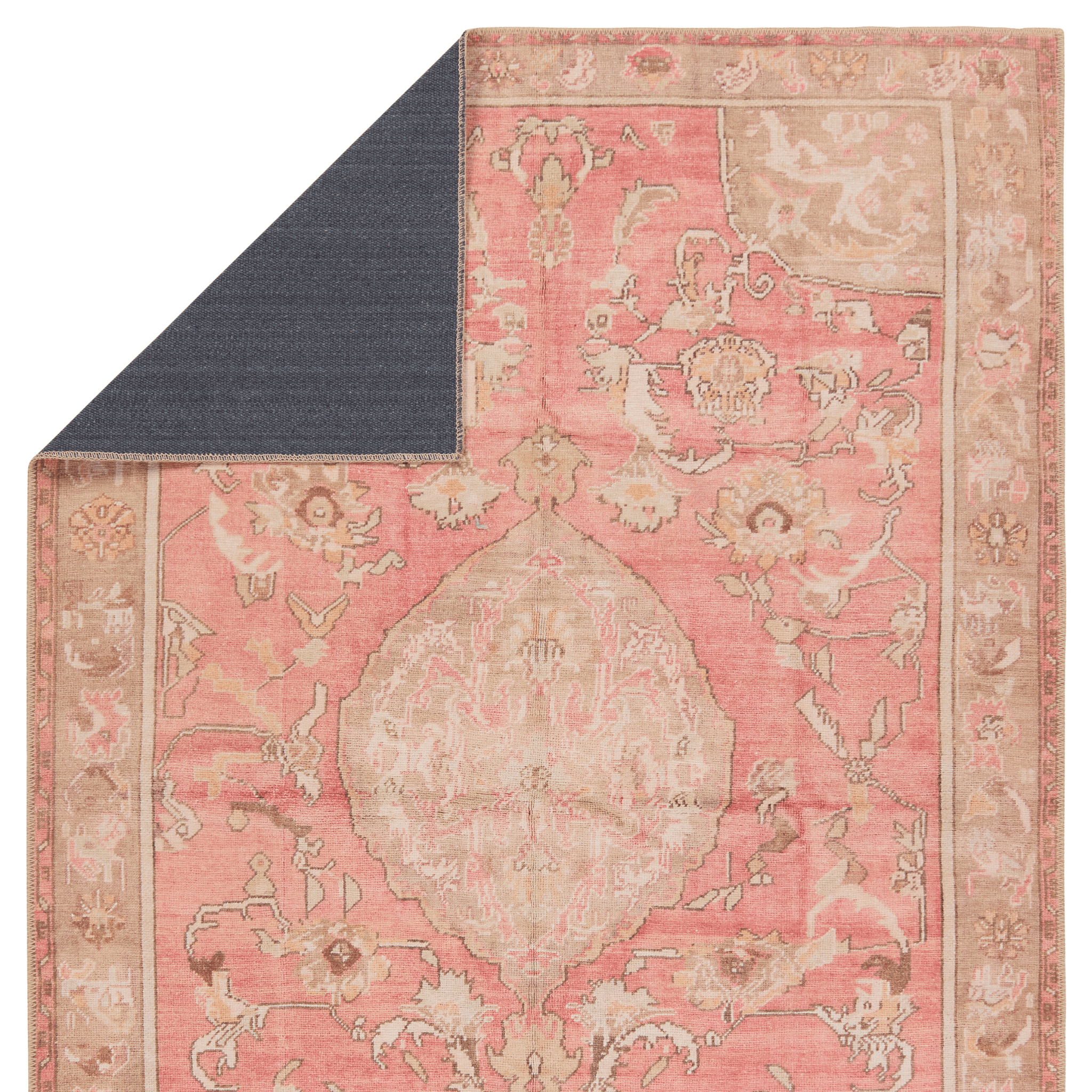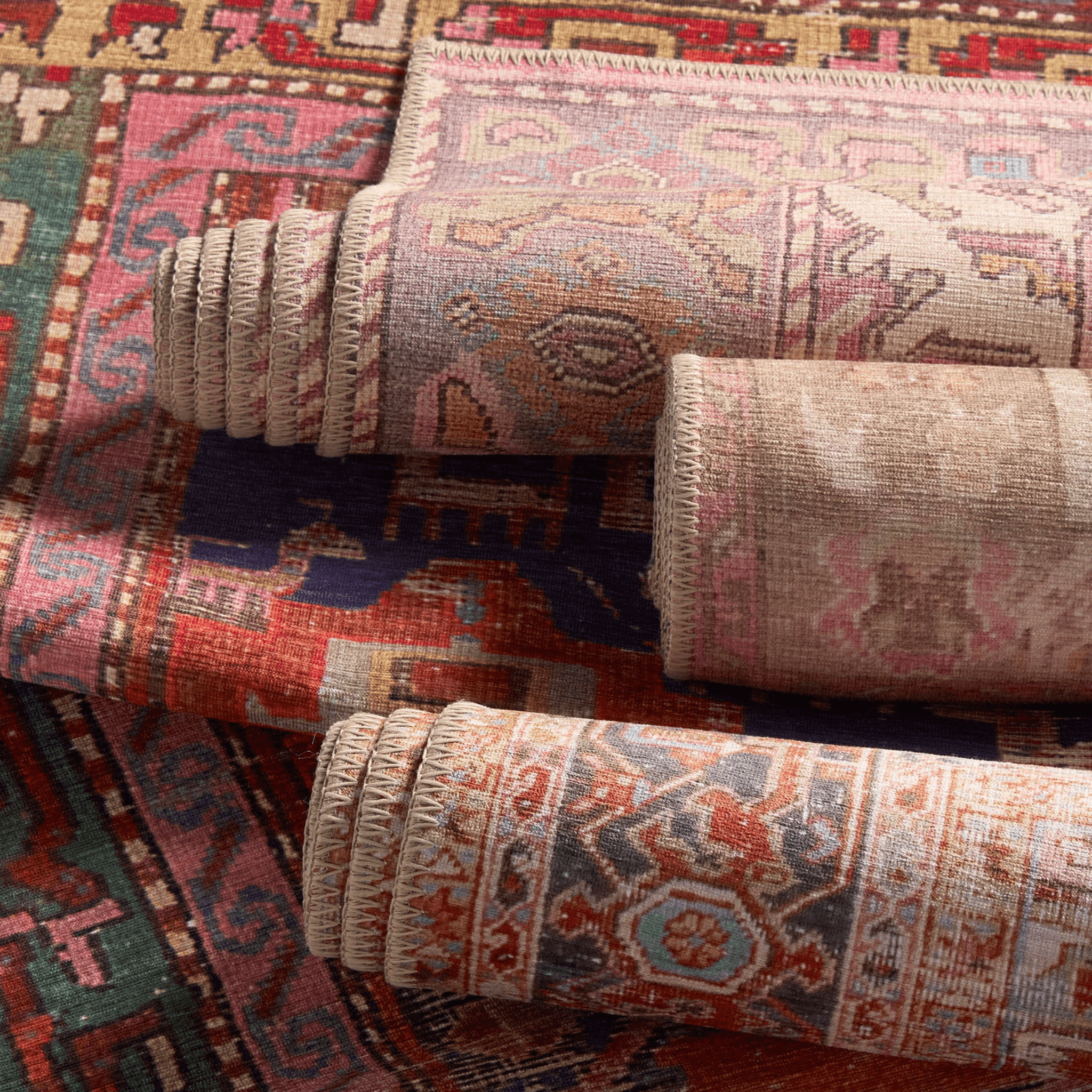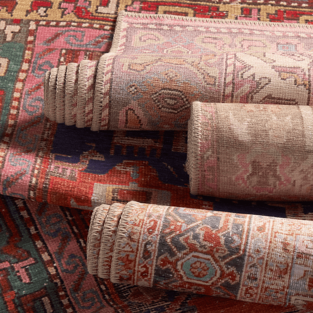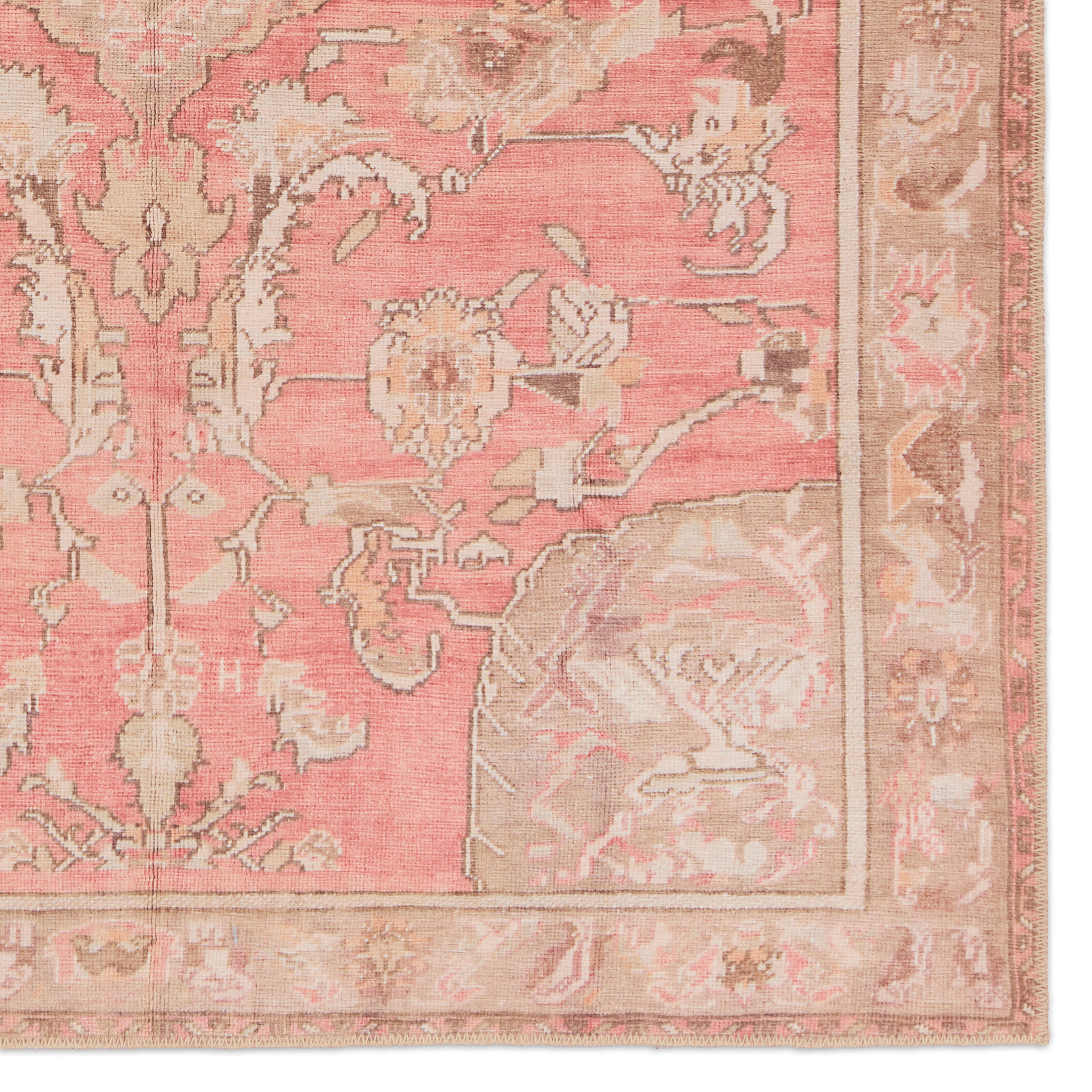 These rugs emulate the well-worn details and the beautiful abrash nature of antique textiles. Showcases a center medallion and intricate border with tribal and floral details throughout. Shades of pink and beige dominate this rug with gray and light orange accent colors. This digital design is printed onto the 1/5th inch thick, polyester base, cut, and embellished with edge stitching. Easy-to-clean, perfect for any room in the home. Click images for greater detail.