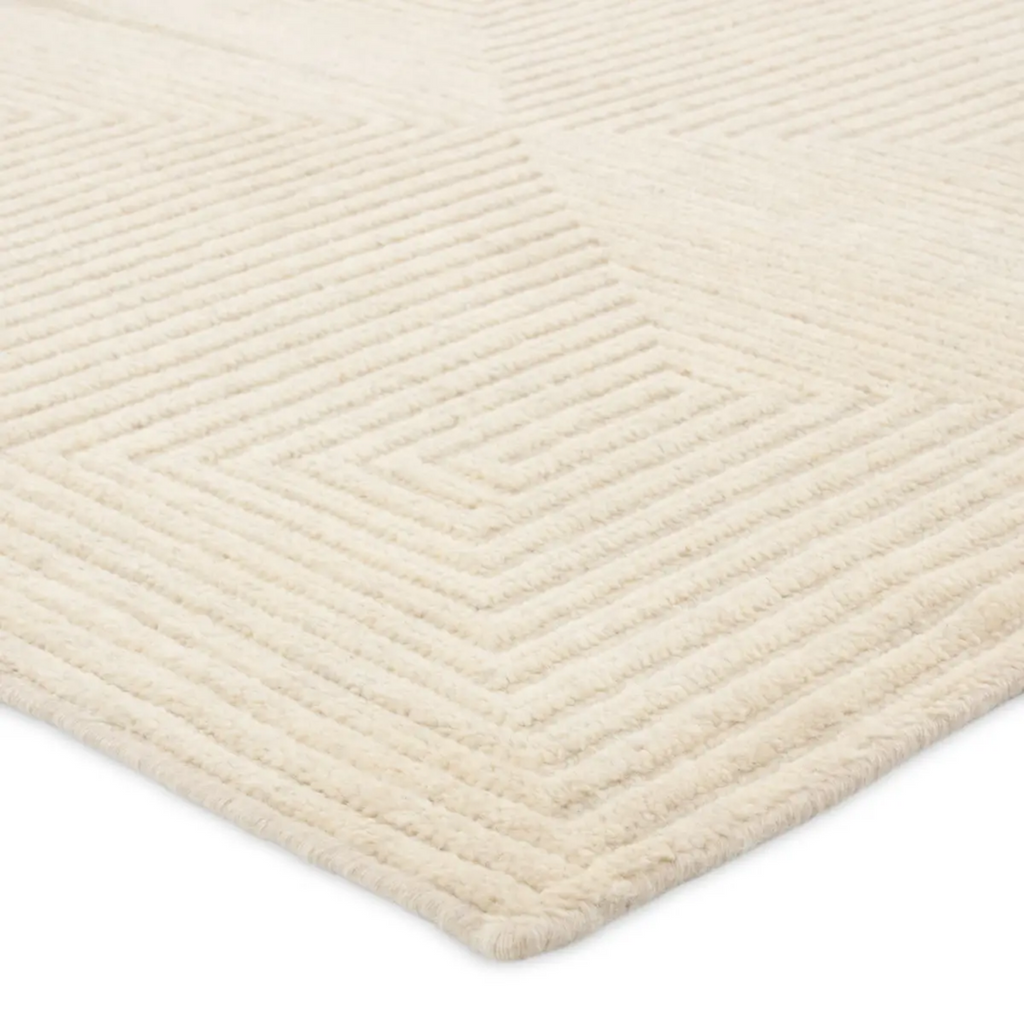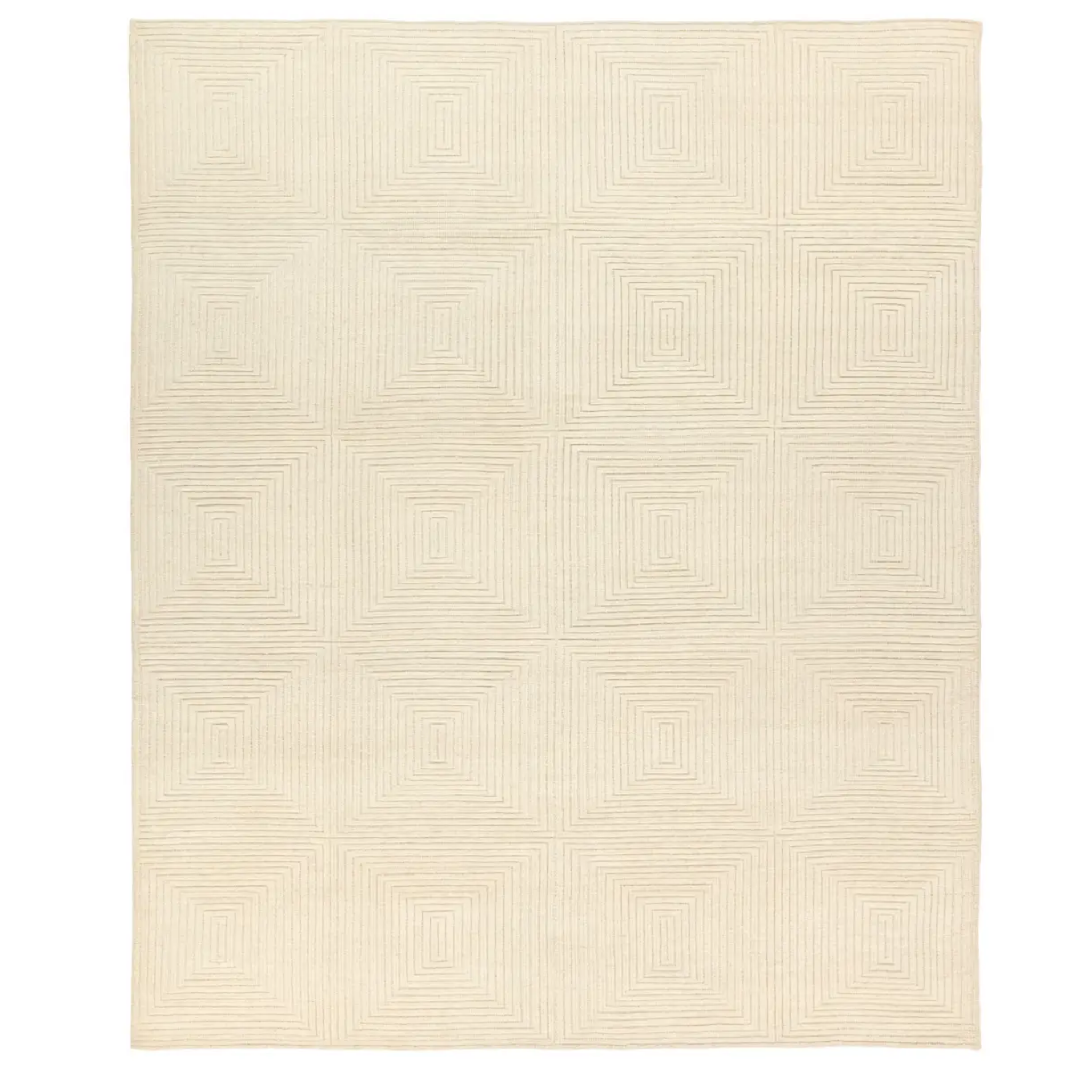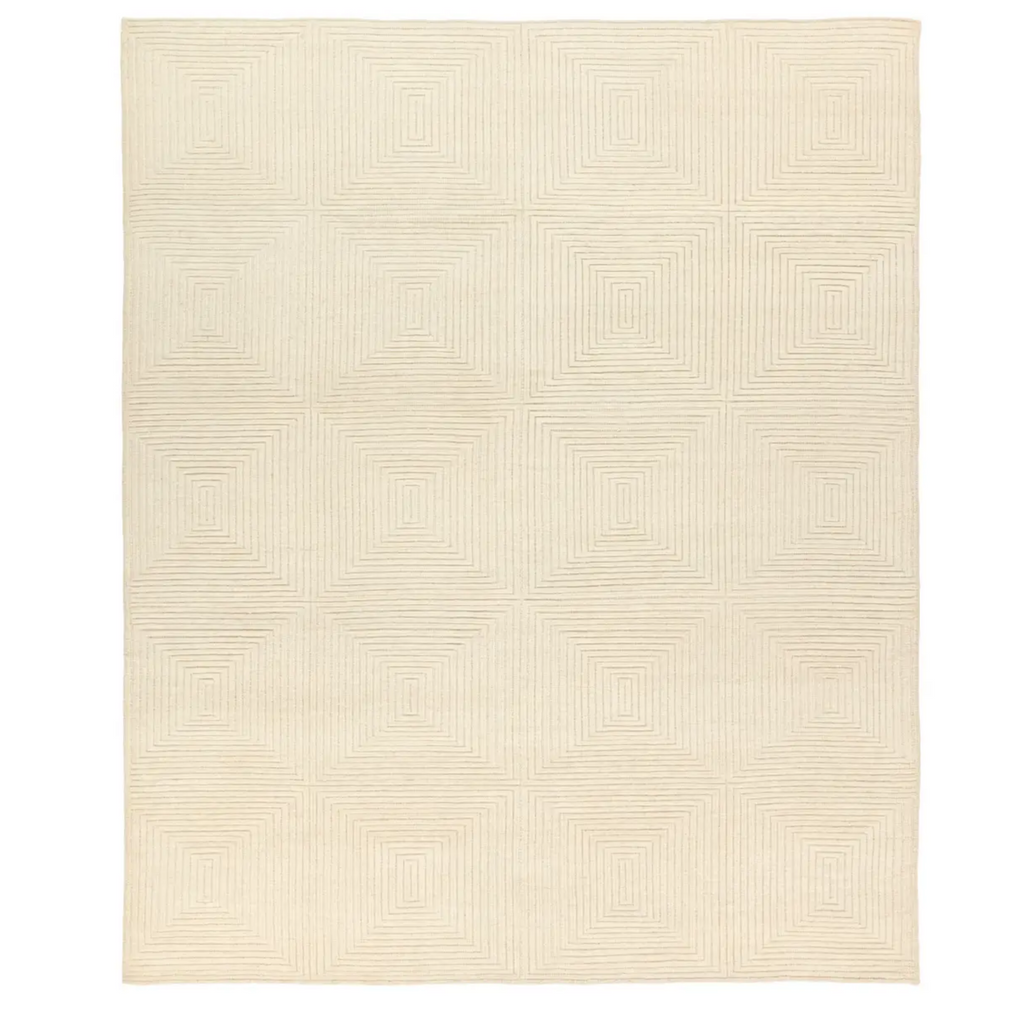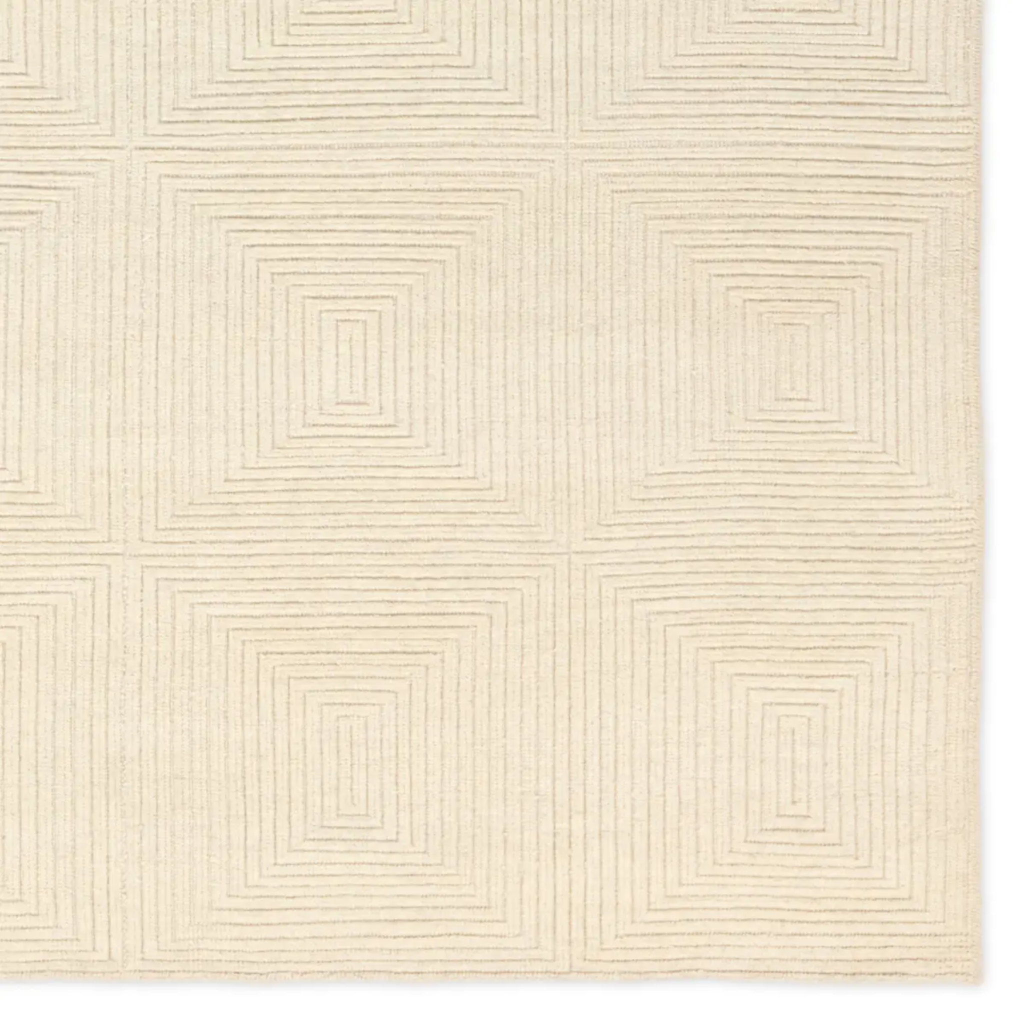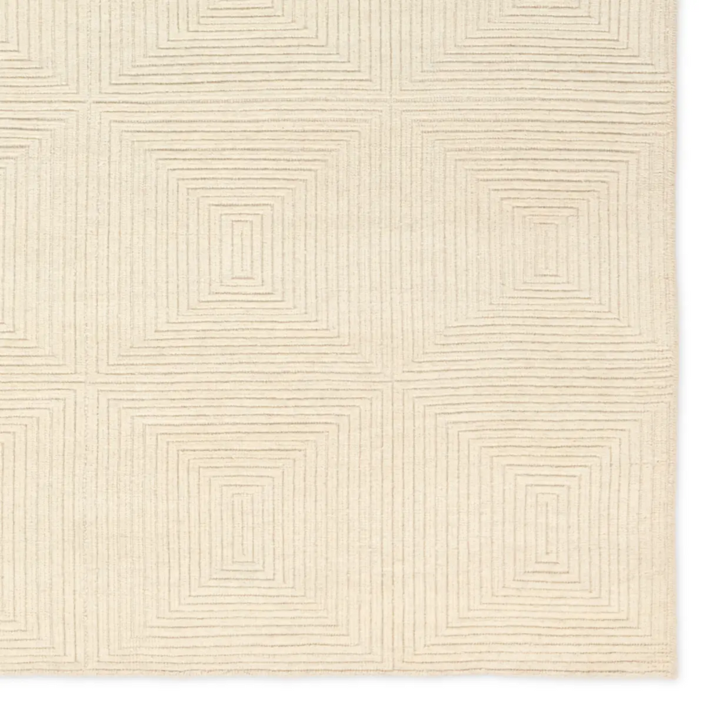 The Tasa collection features intriguing designs in solid hues, handknotted by artisans in India for durability and quality. The Adowa rug showcases geometric tile design created with alternating high and low pile. Short, wool pile in a neutral cream hue provides a grounding accent piece in high traffic areas of the home such as halls, entryways, and living rooms.