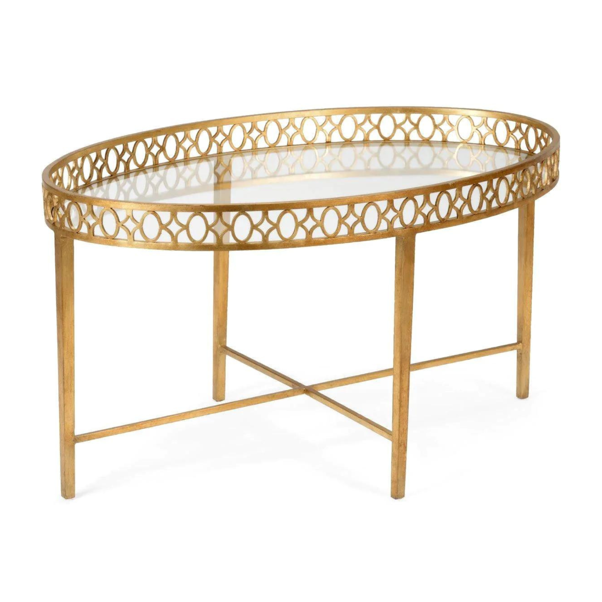 This elegant cocktail table is made of iron and glass. Its antique gold leaf finish adds a sophisticated touch to modern and traditional interiors alike. Measures 39.5w x 24.5d x 21.8h. Click on images for greater detail.