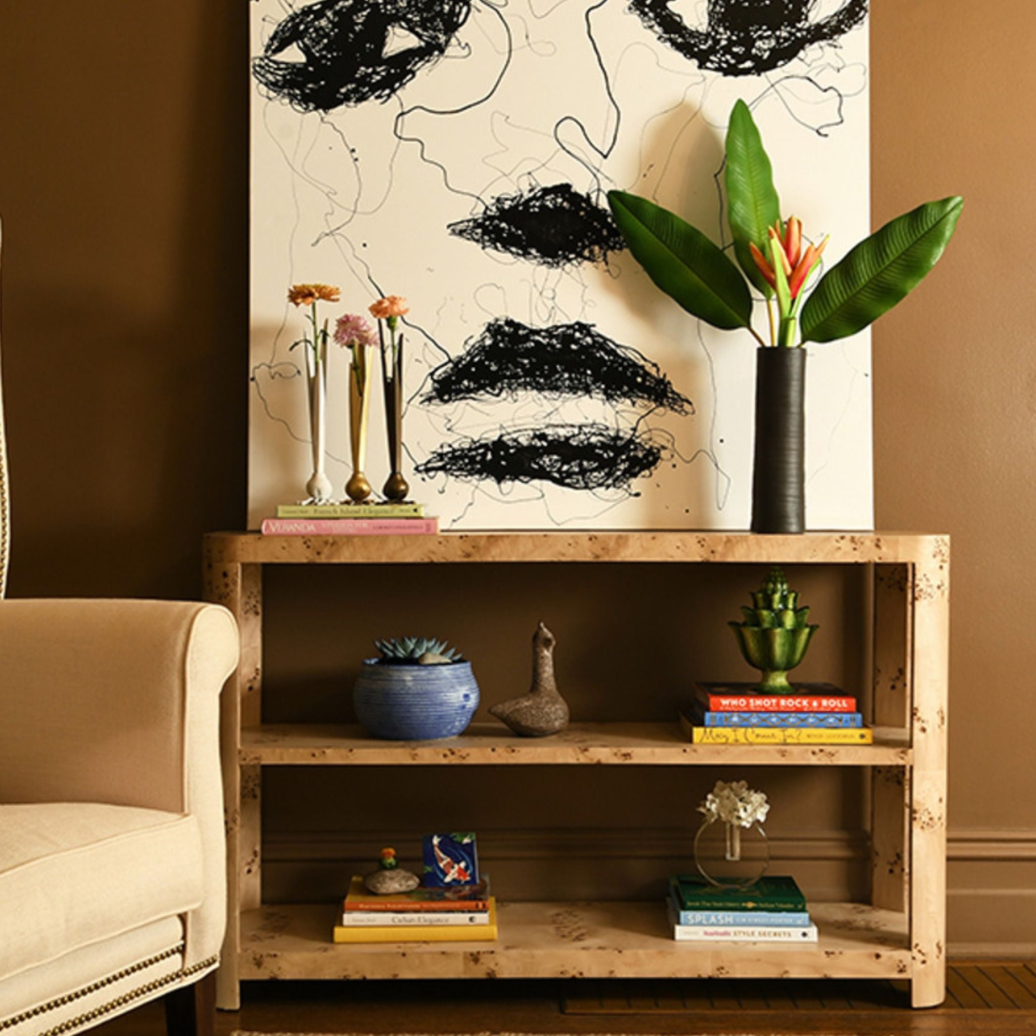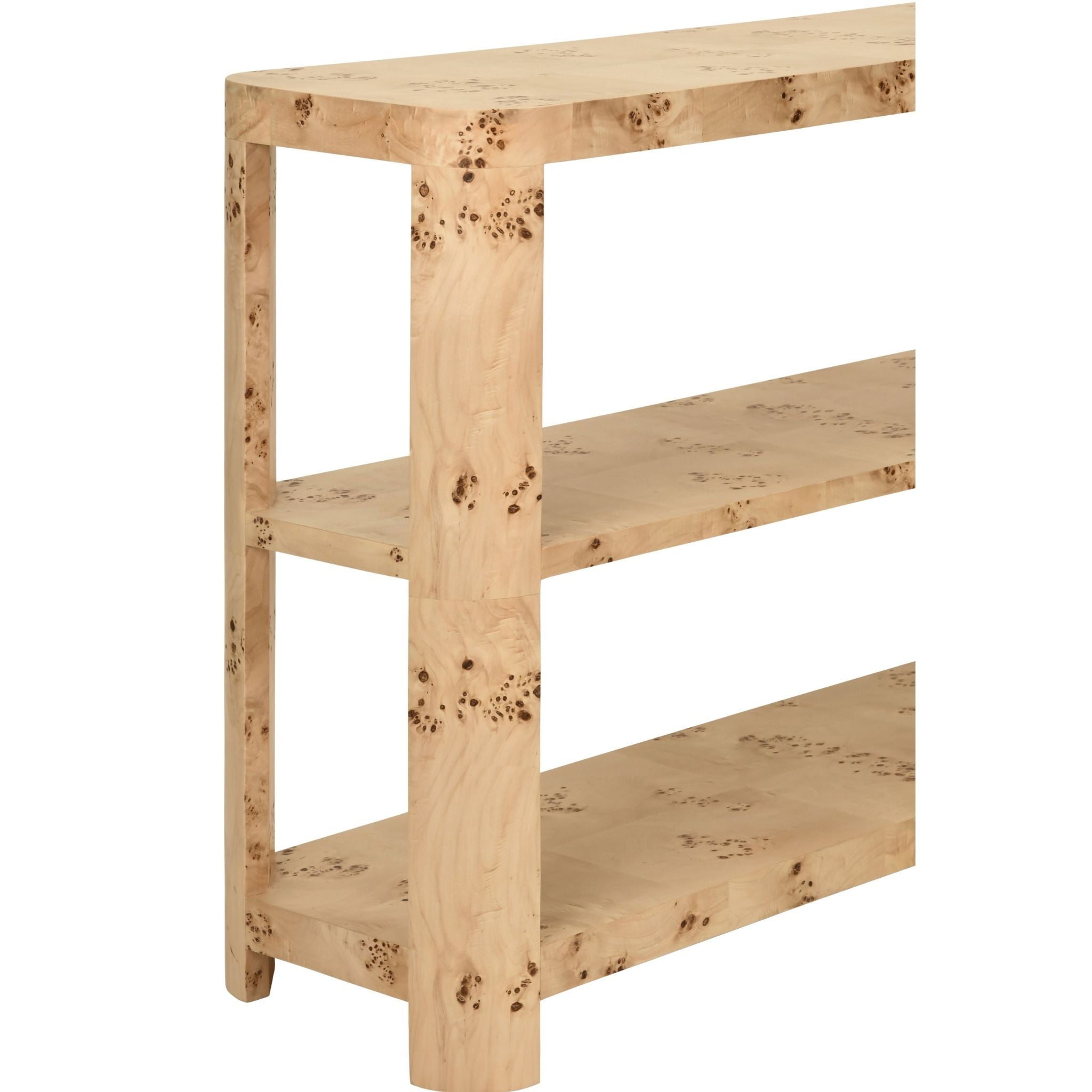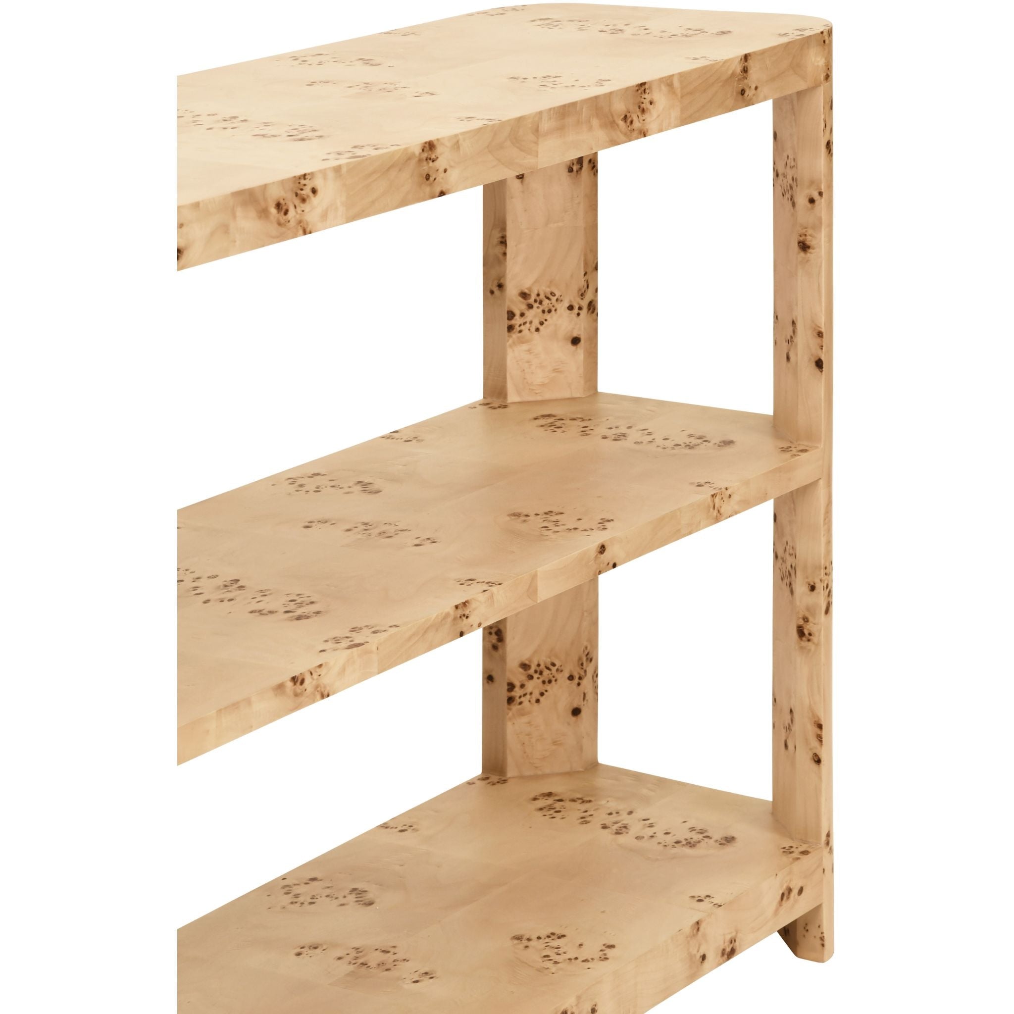 Bring refined texture and modern elegance to your space with the Emery Three-Tier Console, beautifully crafted in rich matte burl wood. Its softly curved silhouette and open multi-shelf design offer both sculptural appeal and practical storage, making it a striking yet versatile statement piece for any room.