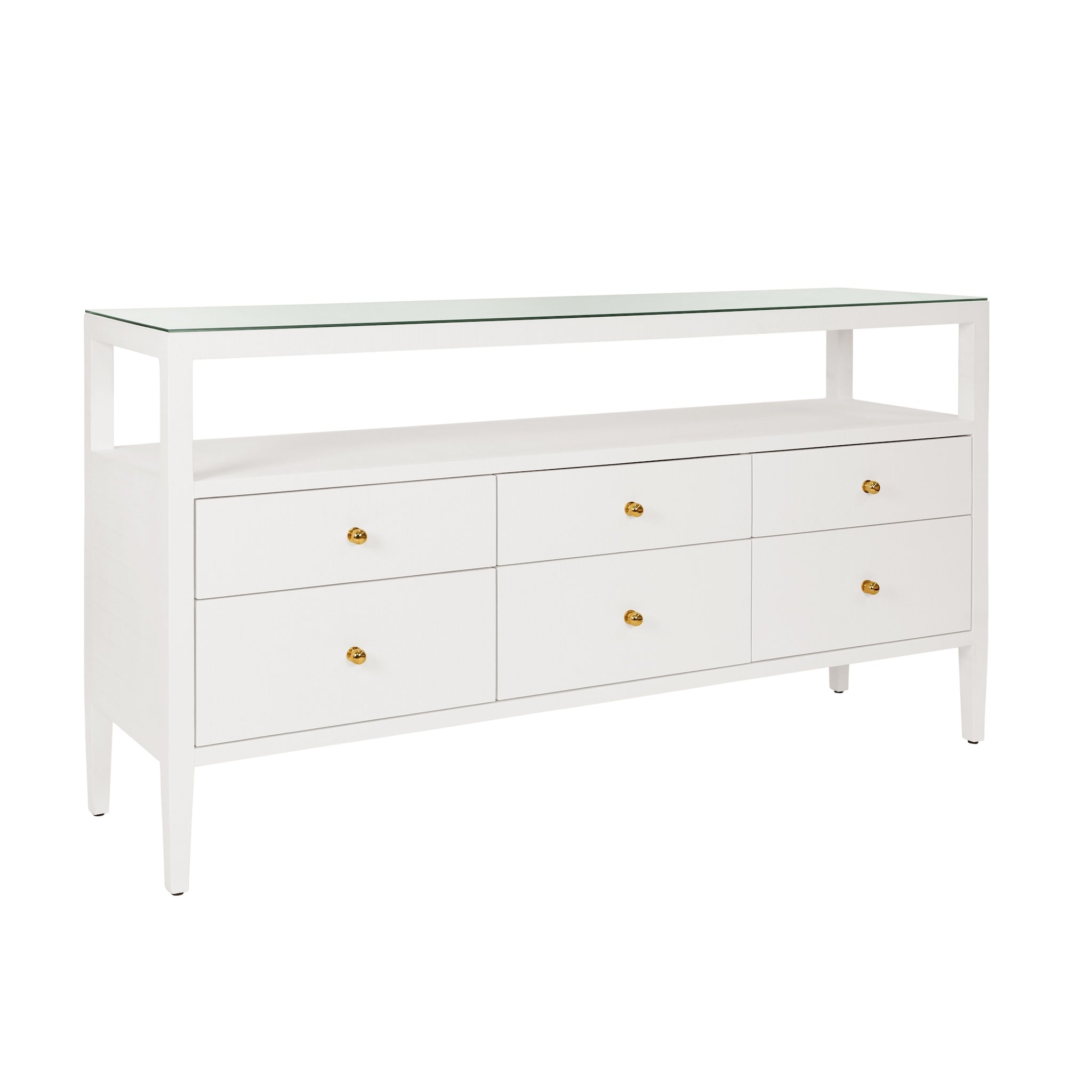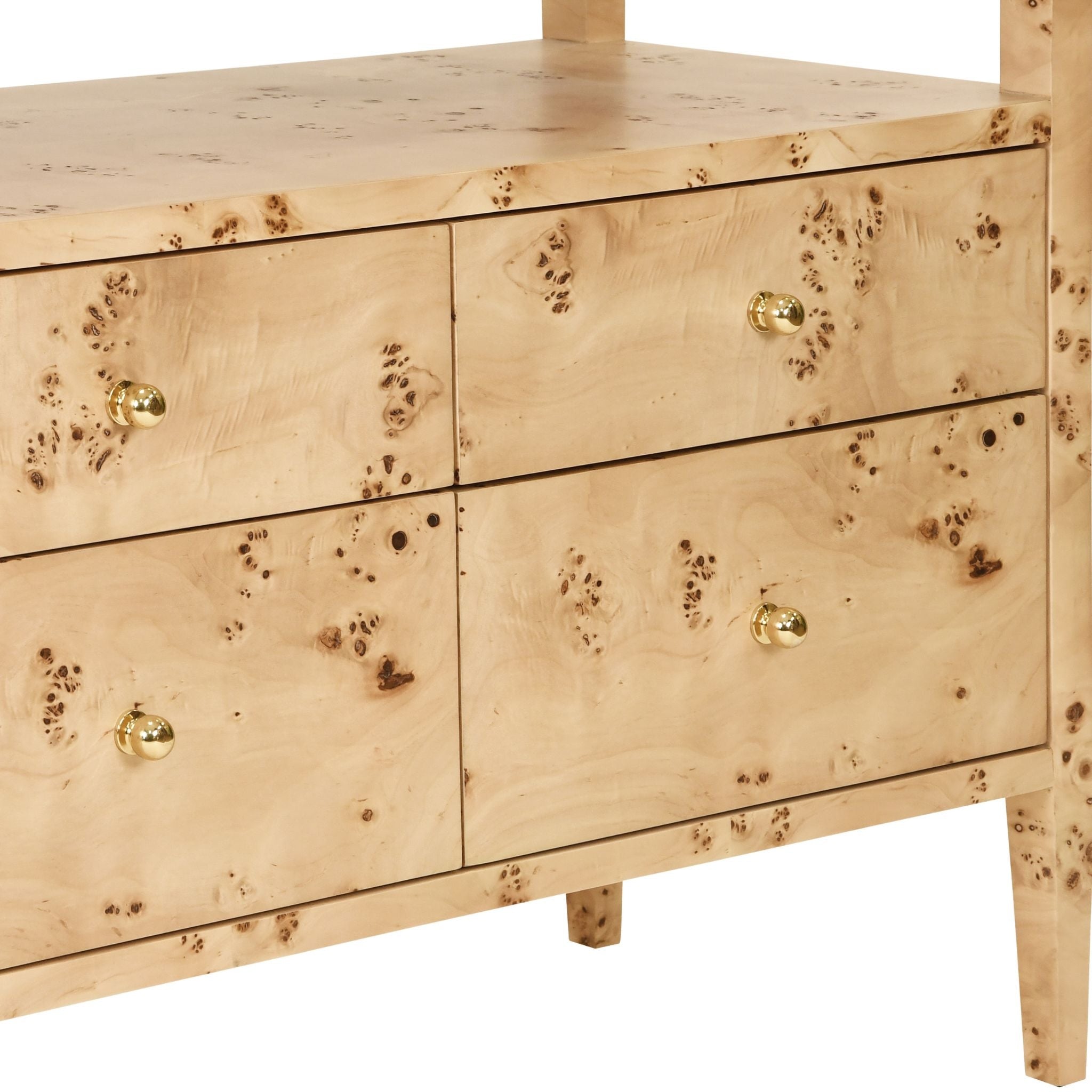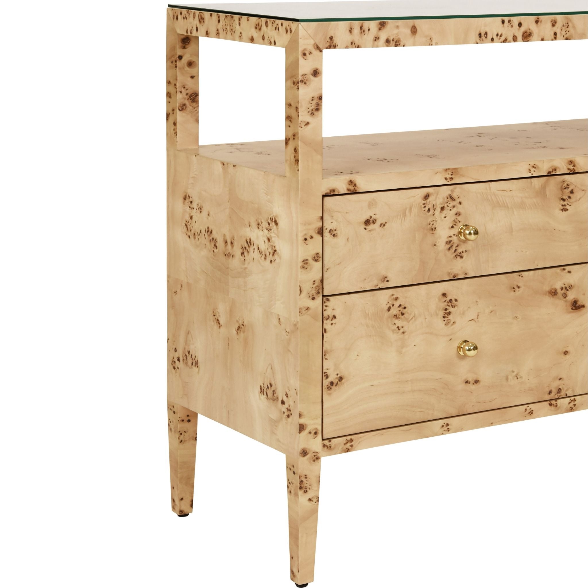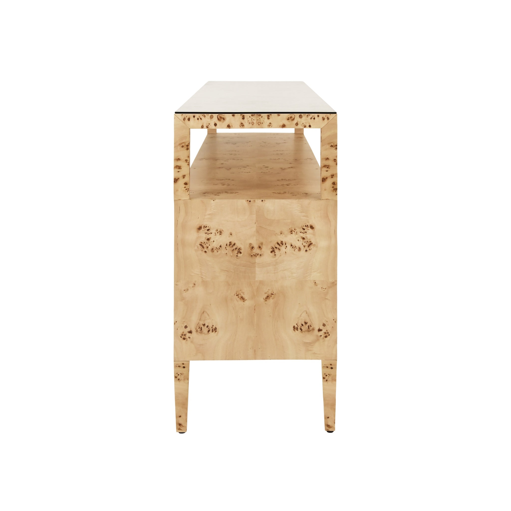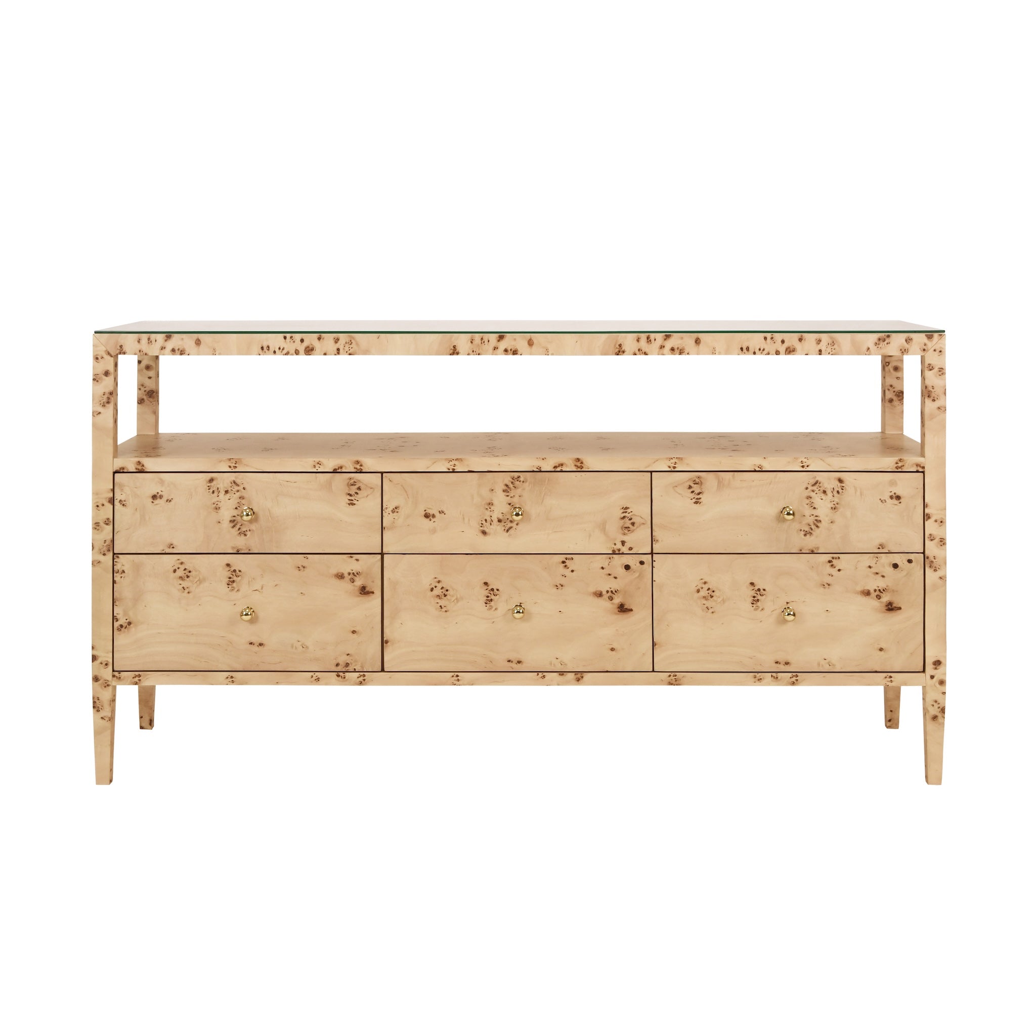 The Jordan Console showcases six spacious drawers and an open shelf, all wrapped in rich burl wood and finished with polished brass knobs and a sleek glass top. Its refined design and generous storage make it a standout piece that brings warmth, texture, and sophistication to any space.