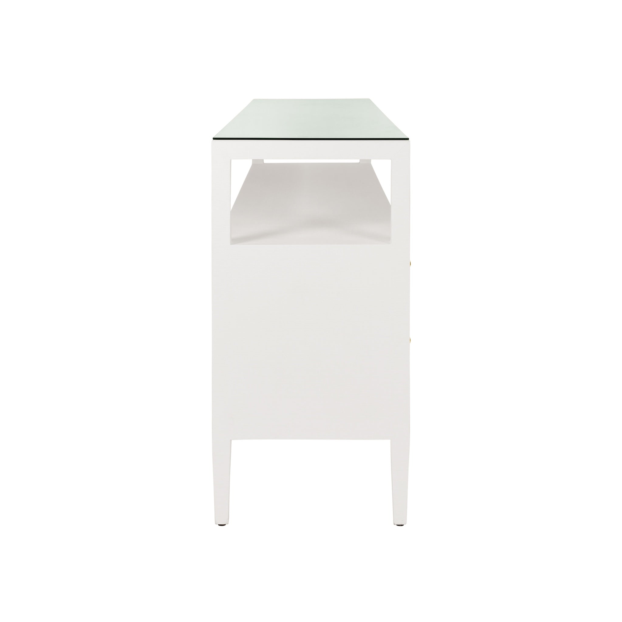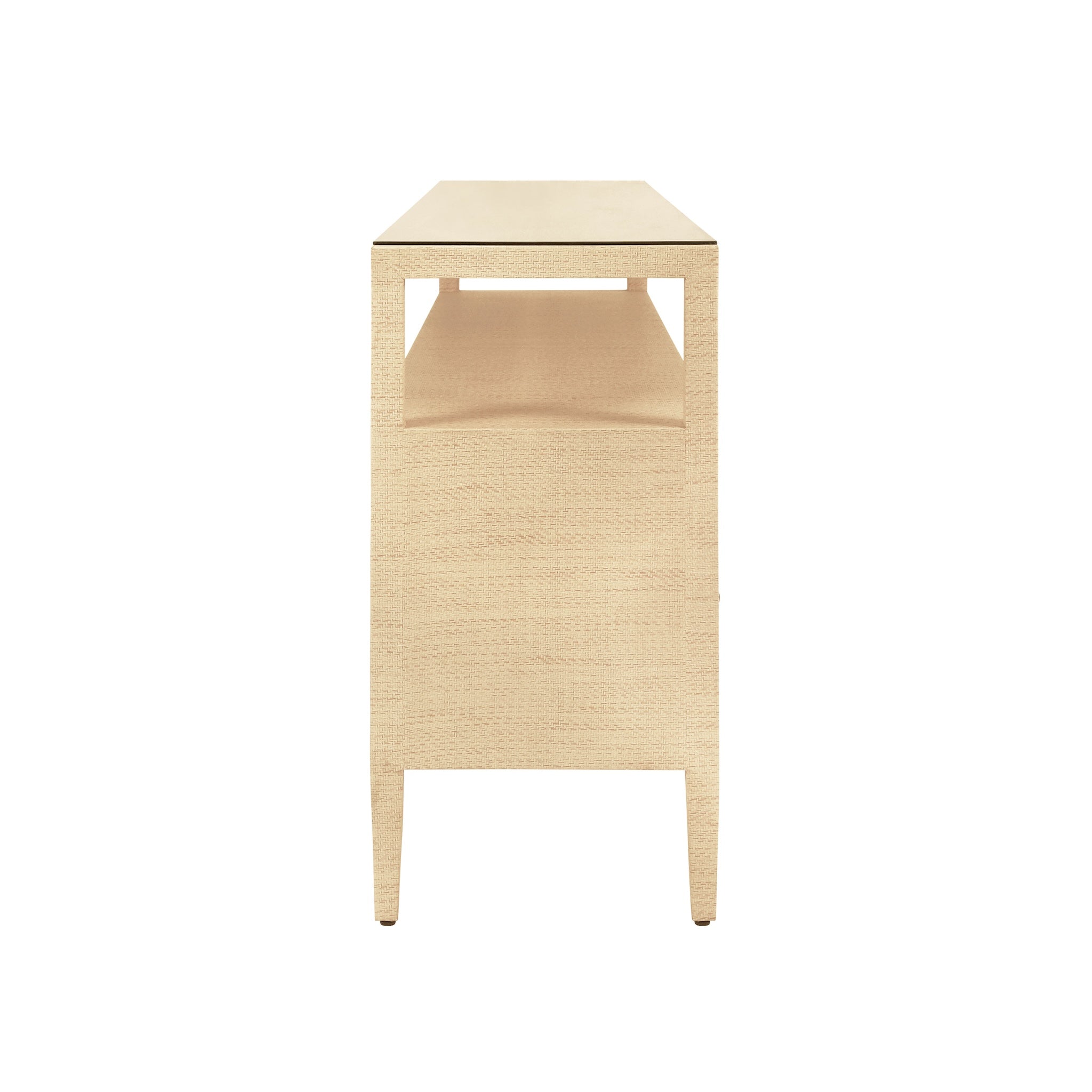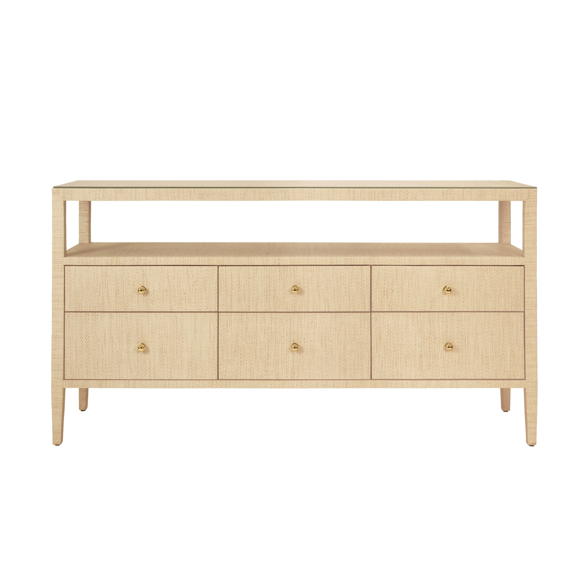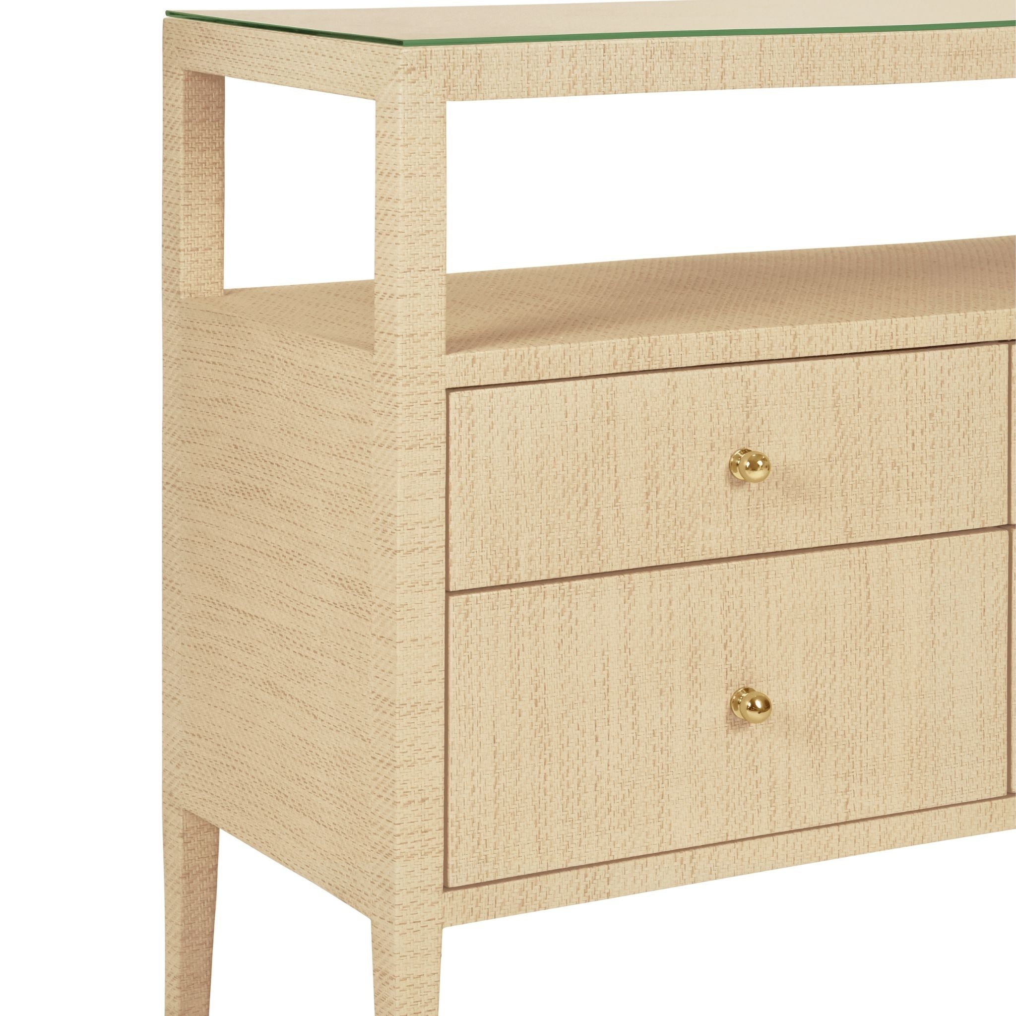 The Jordan Console showcases six spacious drawers and an open shelf, all wrapped in rich burl wood and finished with polished brass knobs and a sleek glass top. Its refined design and generous storage make it a standout piece that brings warmth, texture, and sophistication to any space.